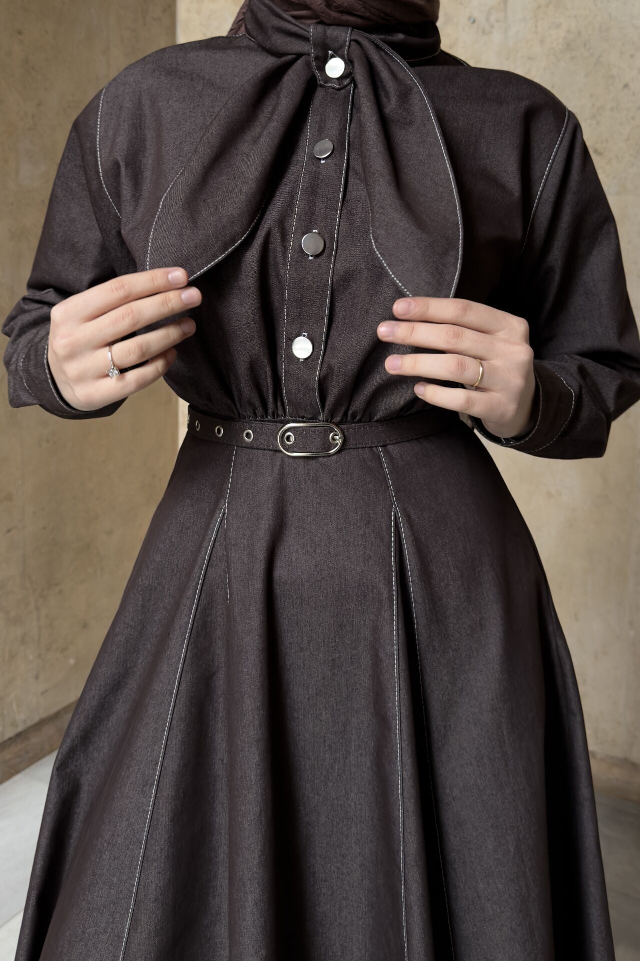 Acı Kahve Fular Yaka Detaylı Kot Elbise