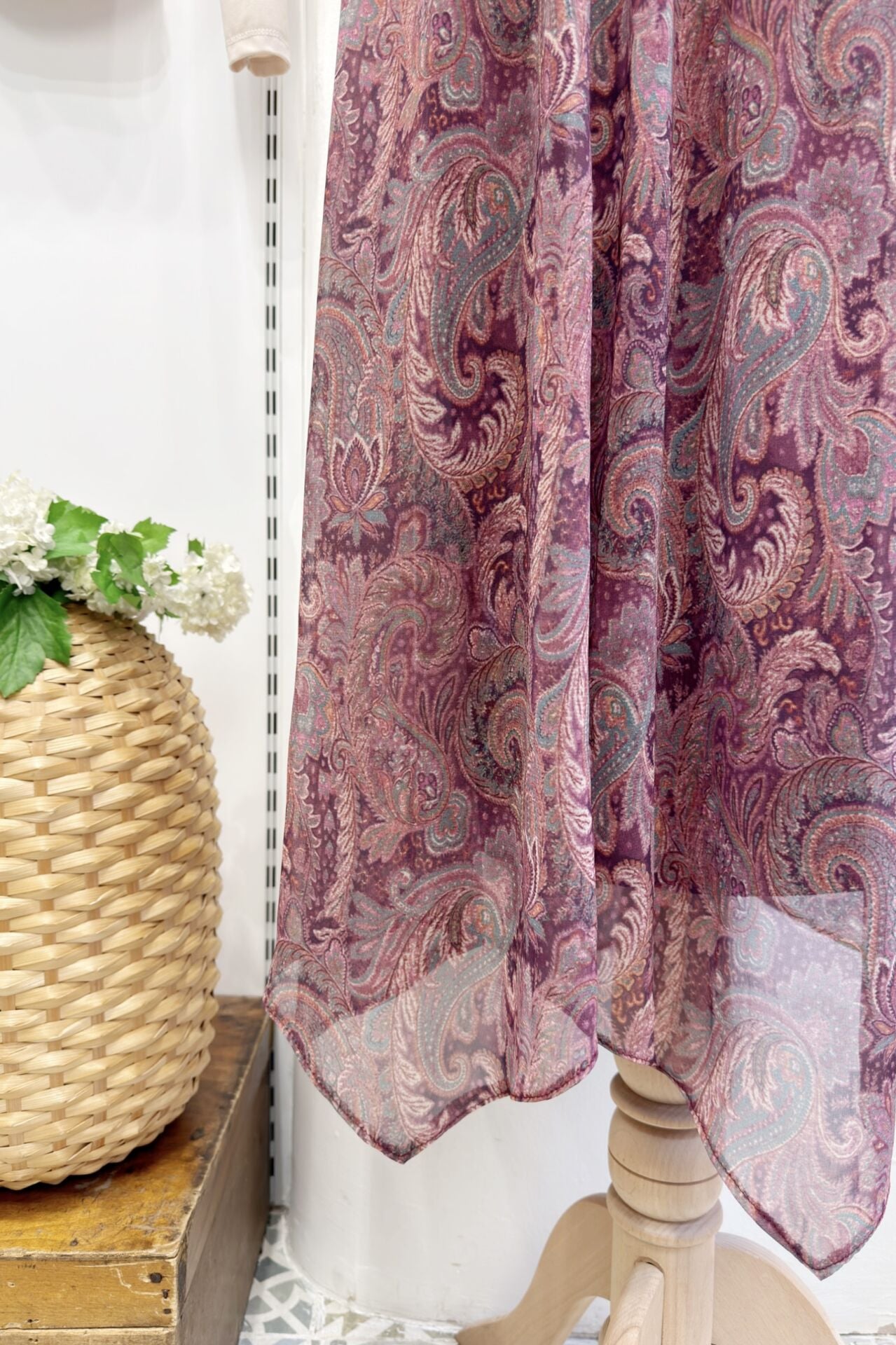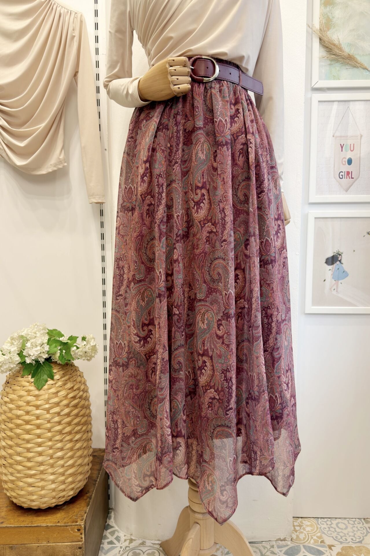 Asimetrik Kesim Mürdüm Şal Desen Şifon Etek