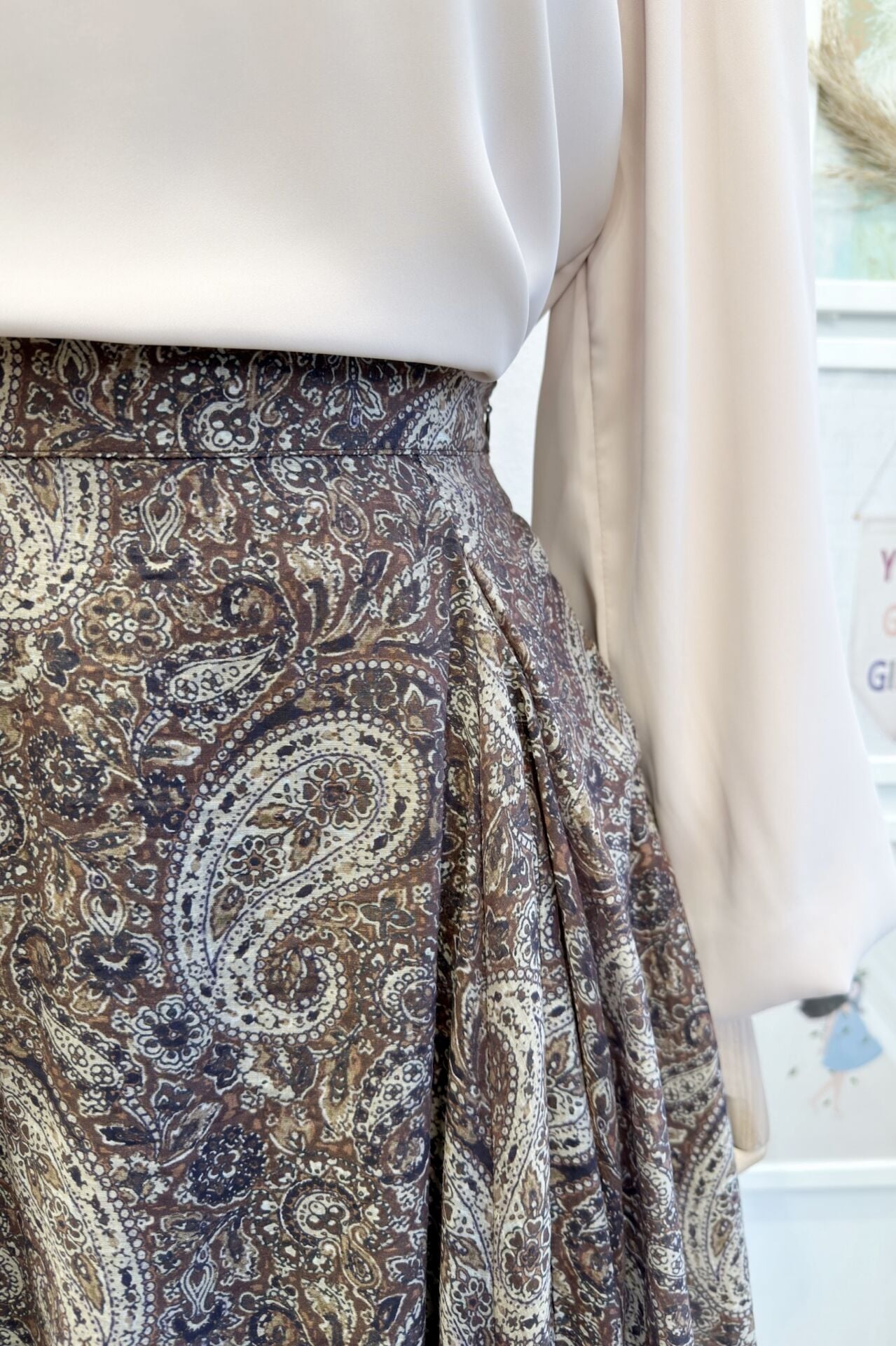 Beli Fermuarlı Kaşmir Desenli Kahverengi Şifon Etek