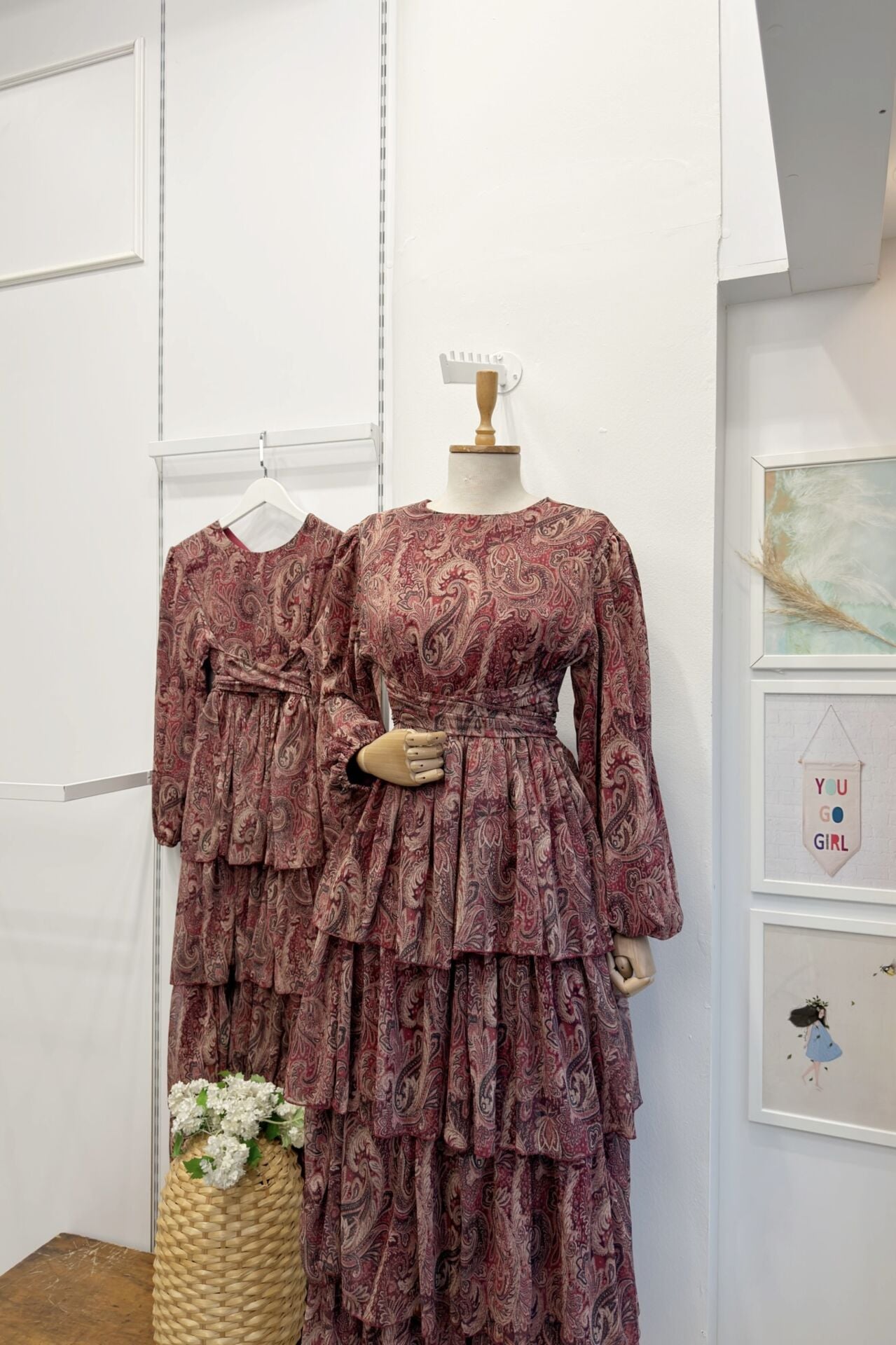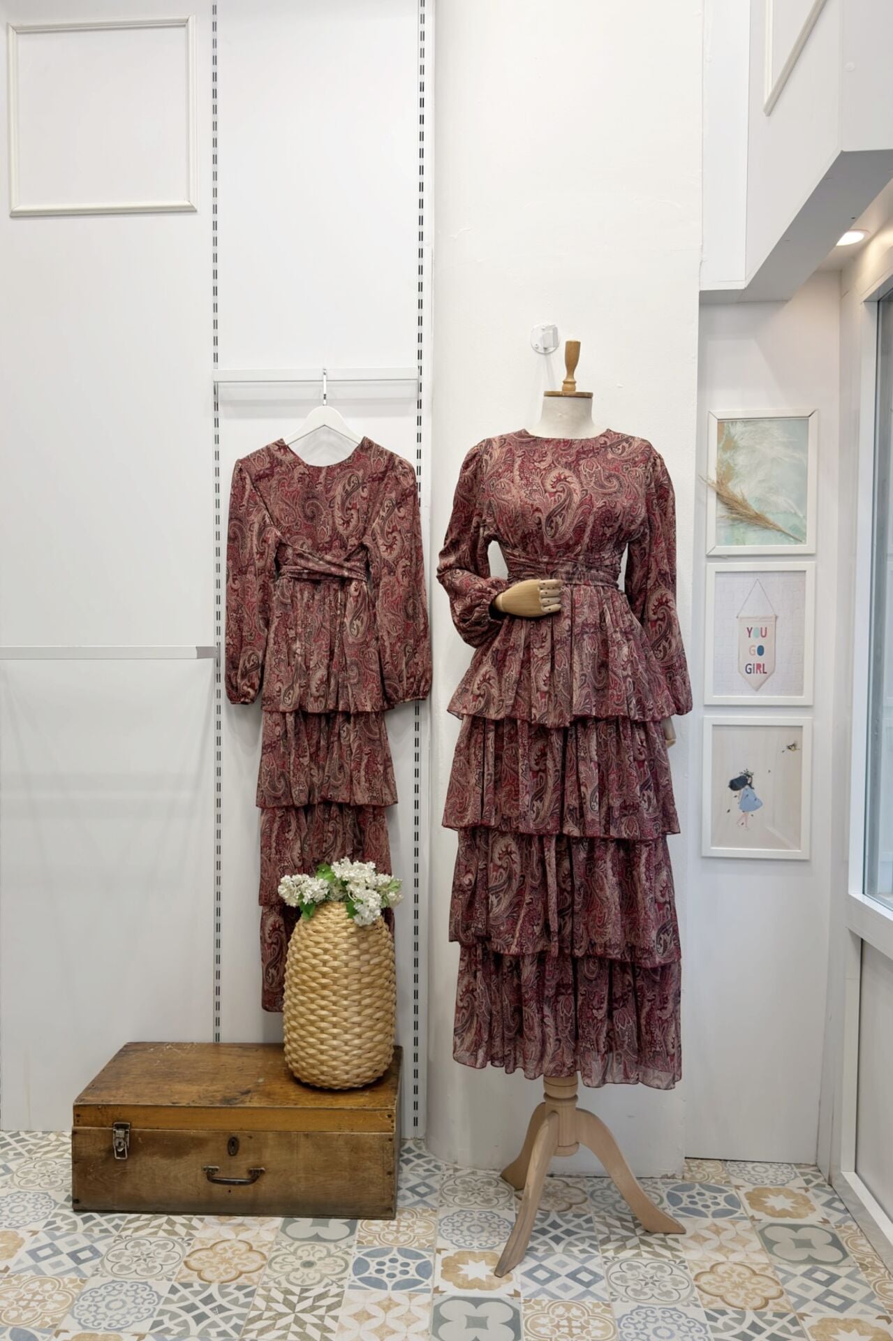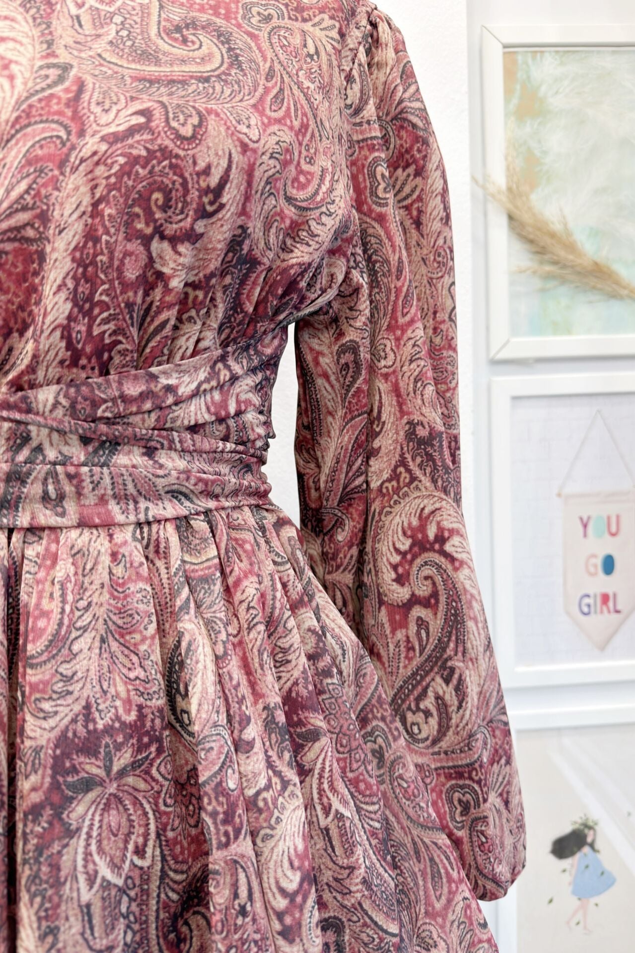 Bordo Şal Desenli Kat Kat Elbise