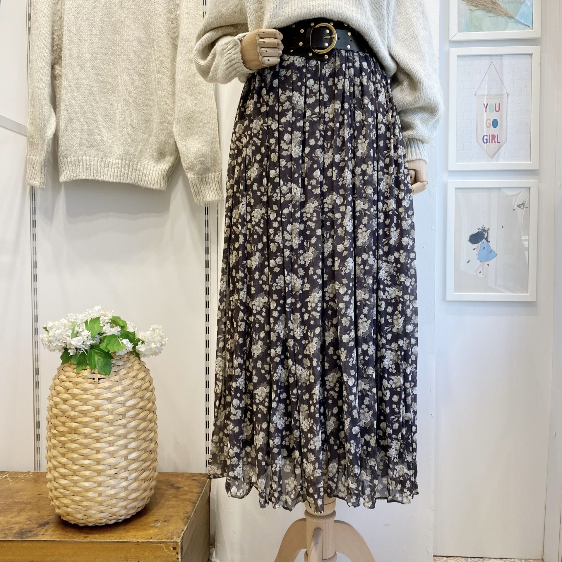 Çıtır Çiçek Desenli Haki Yeşili Şifon Etek