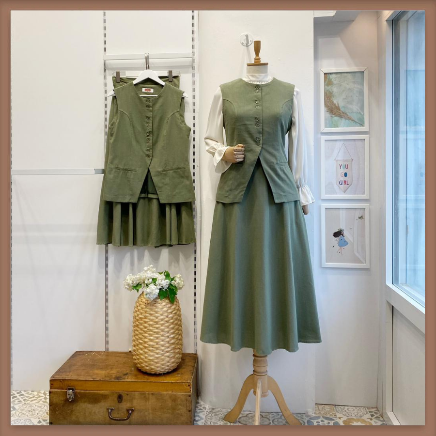 Haki Yeşili Petal Keten Yelekli Takım