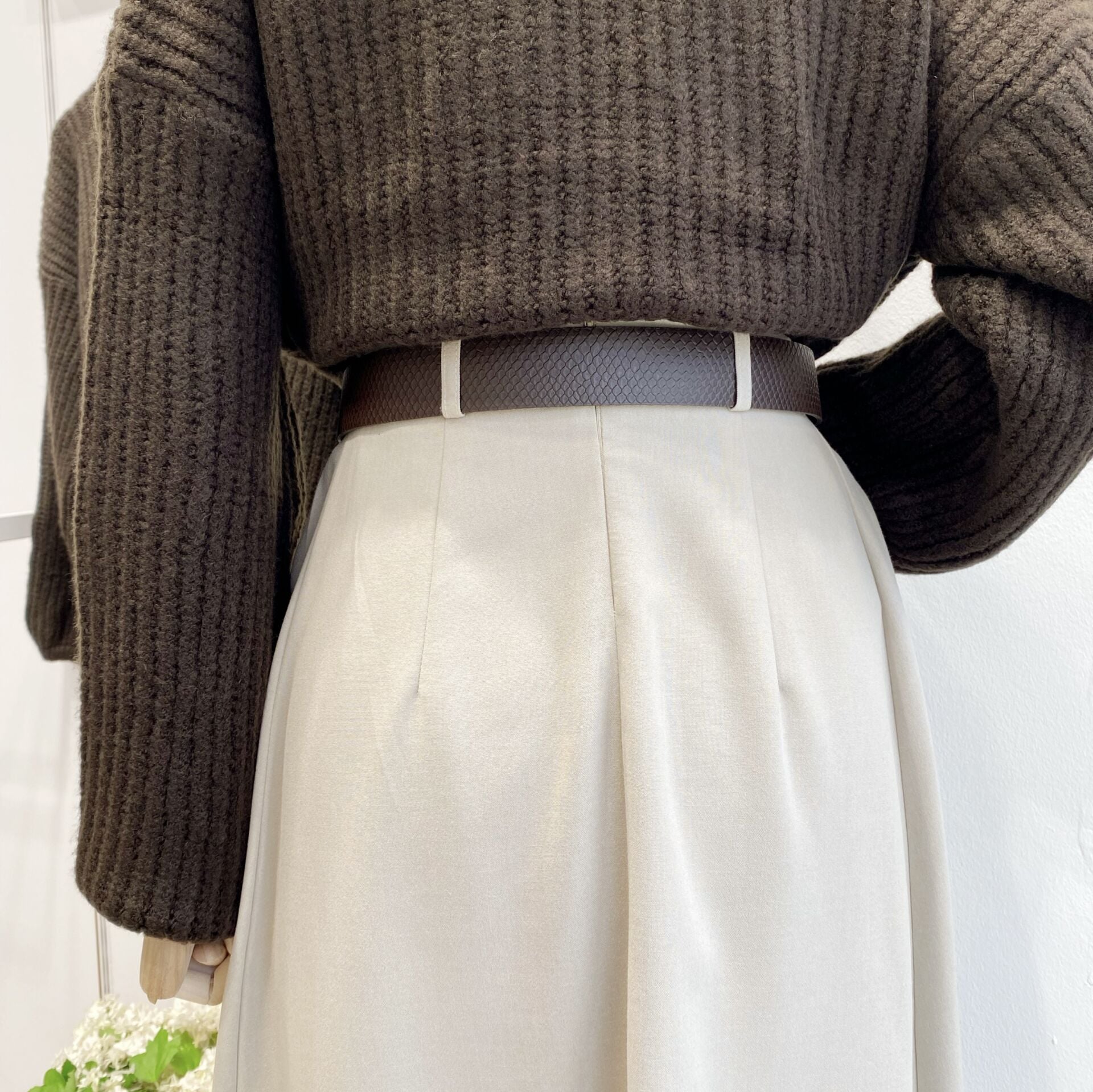 Krem Pileli Kemer Detaylı Poliviskon Etek
