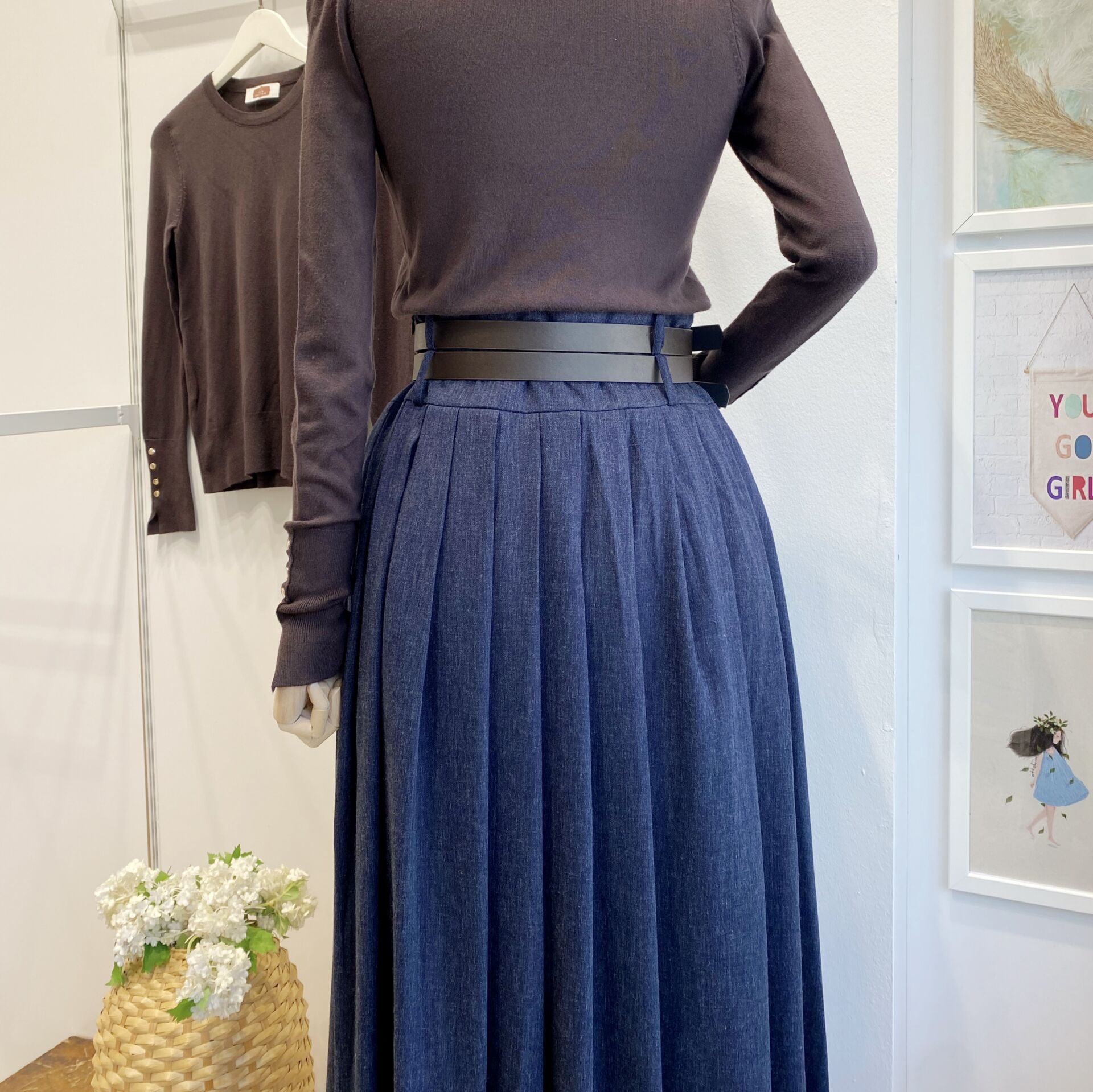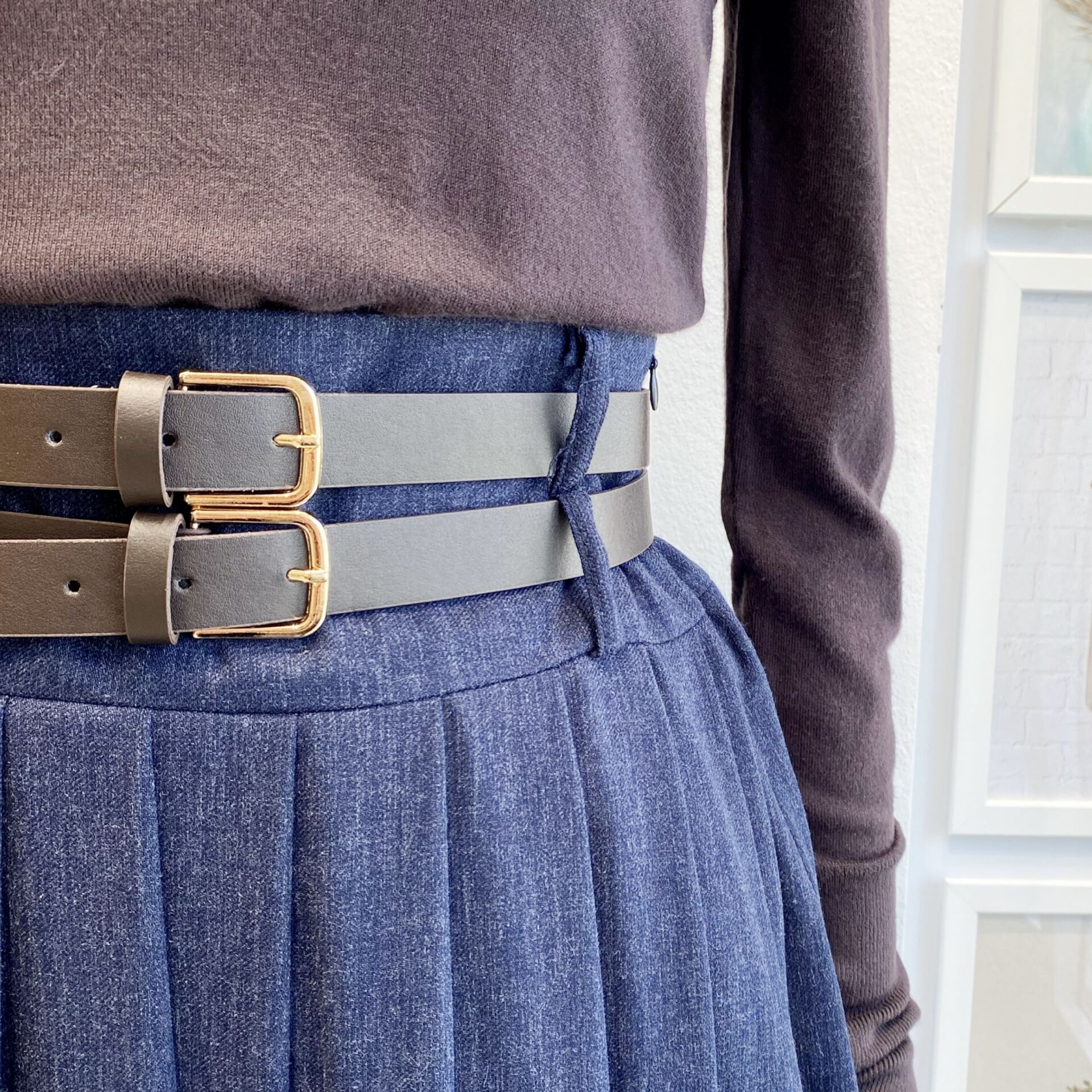 Lacivert Çift Kemerli Yün Efekt Etek