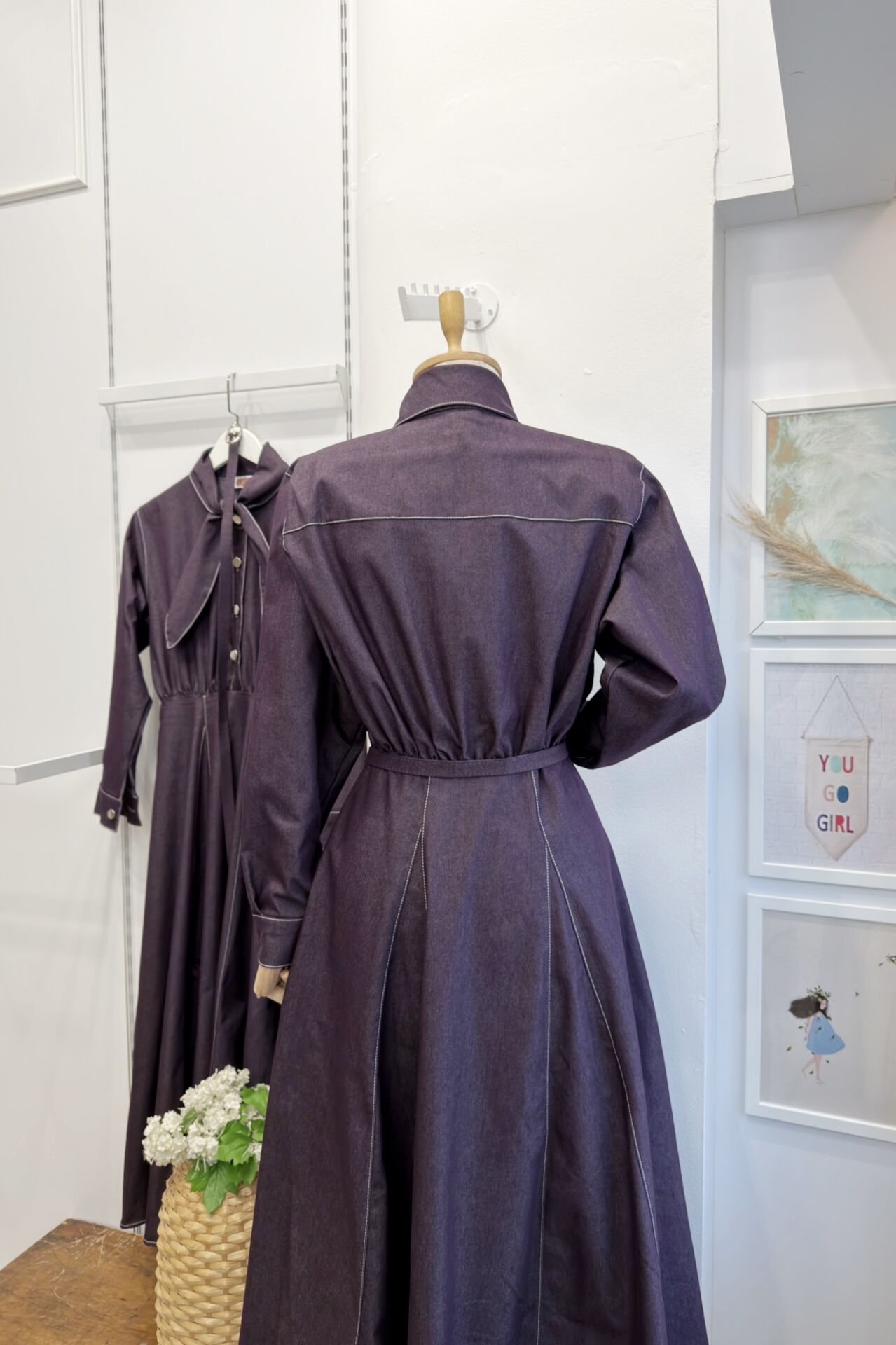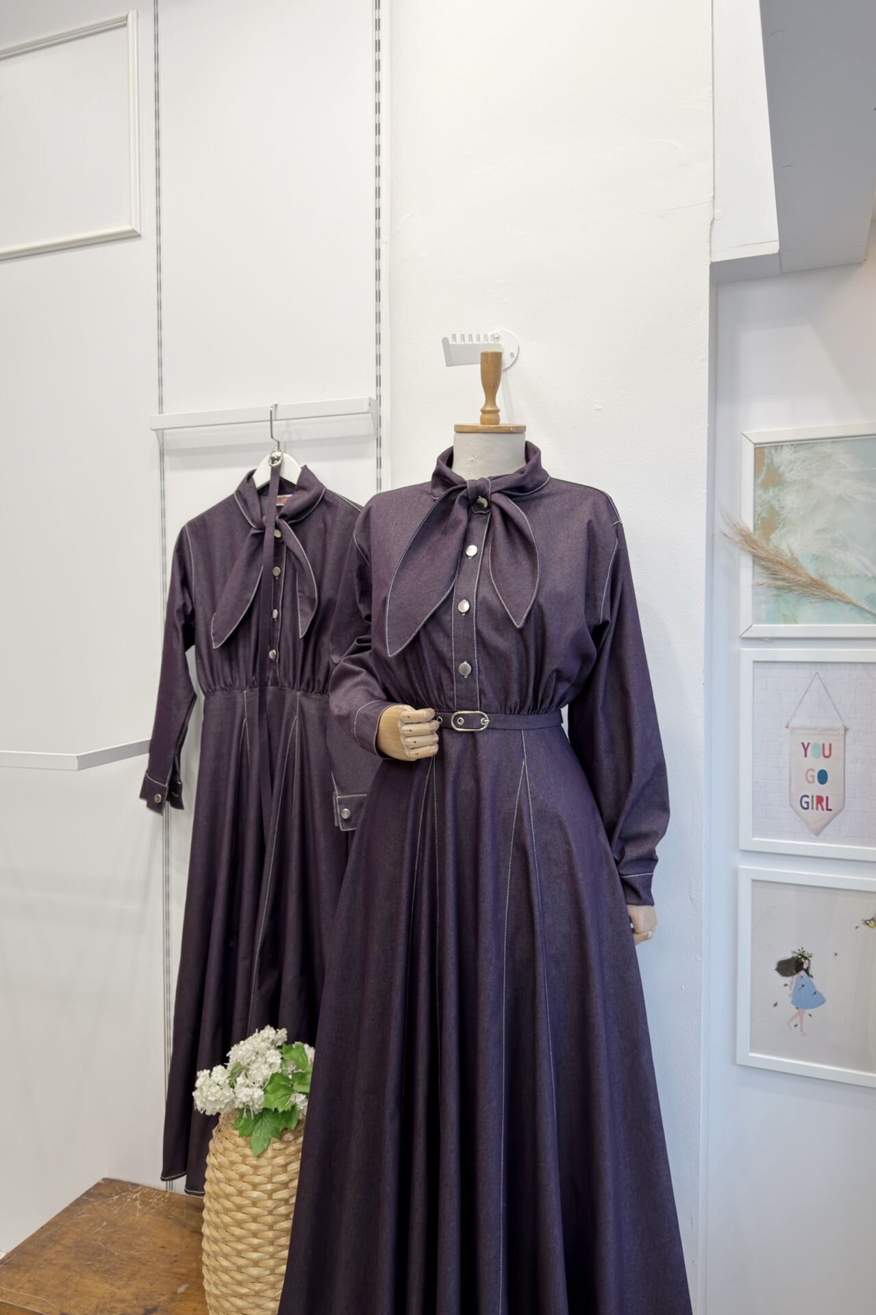 Mürdüm Fular Yaka Detaylı Kot Elbise