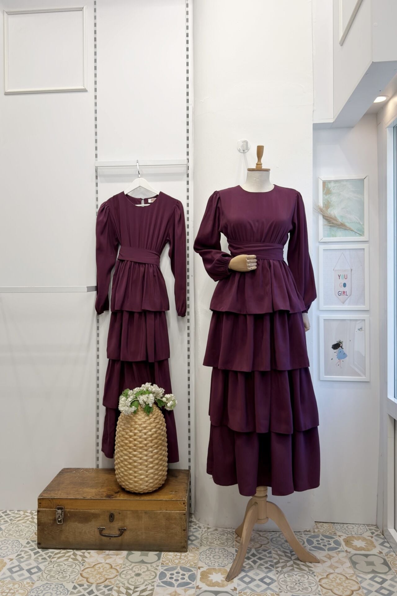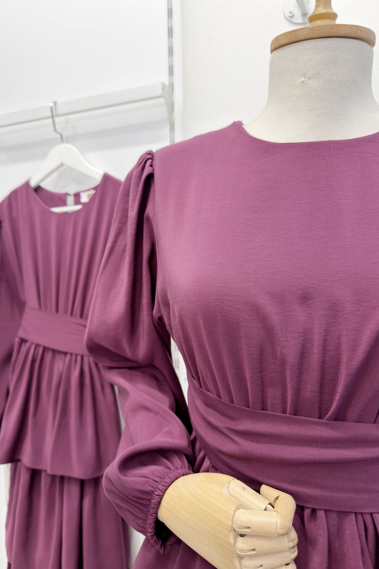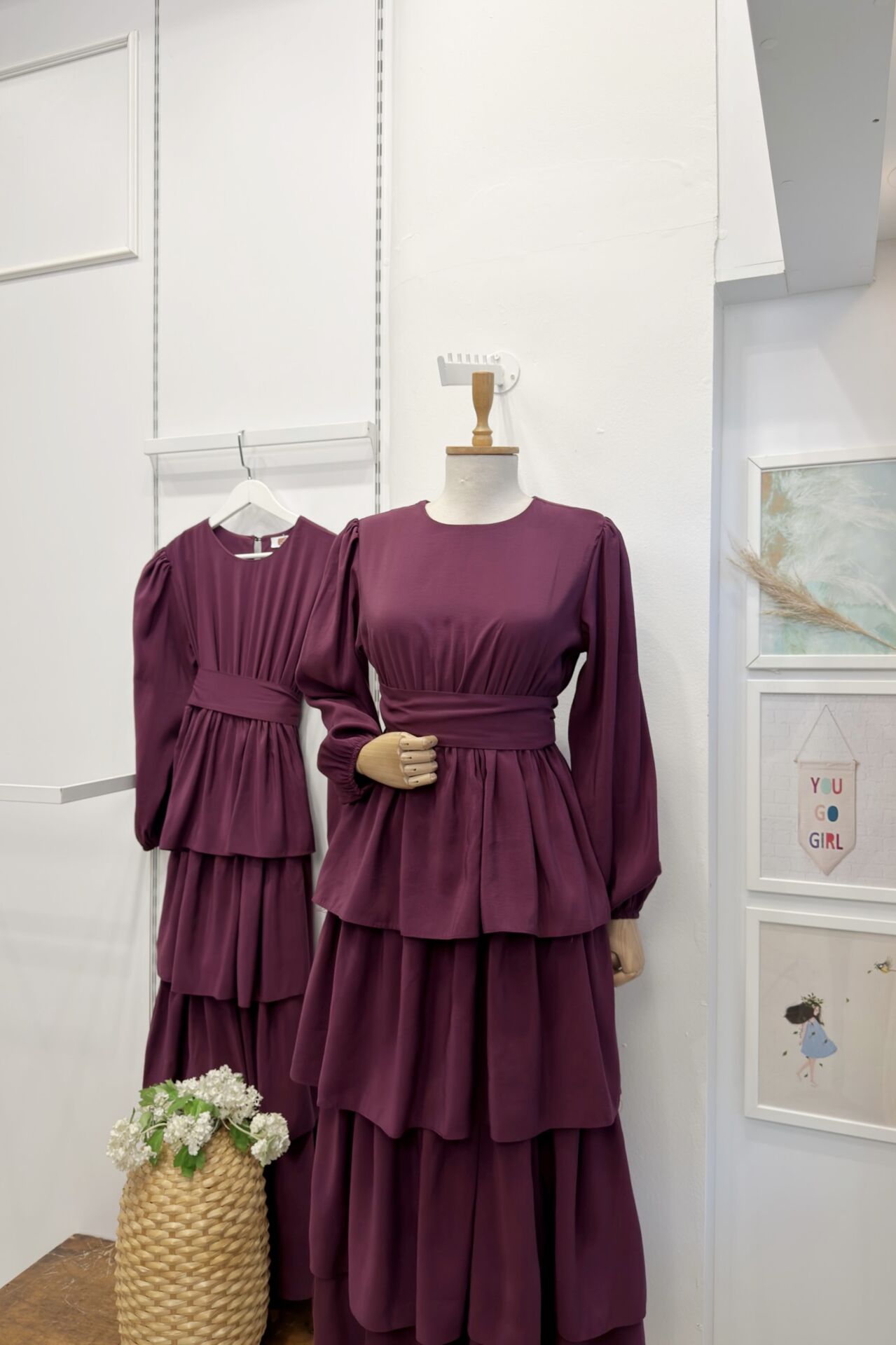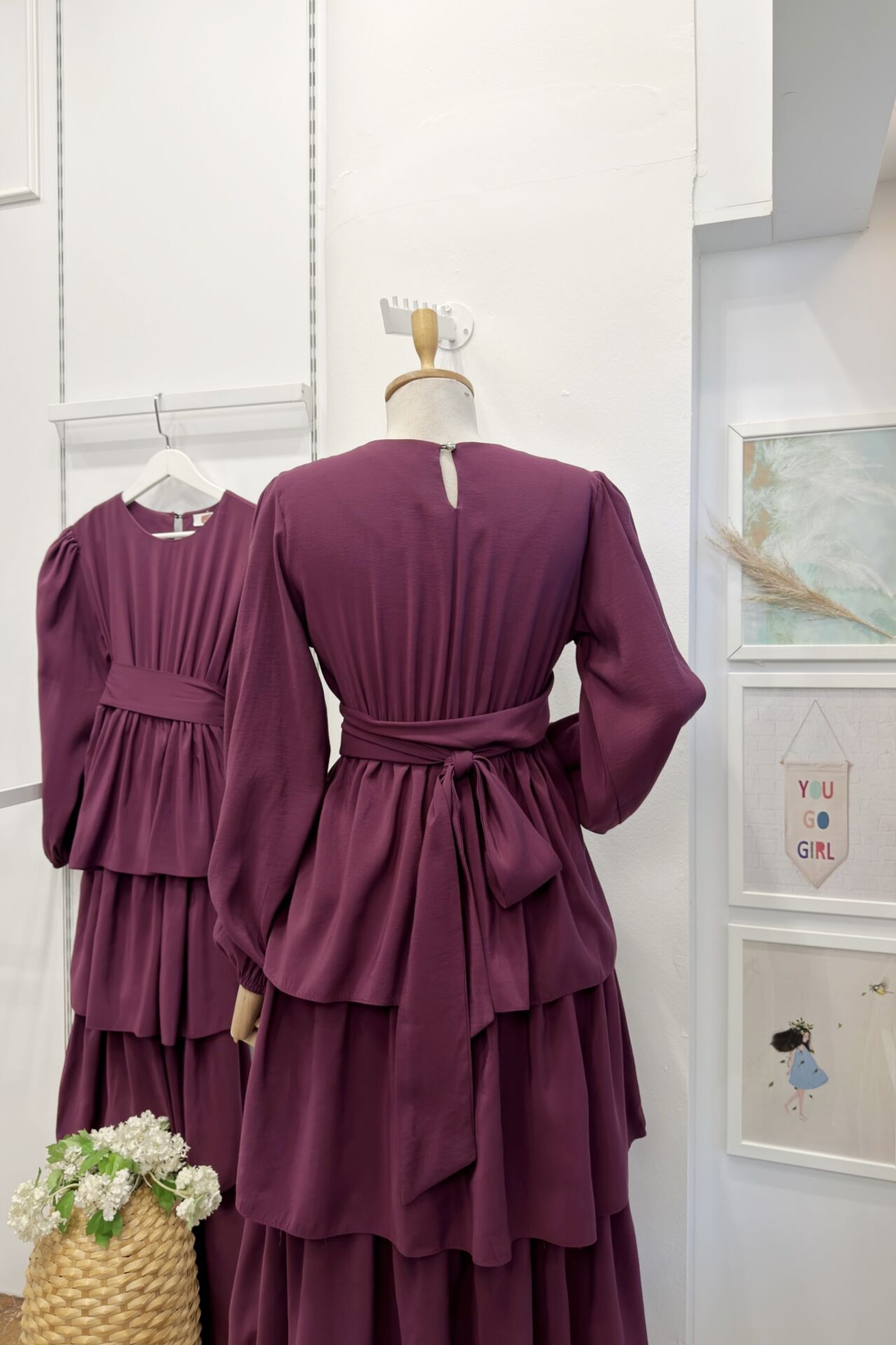 Mürdüm Kuşak Detaylı Penny Kat Kat Elbise