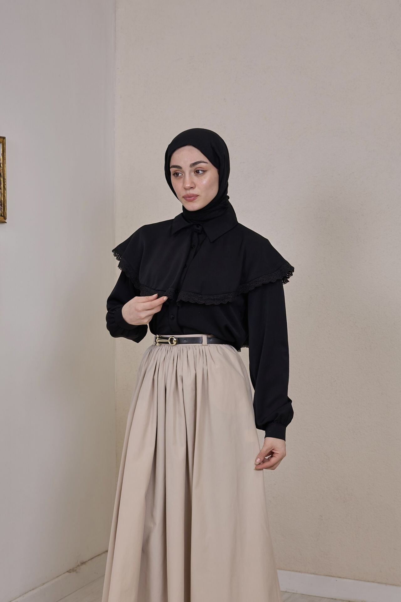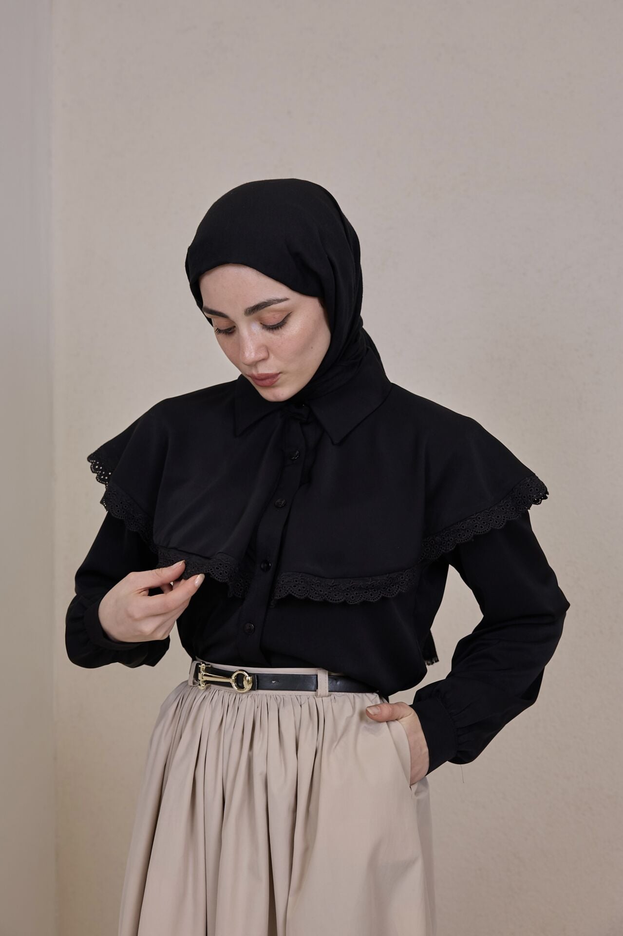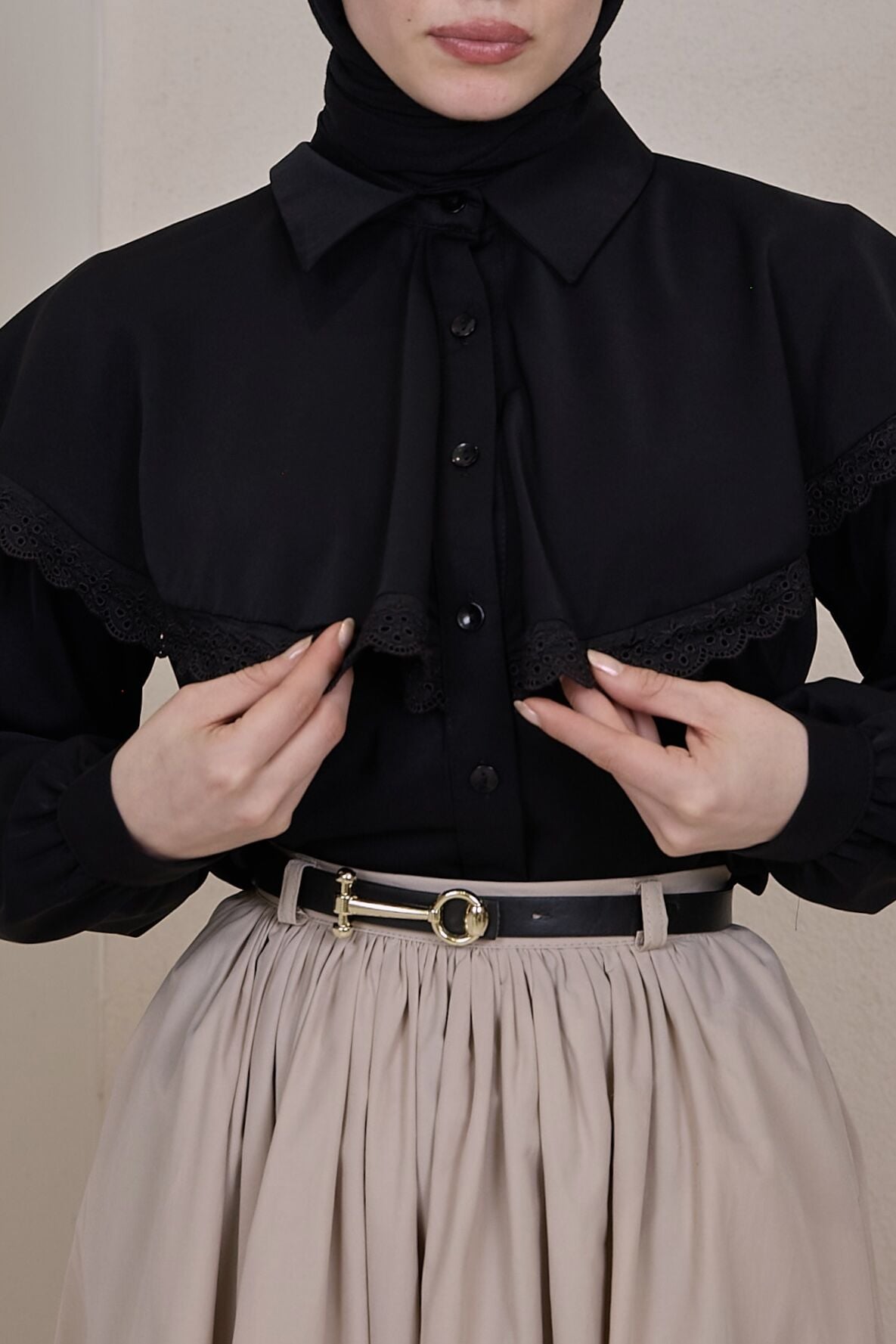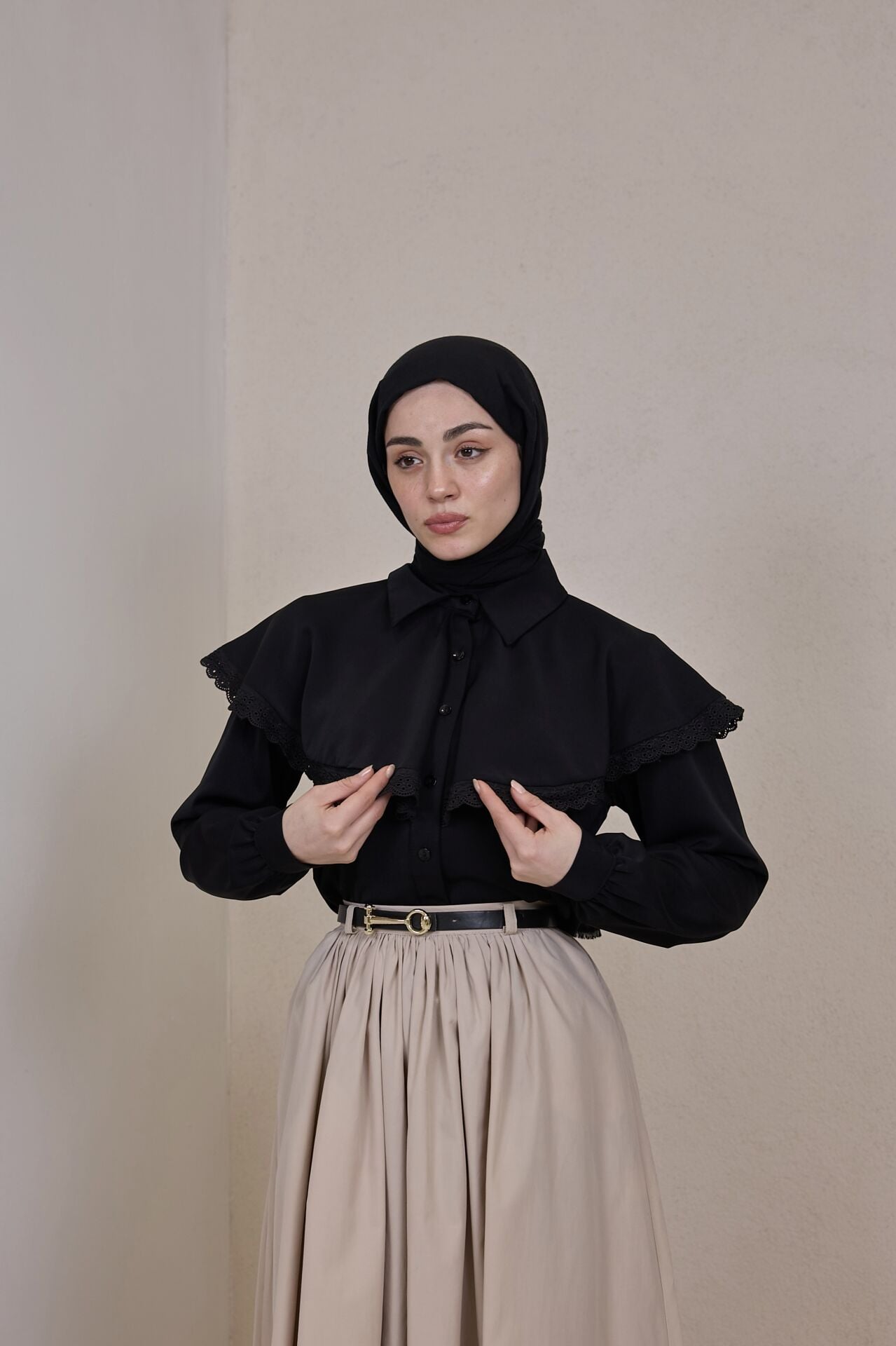 Siyah Fisto Şeritli Pelerin Detaylı Gömlek