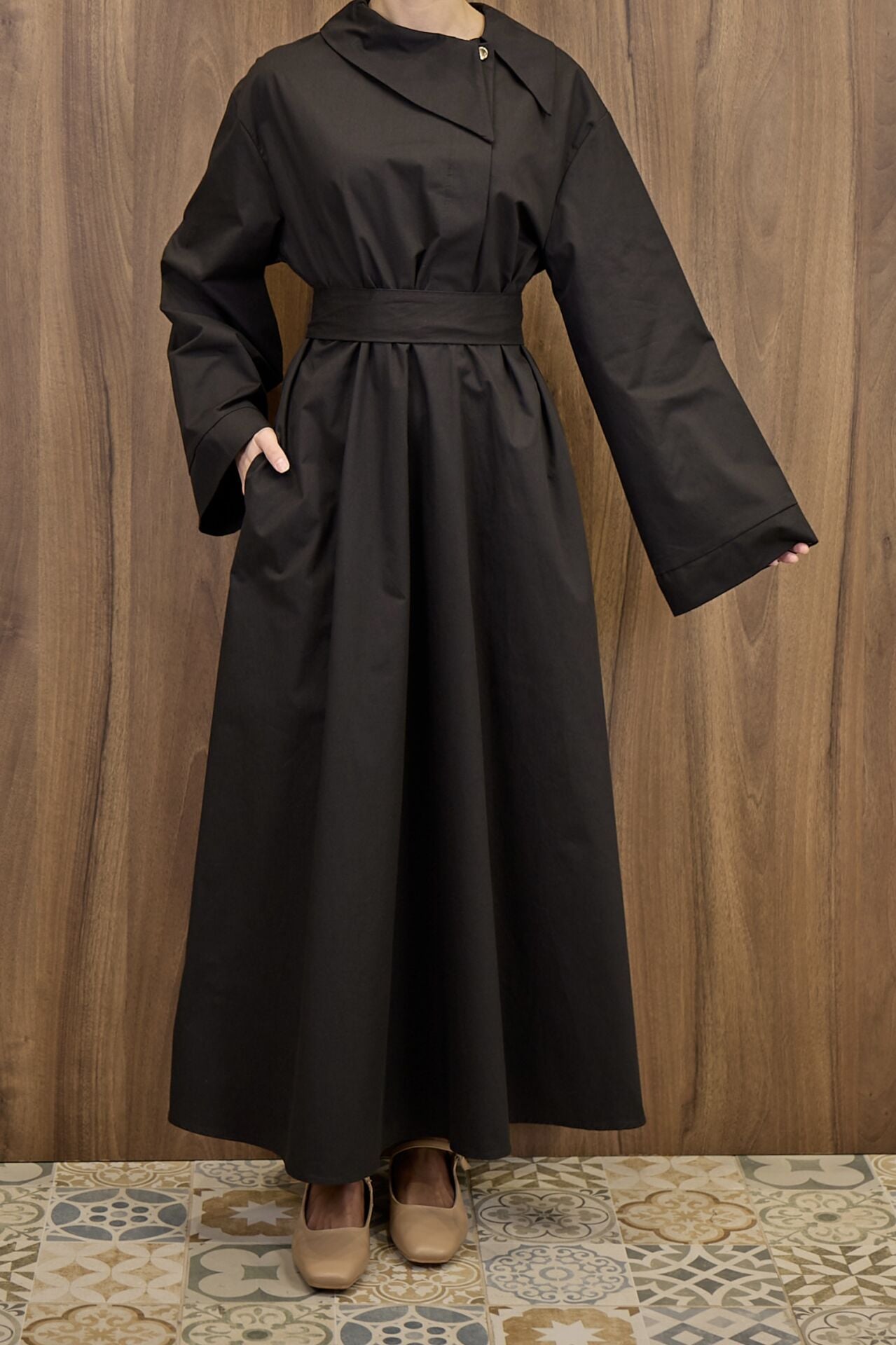 Siyah Yaka Detaylı Poplin Elbise