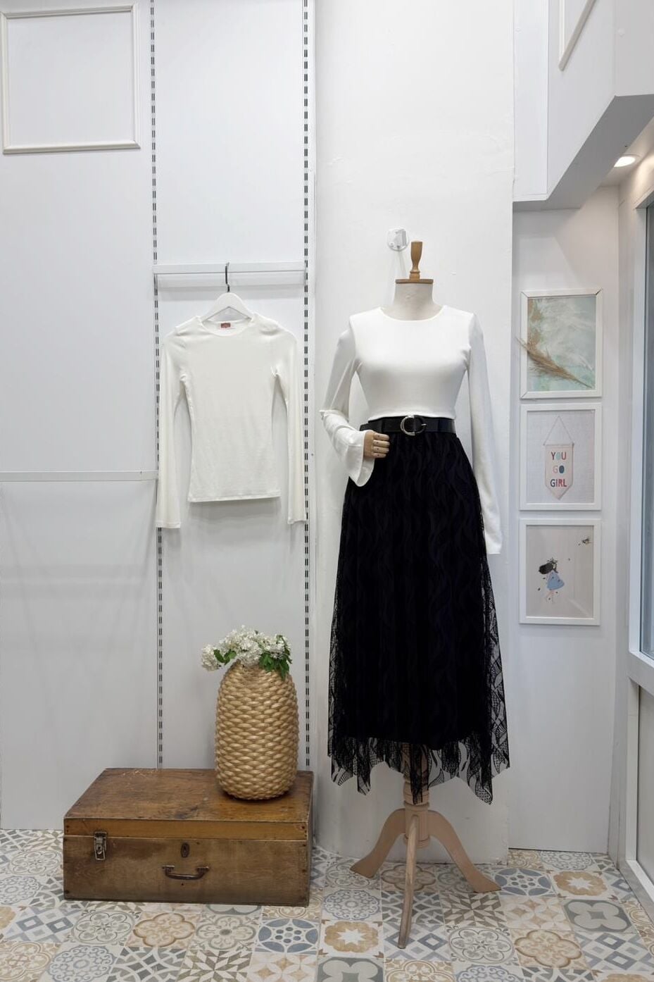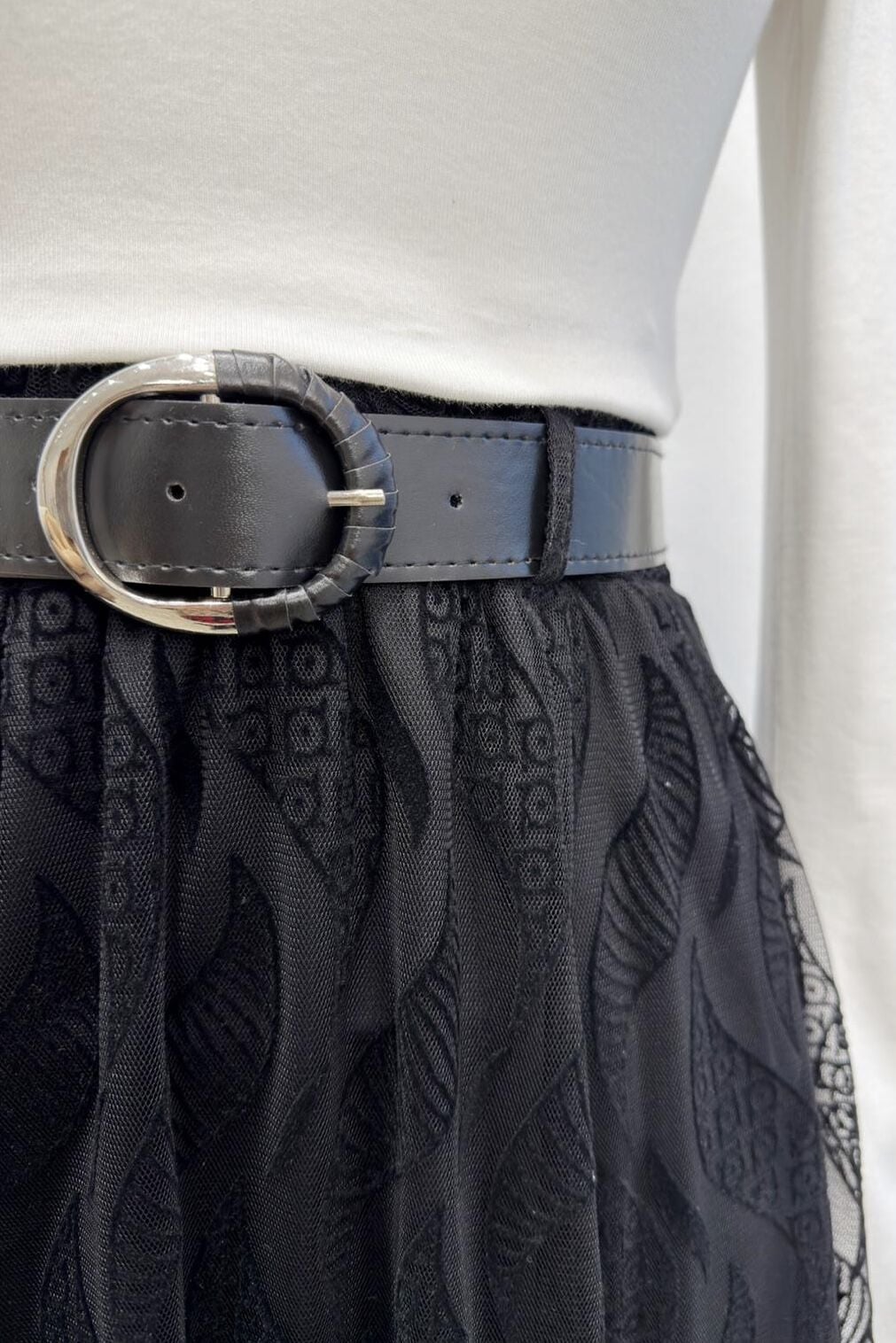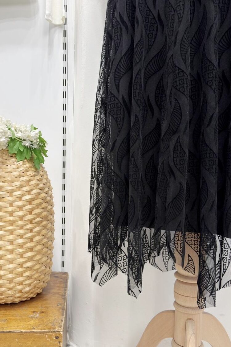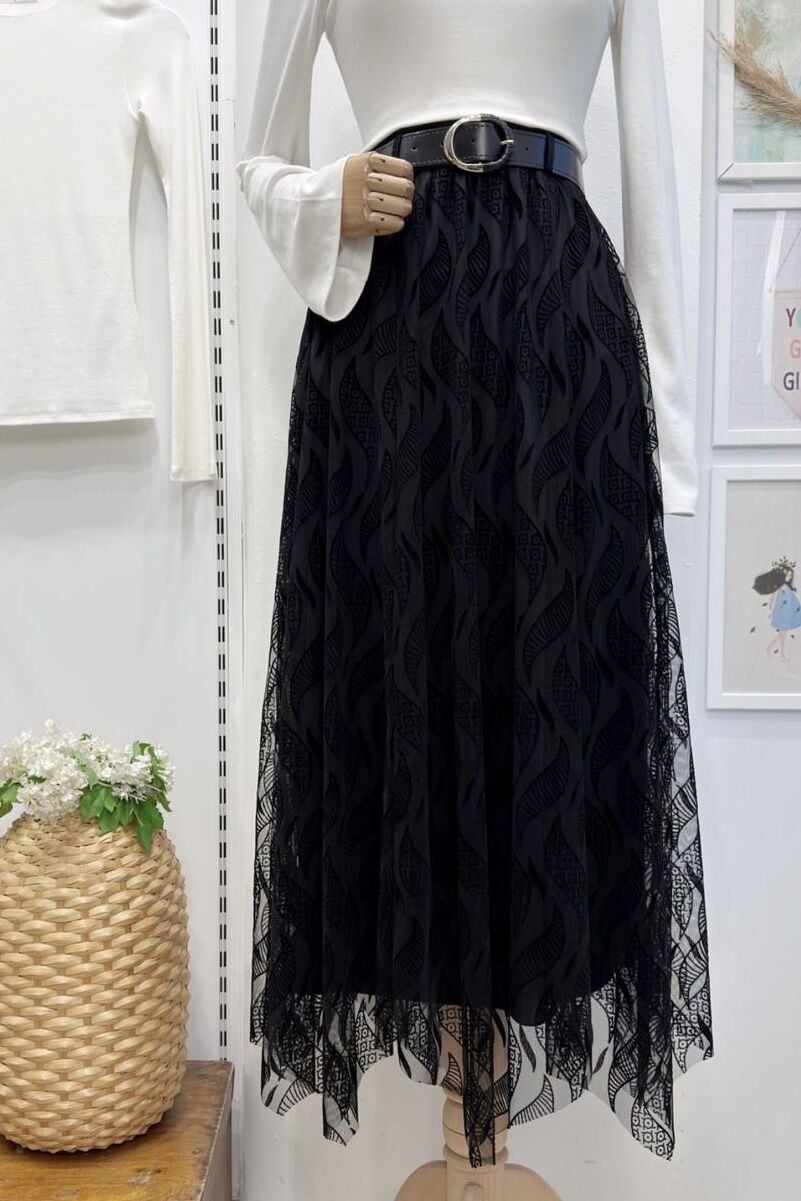 Siyah Yaprak Desenli Flog Baskı Asimetrik Şifon Etek