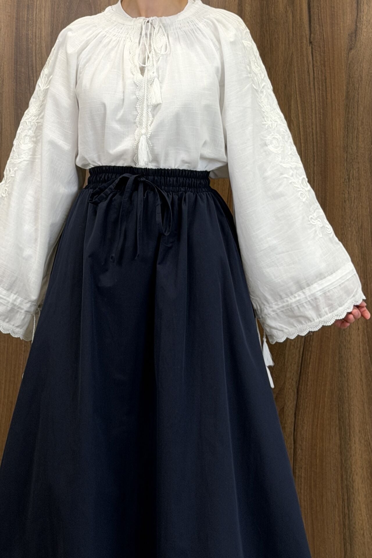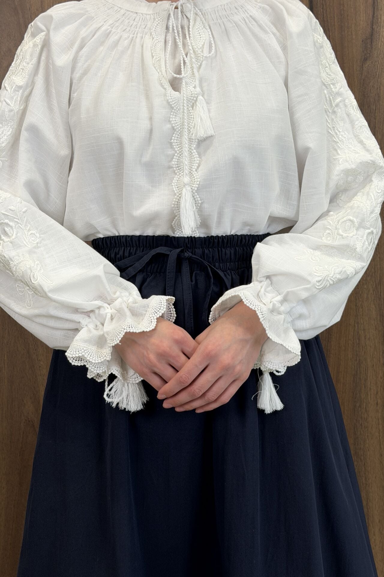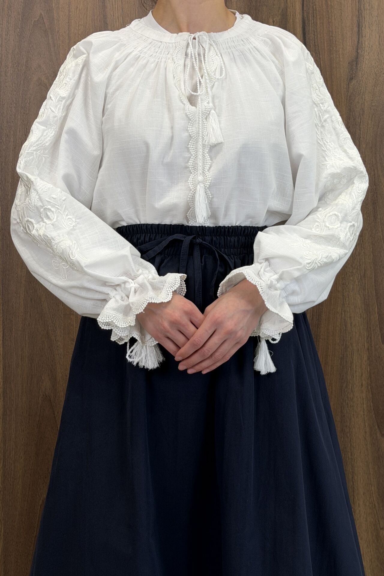 Beyaz Kolu Nakışlı Reglan Gömlek