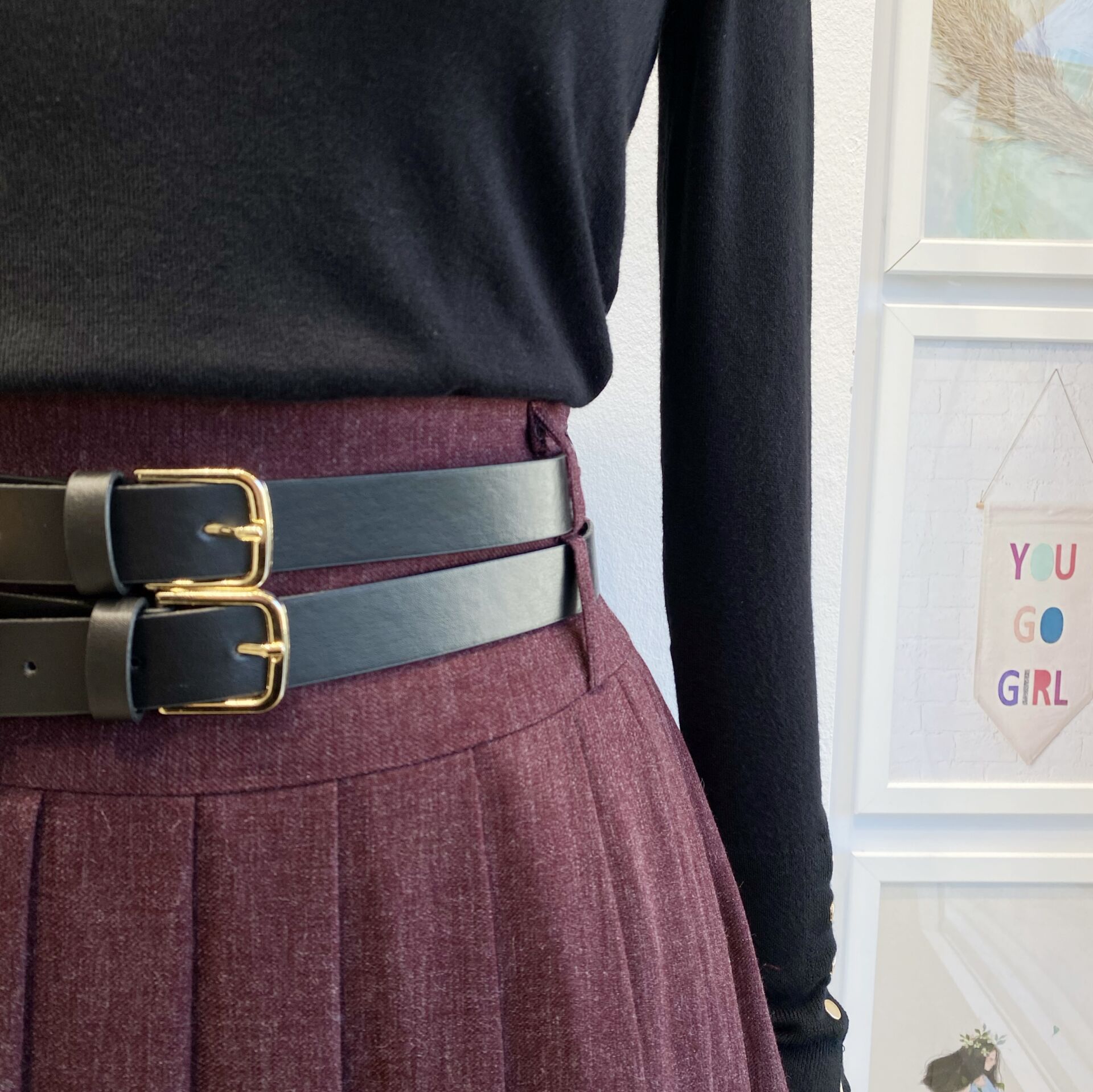 Bordo Çift Kemerli Yün Efekt Etek