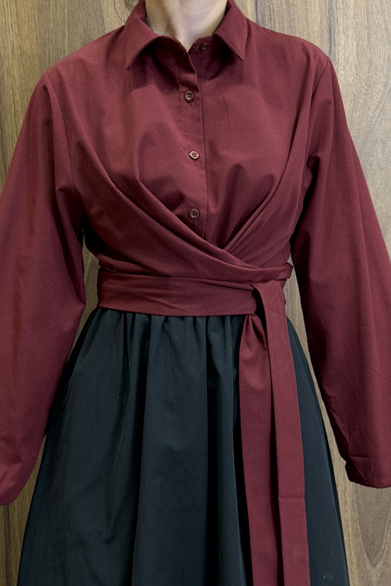 Bordo Poplin Kumaş Kuşaklı Gömlek
