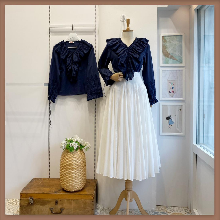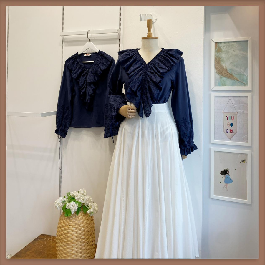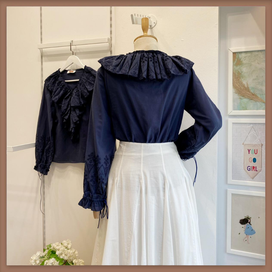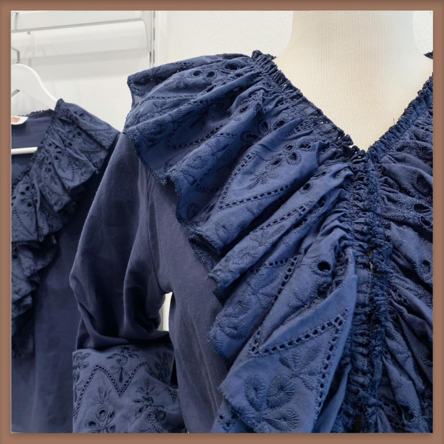 Brode Volanlı Lacivert Keten Gömlek