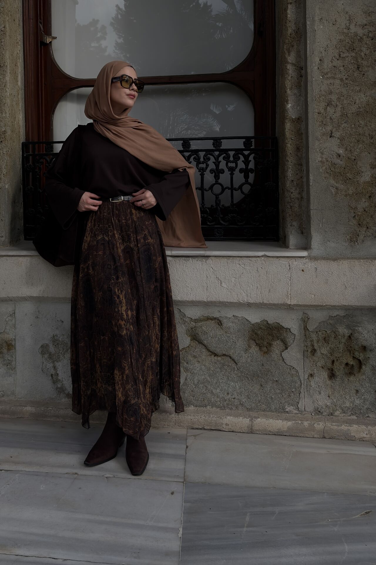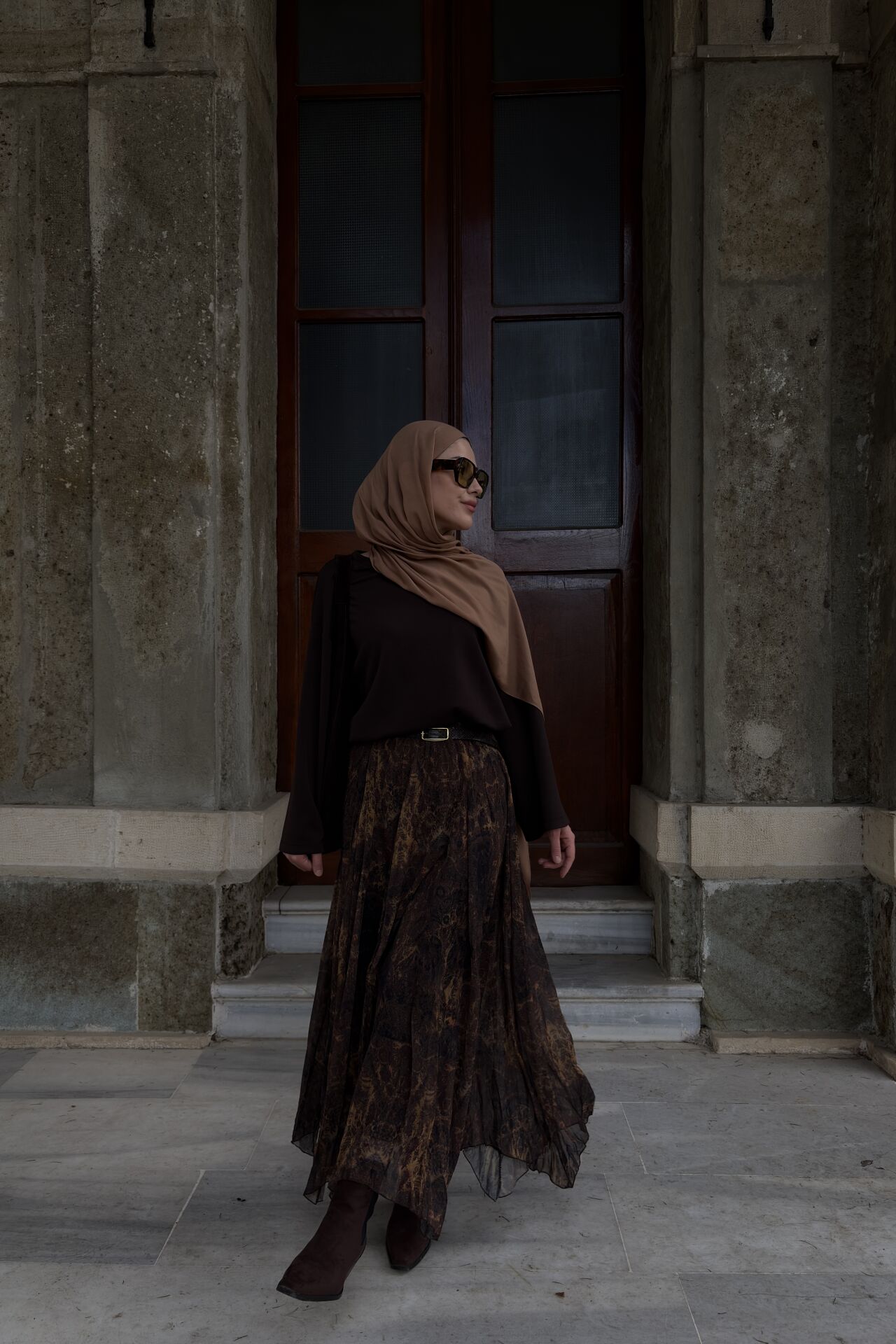 Faya Girls x Kahverengi Alaca Desenli Asimetrik Şifon Etek