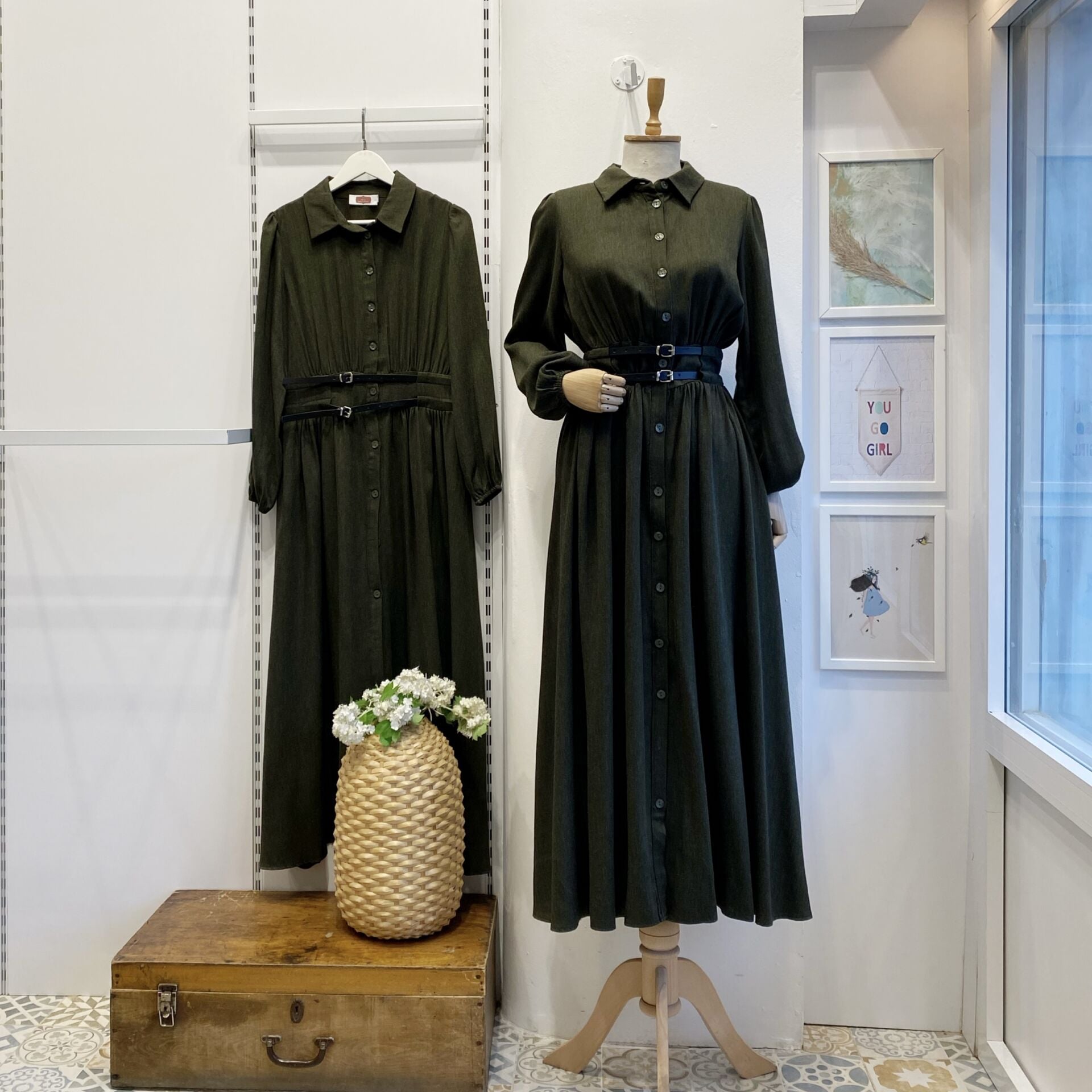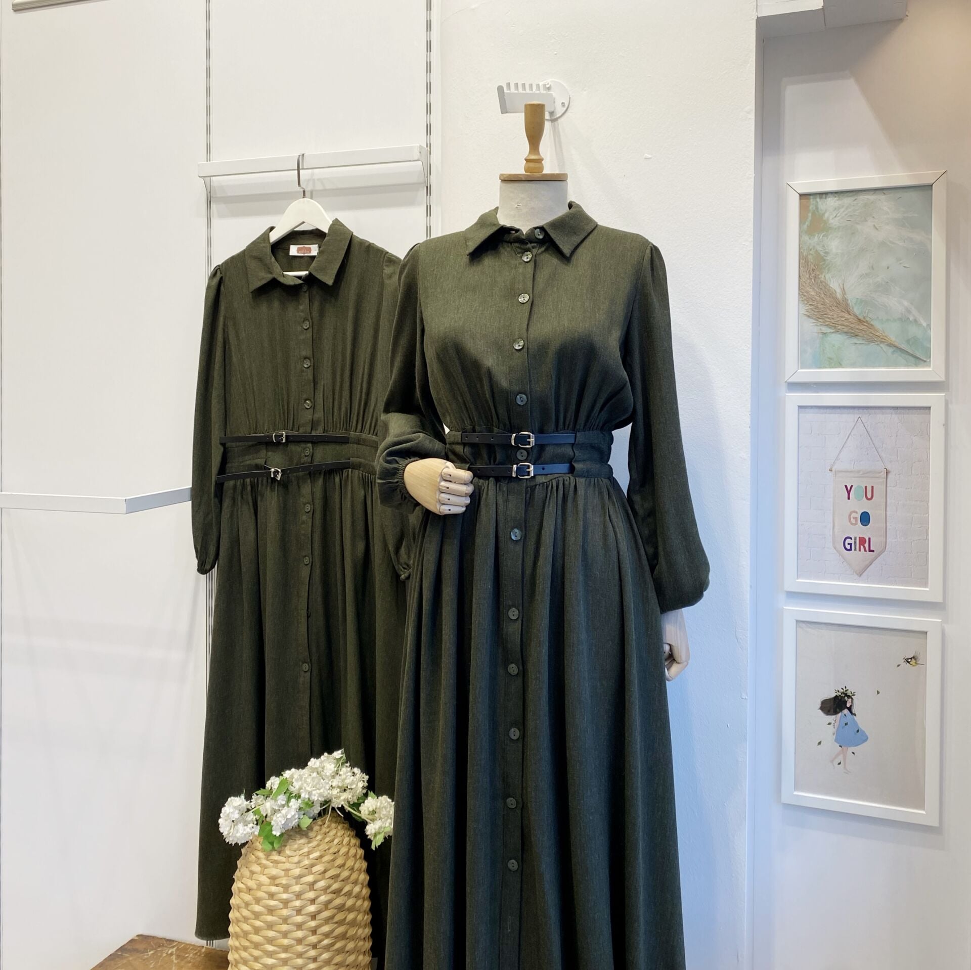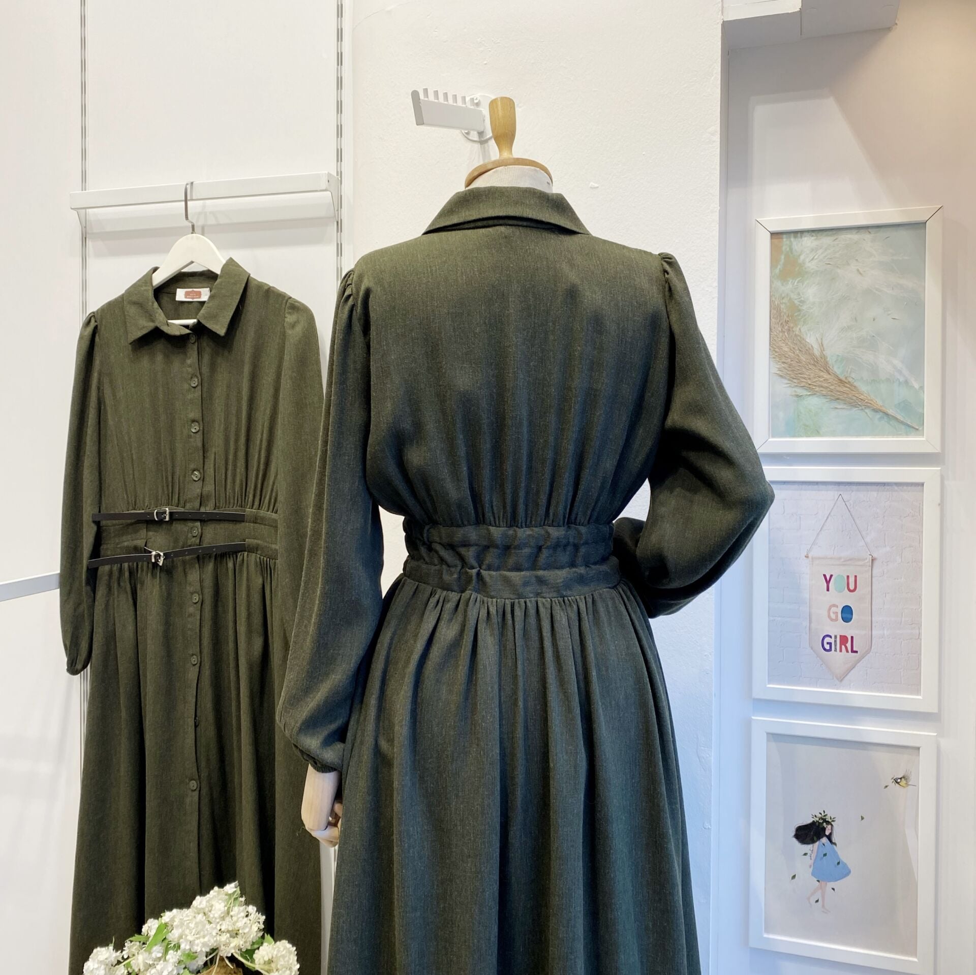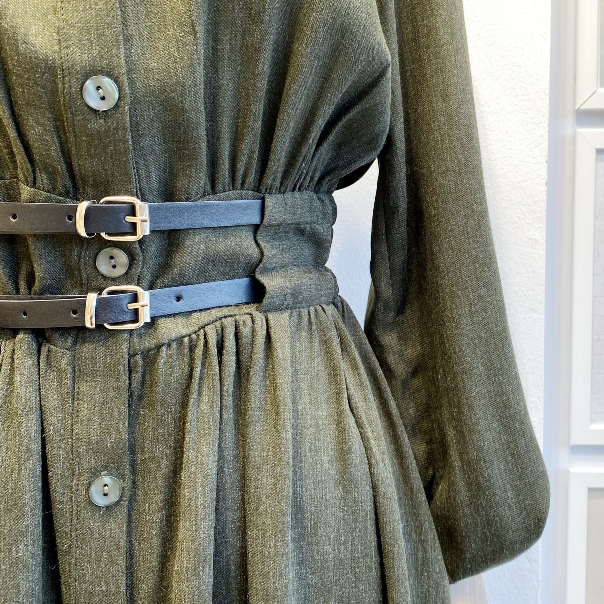 Haki Yeşili Çift Kemerli Yün Elbise