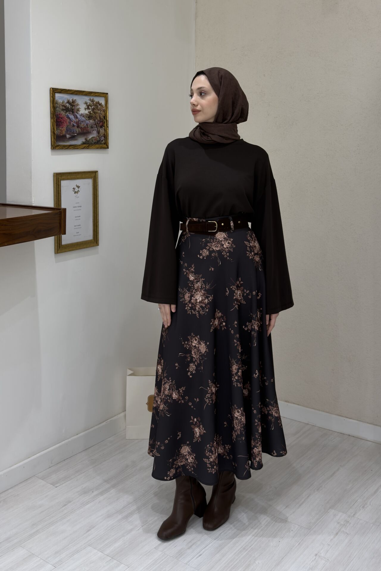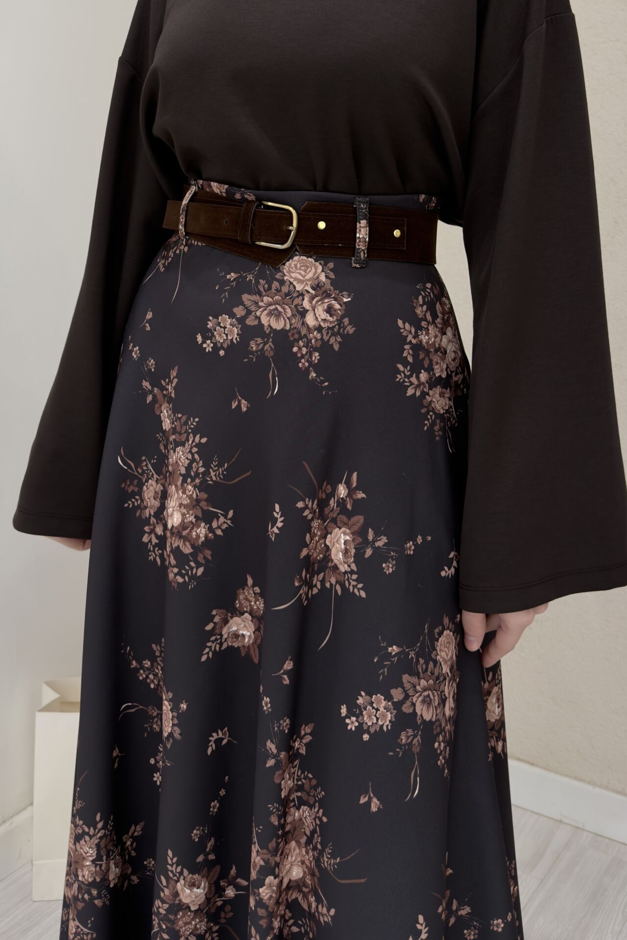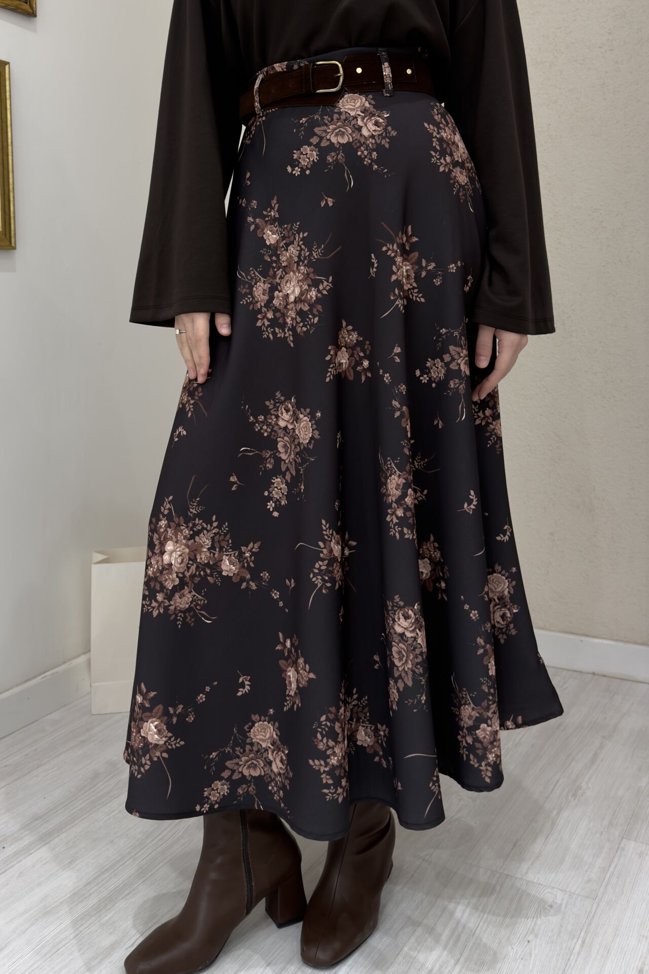 Kahverengi Çiçek Desenli Süet Kemerli Etek