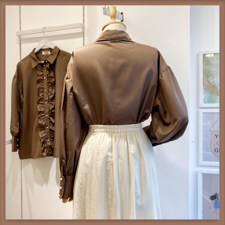 Kahverengi İnci Düğmeli Volanlı Gömlek