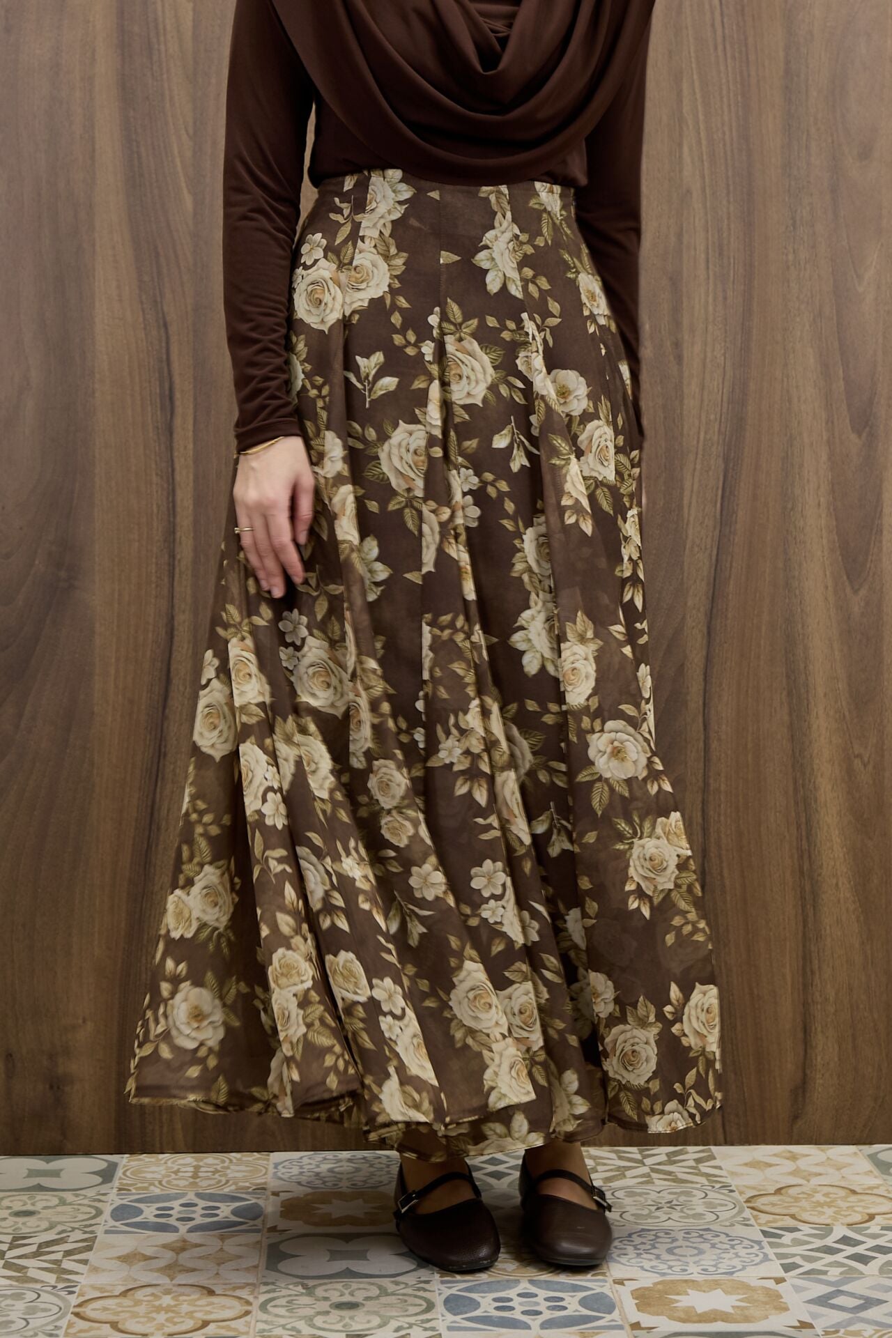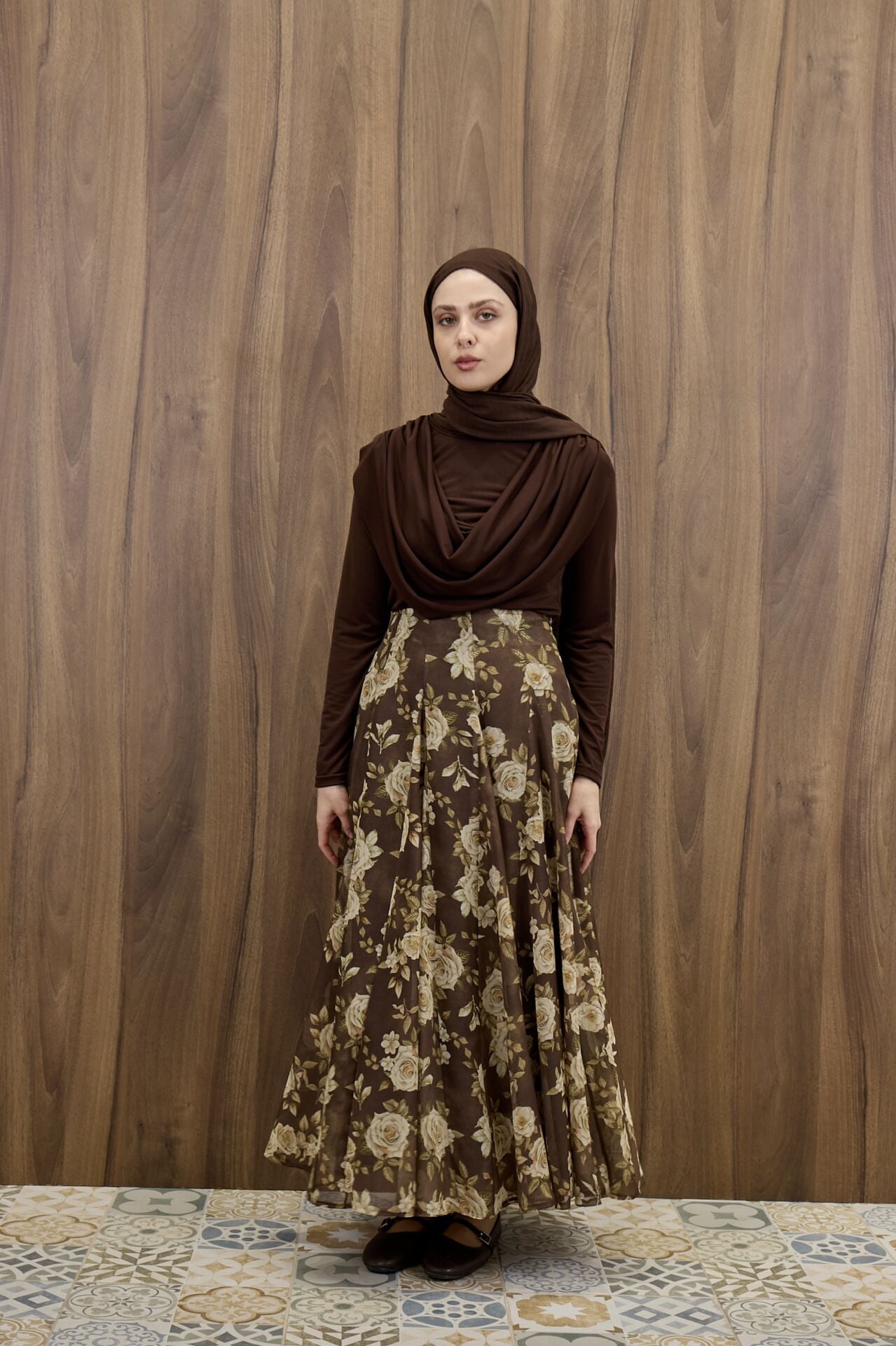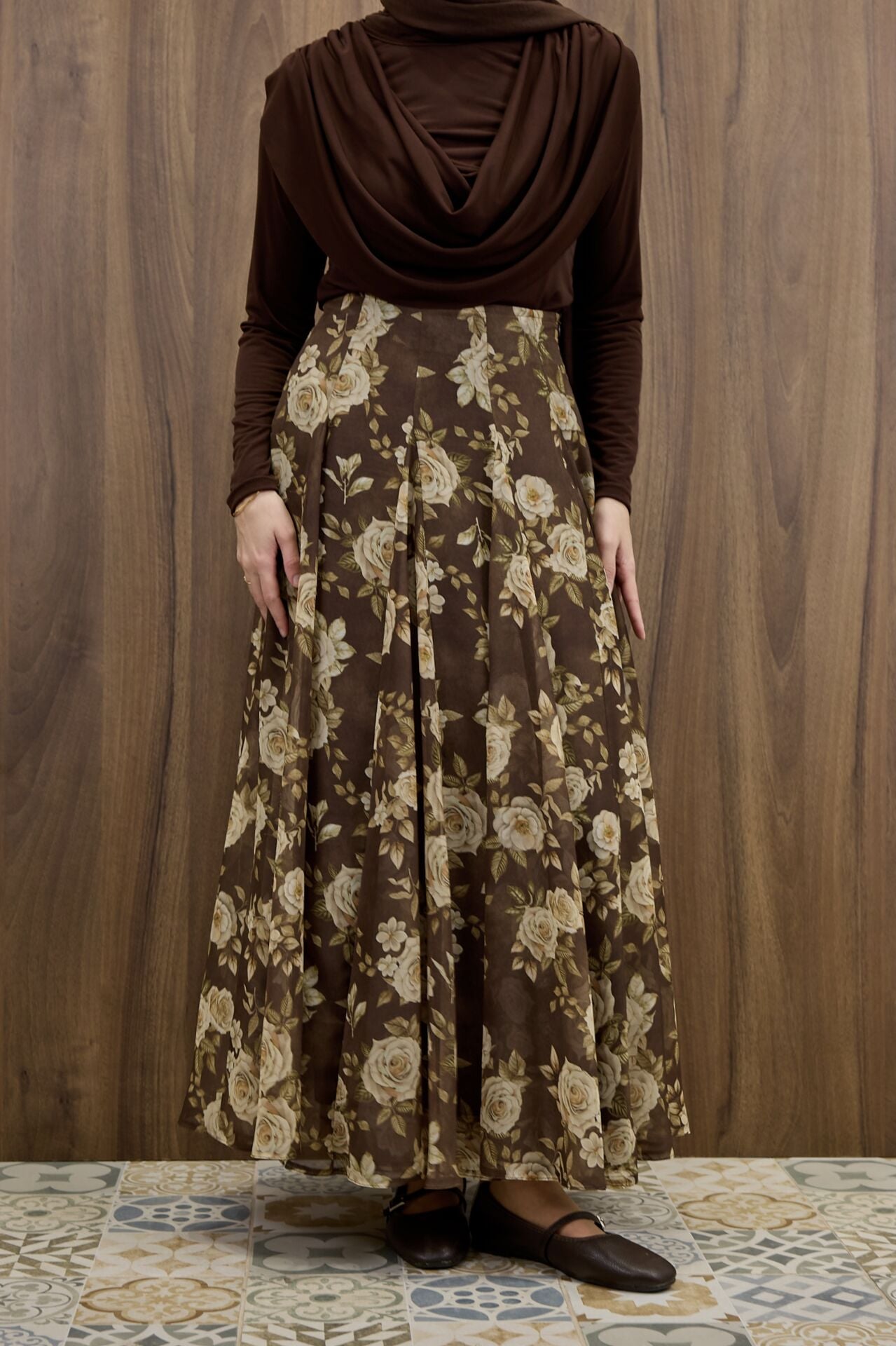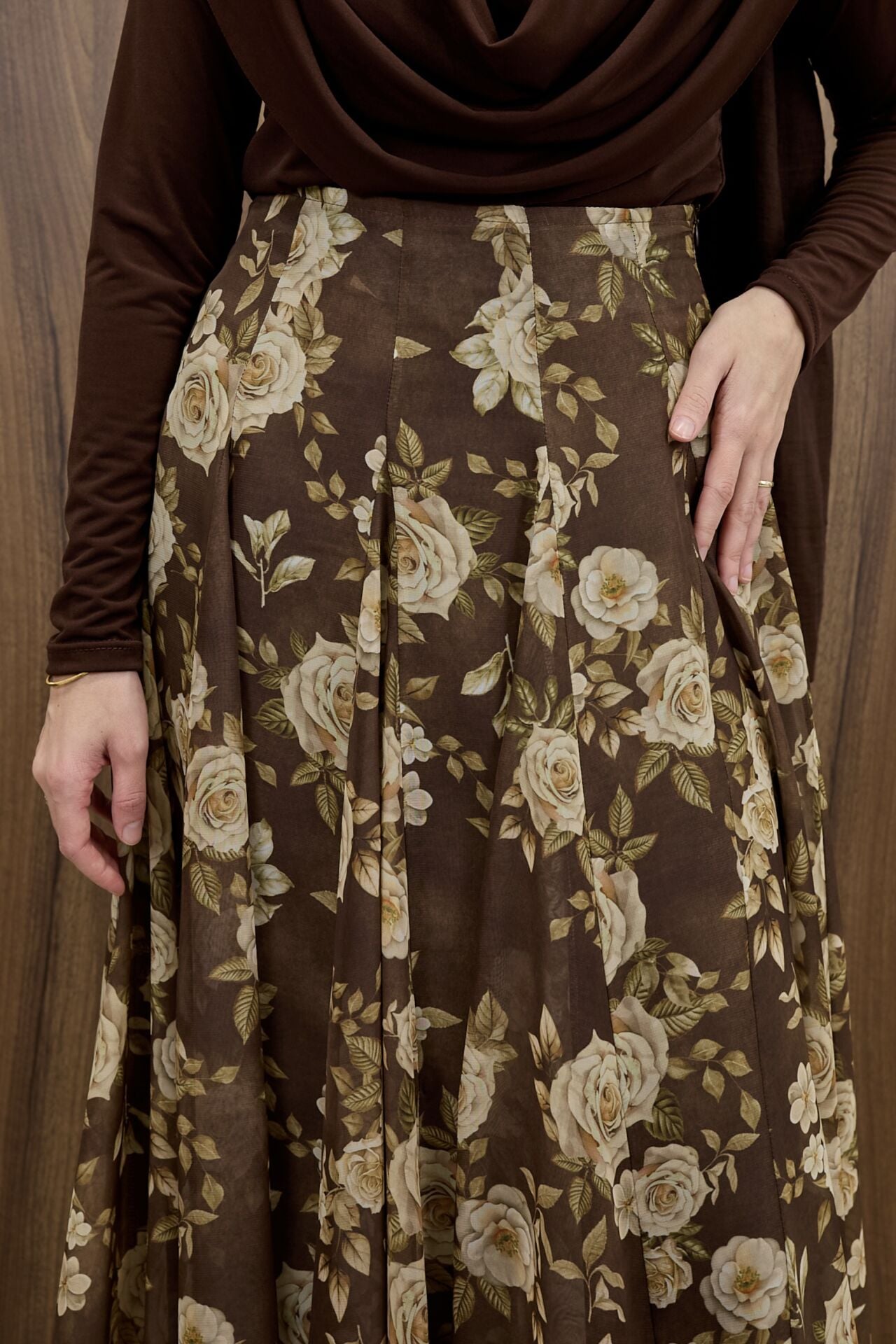 Kahverengi Rosel Çiçek Desenli Şifon etek
