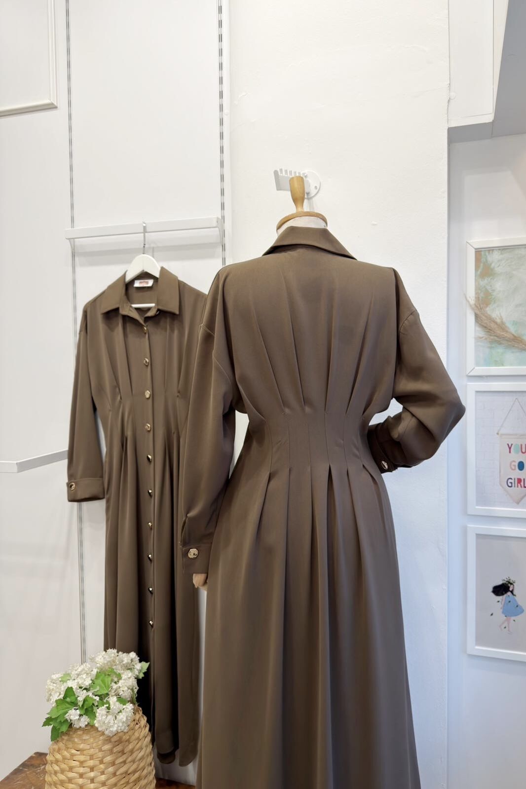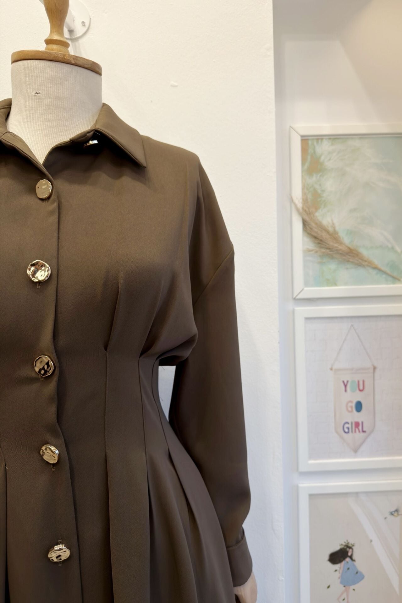 Koyu Vizon Gold Düğmeli Bel Detaylı Crep Elbise