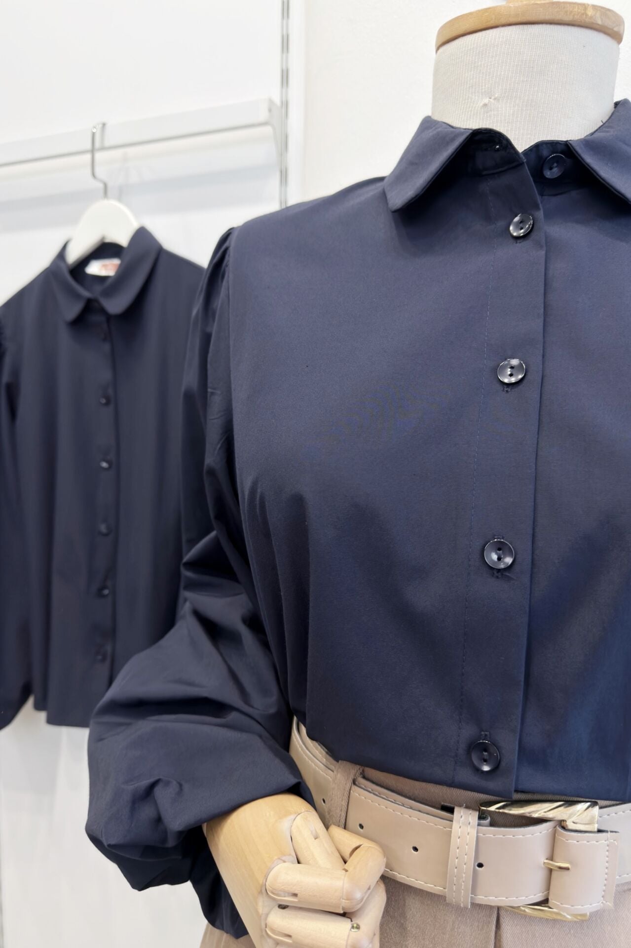 Lacivert Bebe Yaka Balon Kol Poplin Gömlek