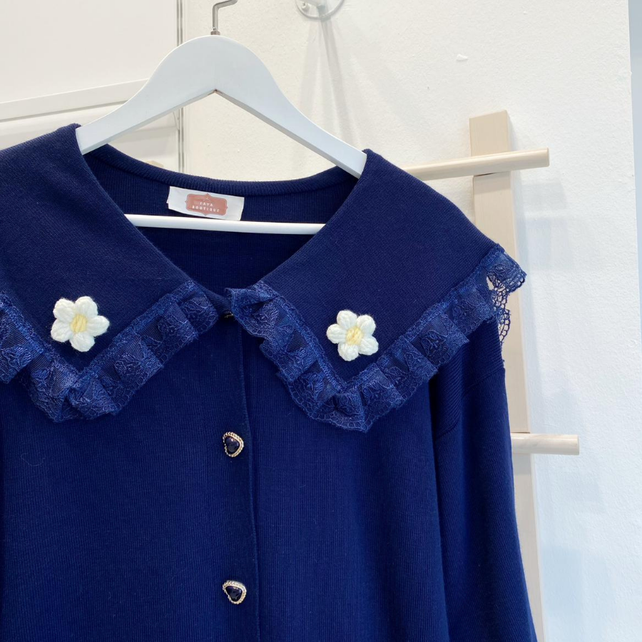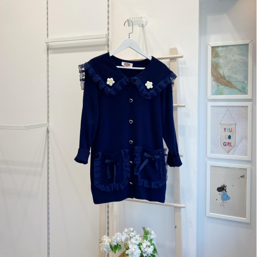 Papatya Motifli Dantel Detaylı Lacivert Hırka