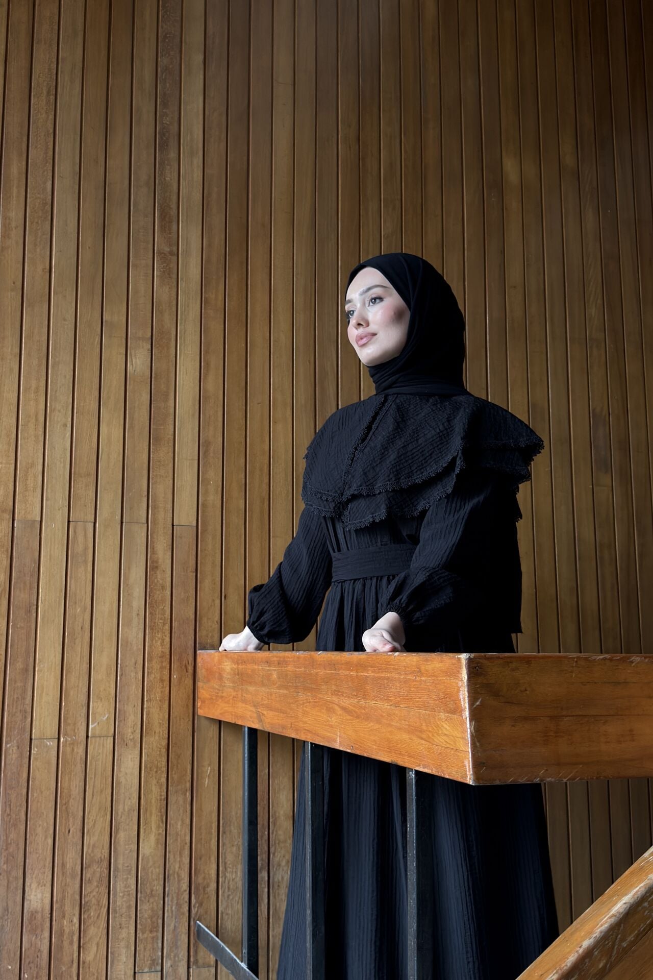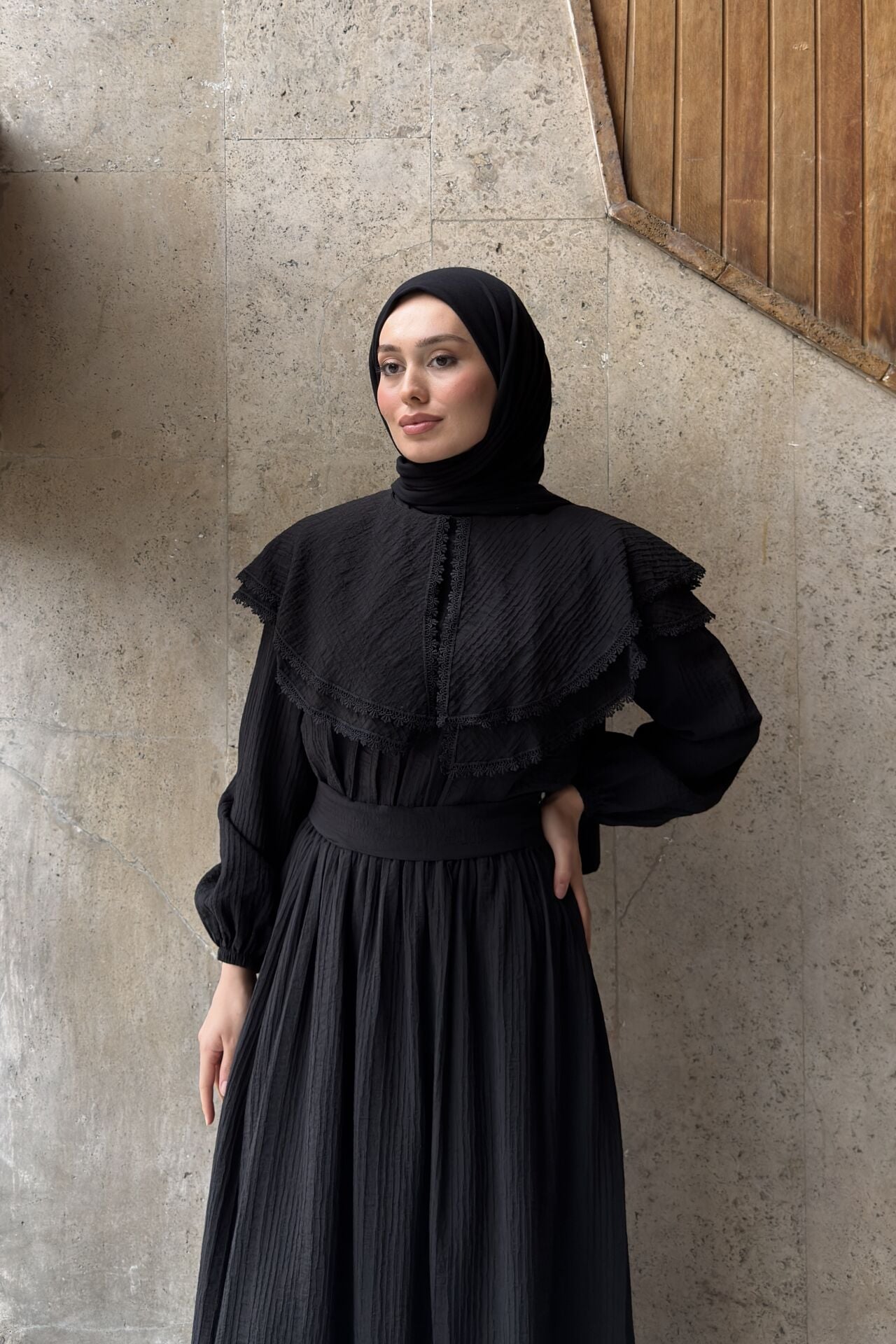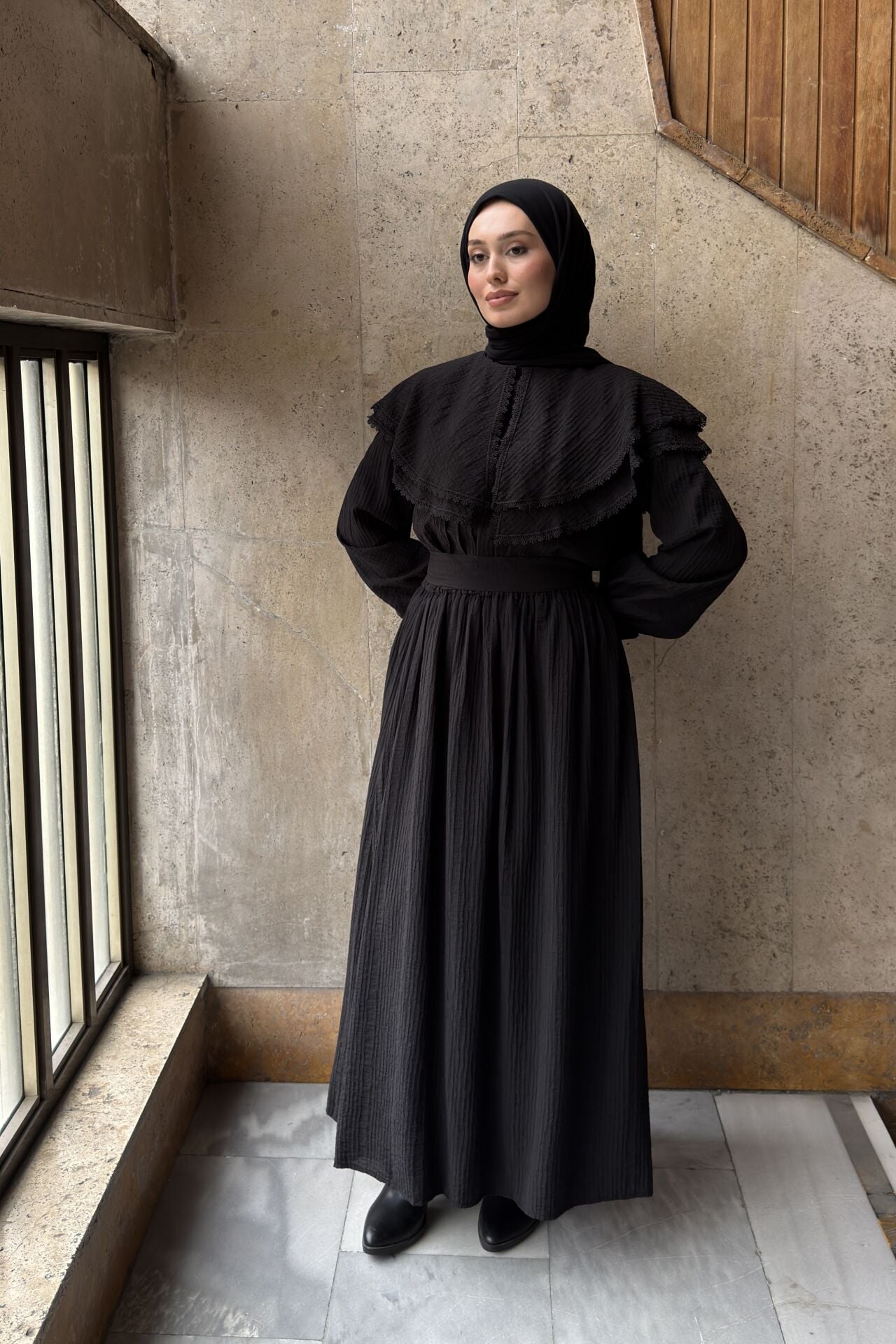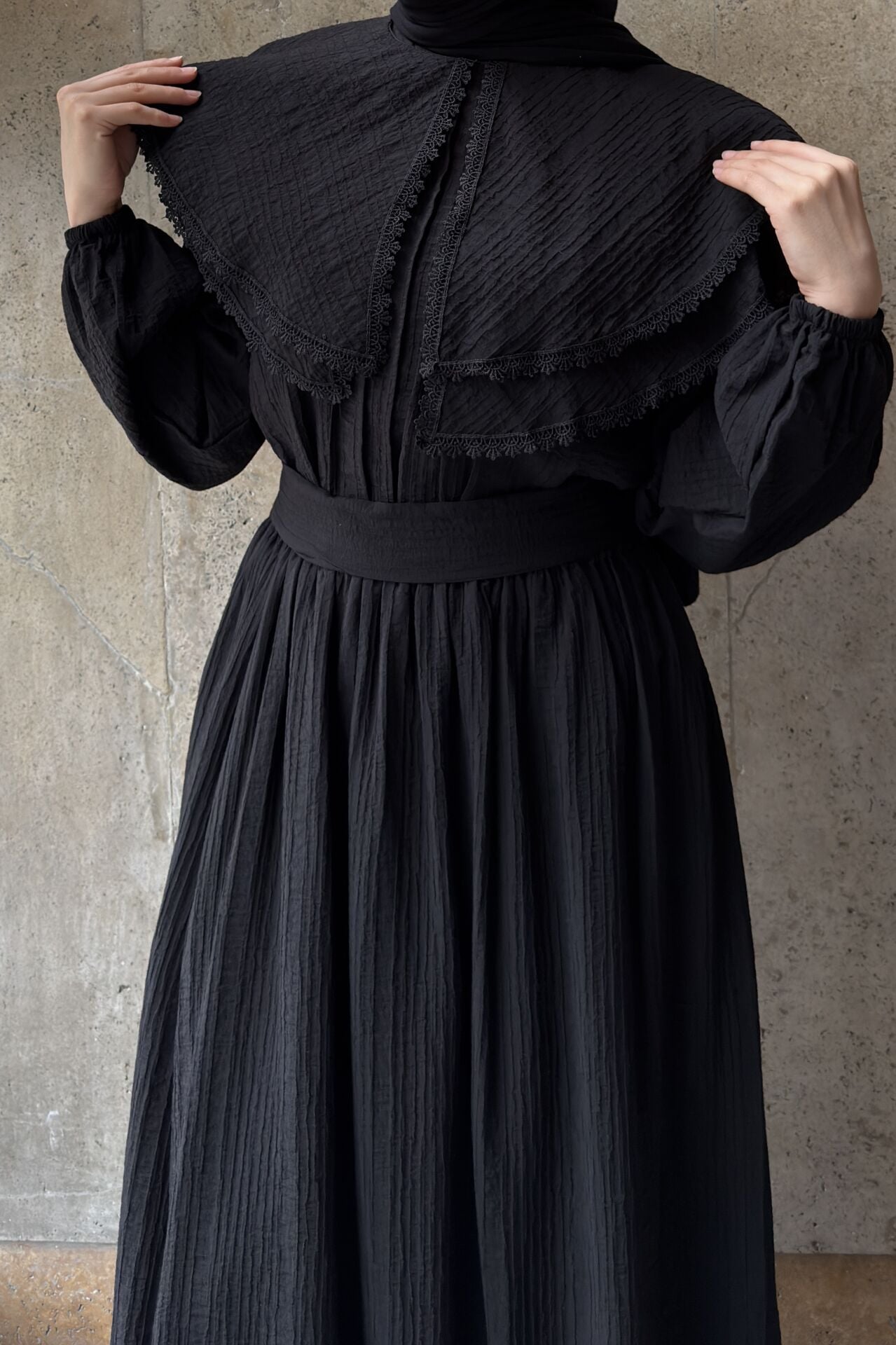 Siyah Geniş Yakalı Florlyn Gofre Takım