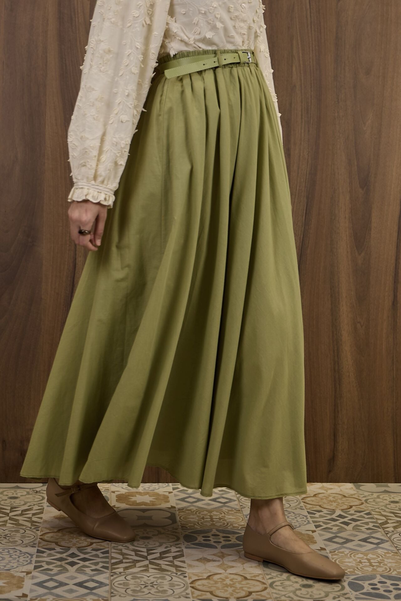 Yeşil Ceinture Kemerli Keten Etek