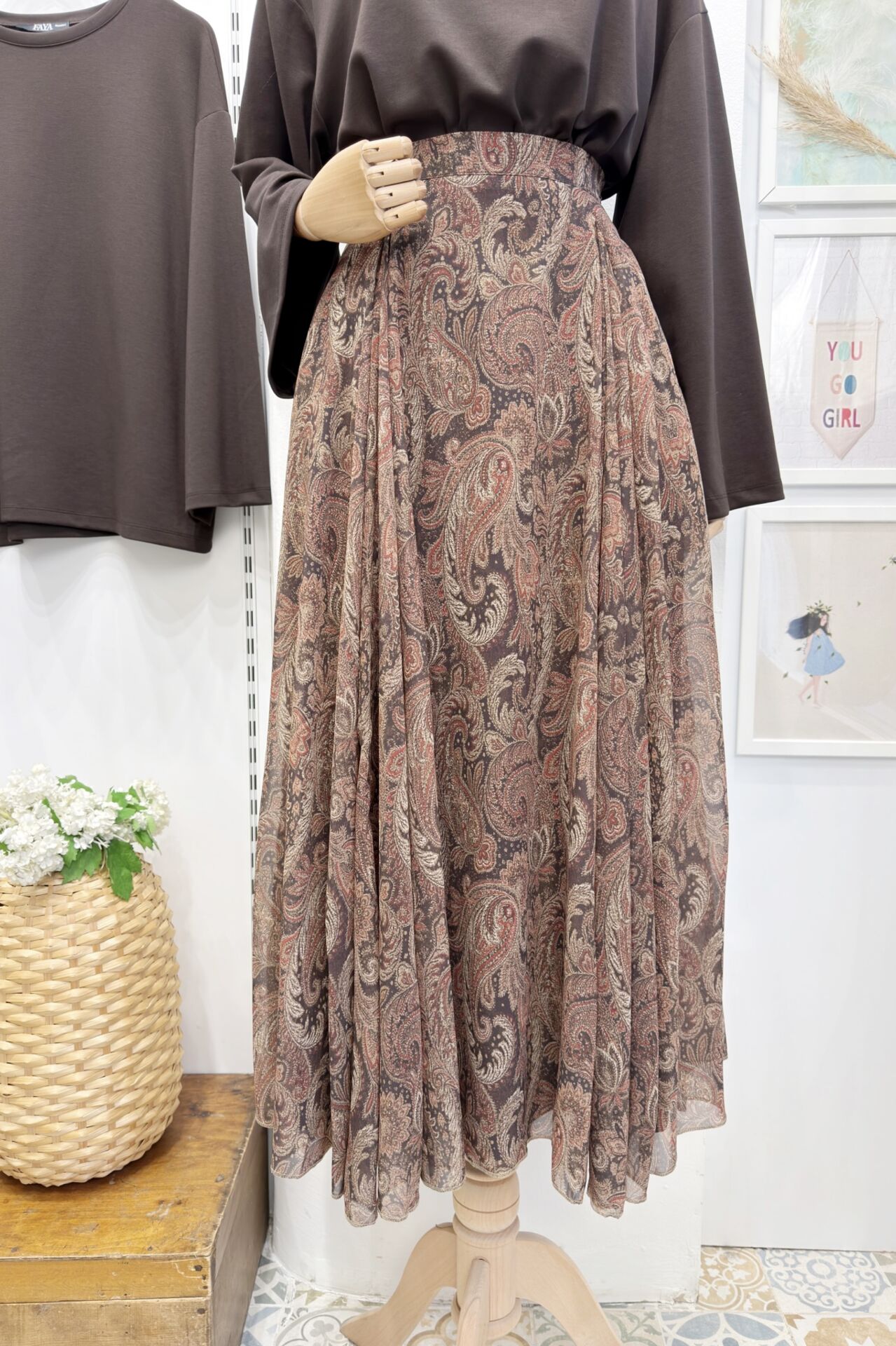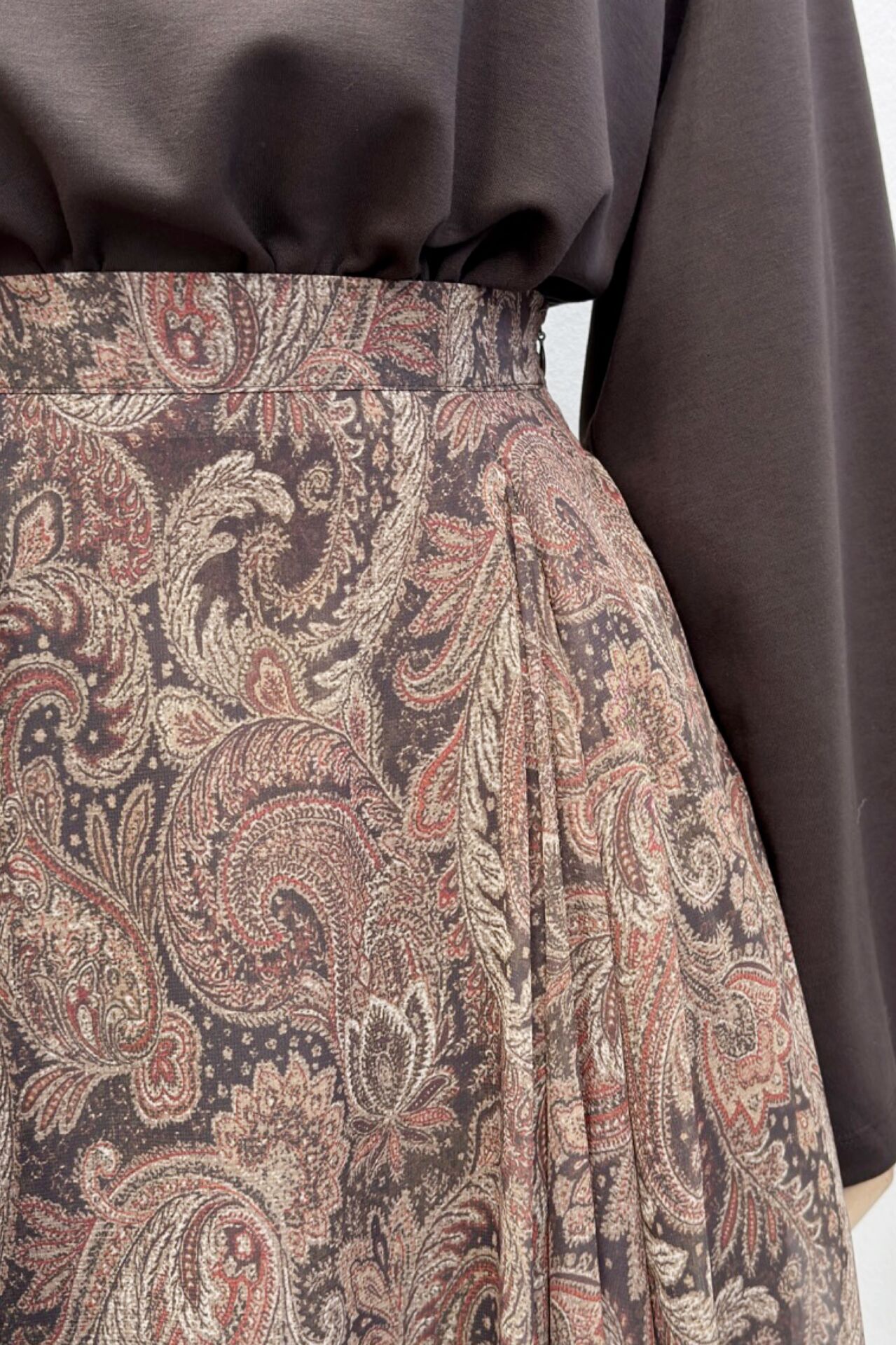 Acı Kahve Beli Fermuarlı Şal Desen Şifon Etek