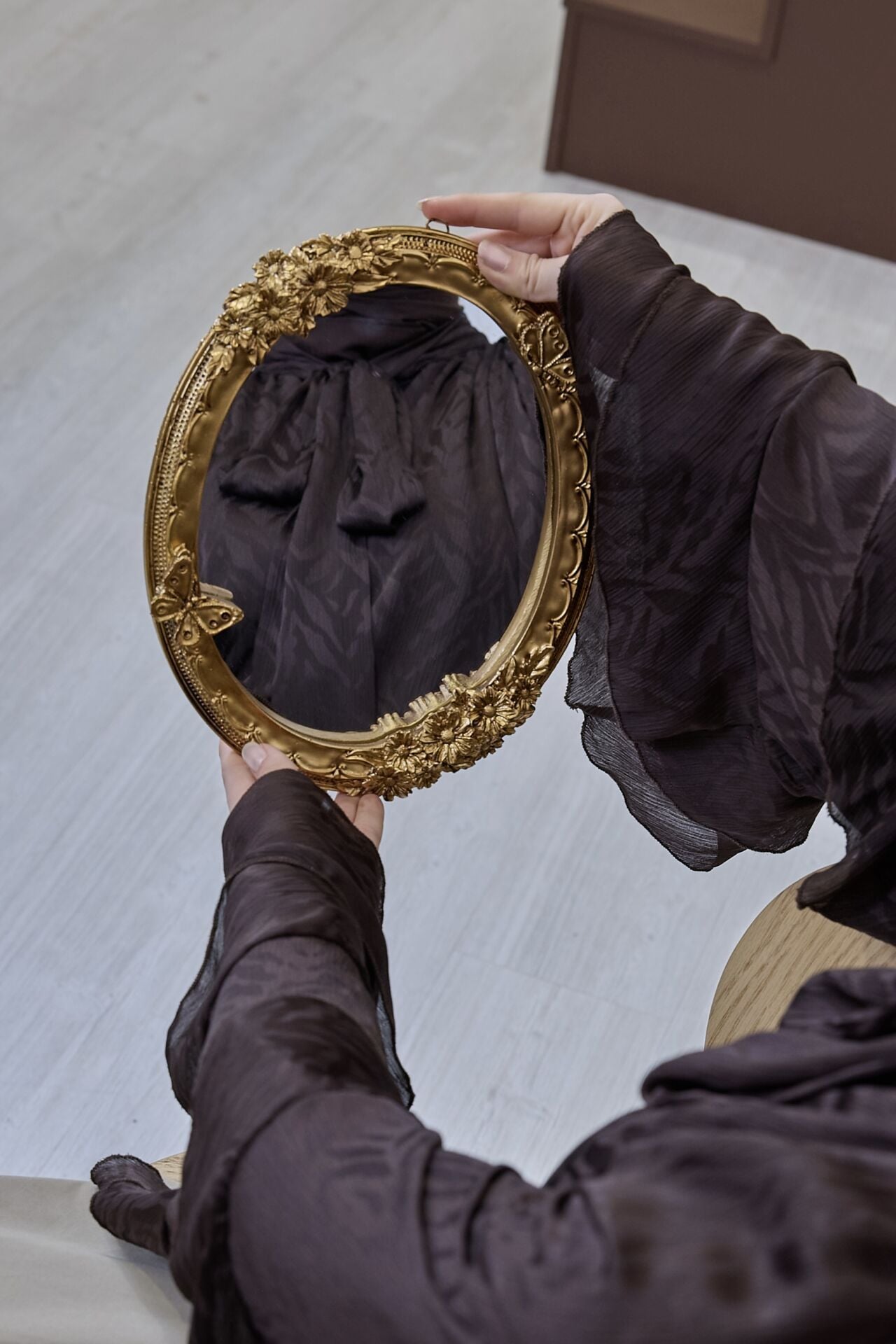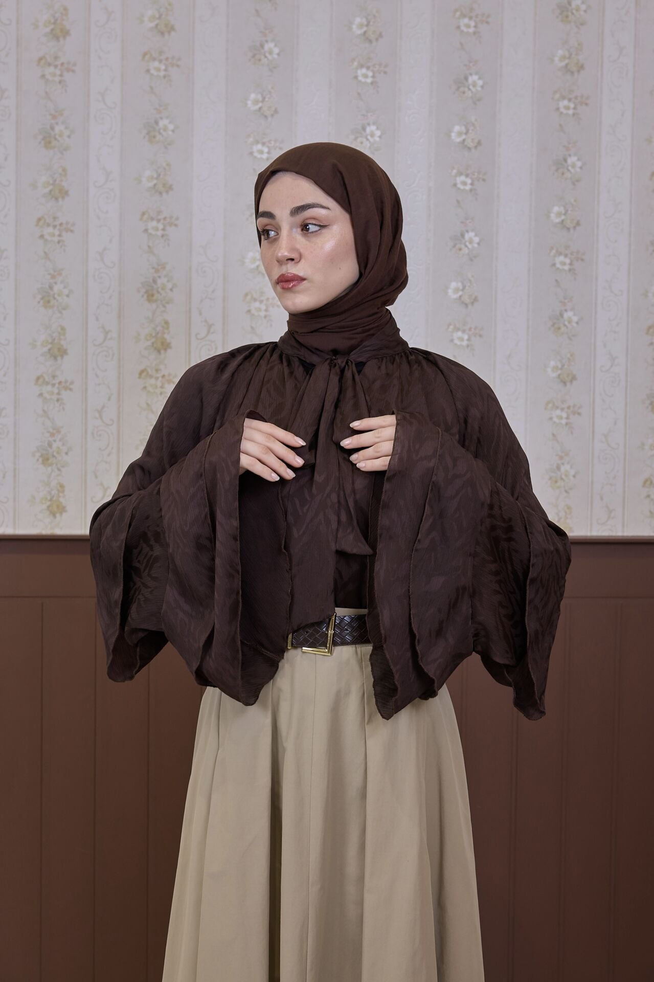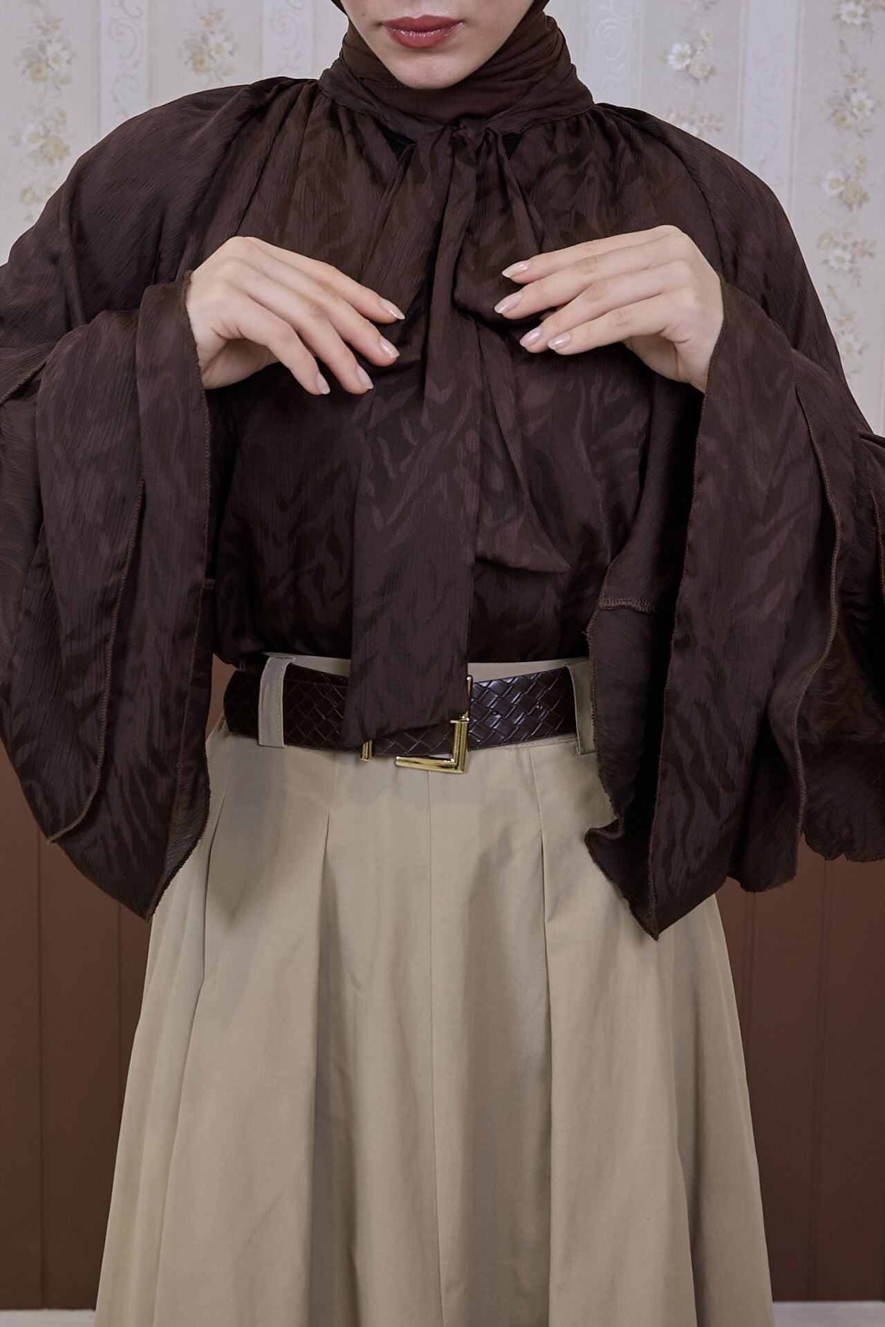 Acı Kahve Kolları Volanlı Blusa Saten Gömlek