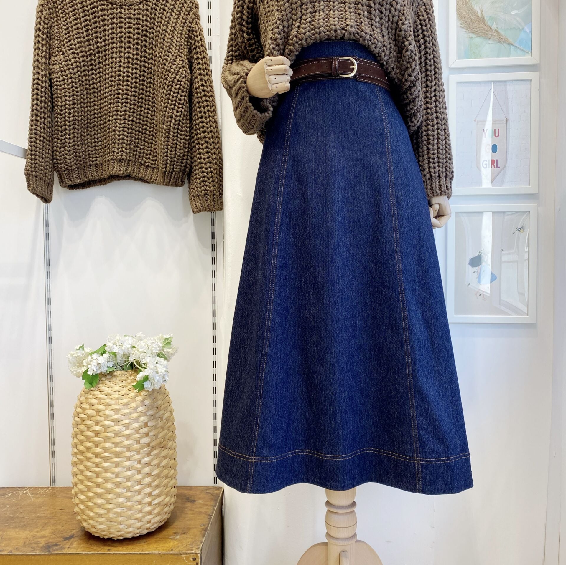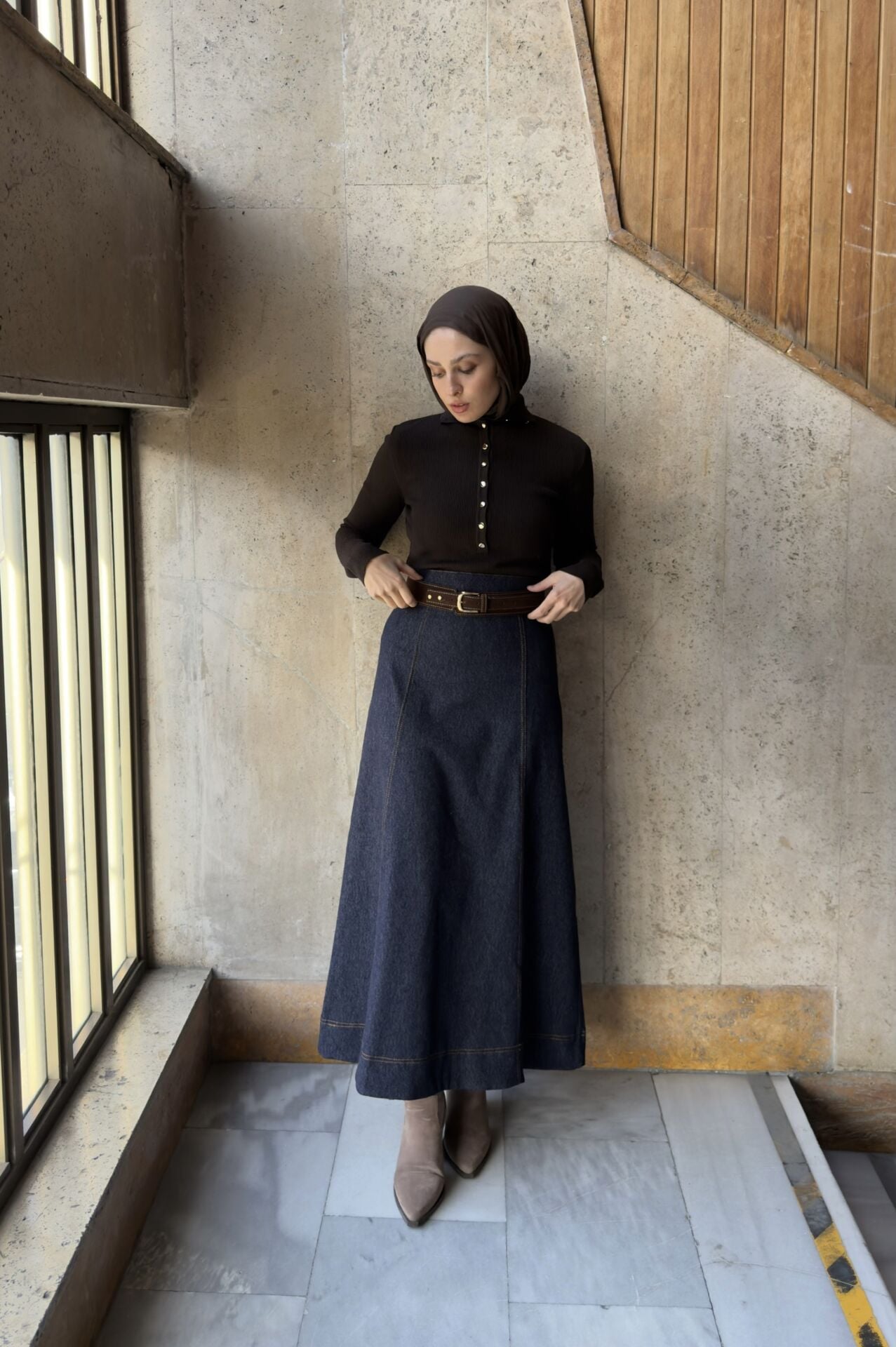 Süet Kemer Detaylı Lacivert Perline Kot Etek
