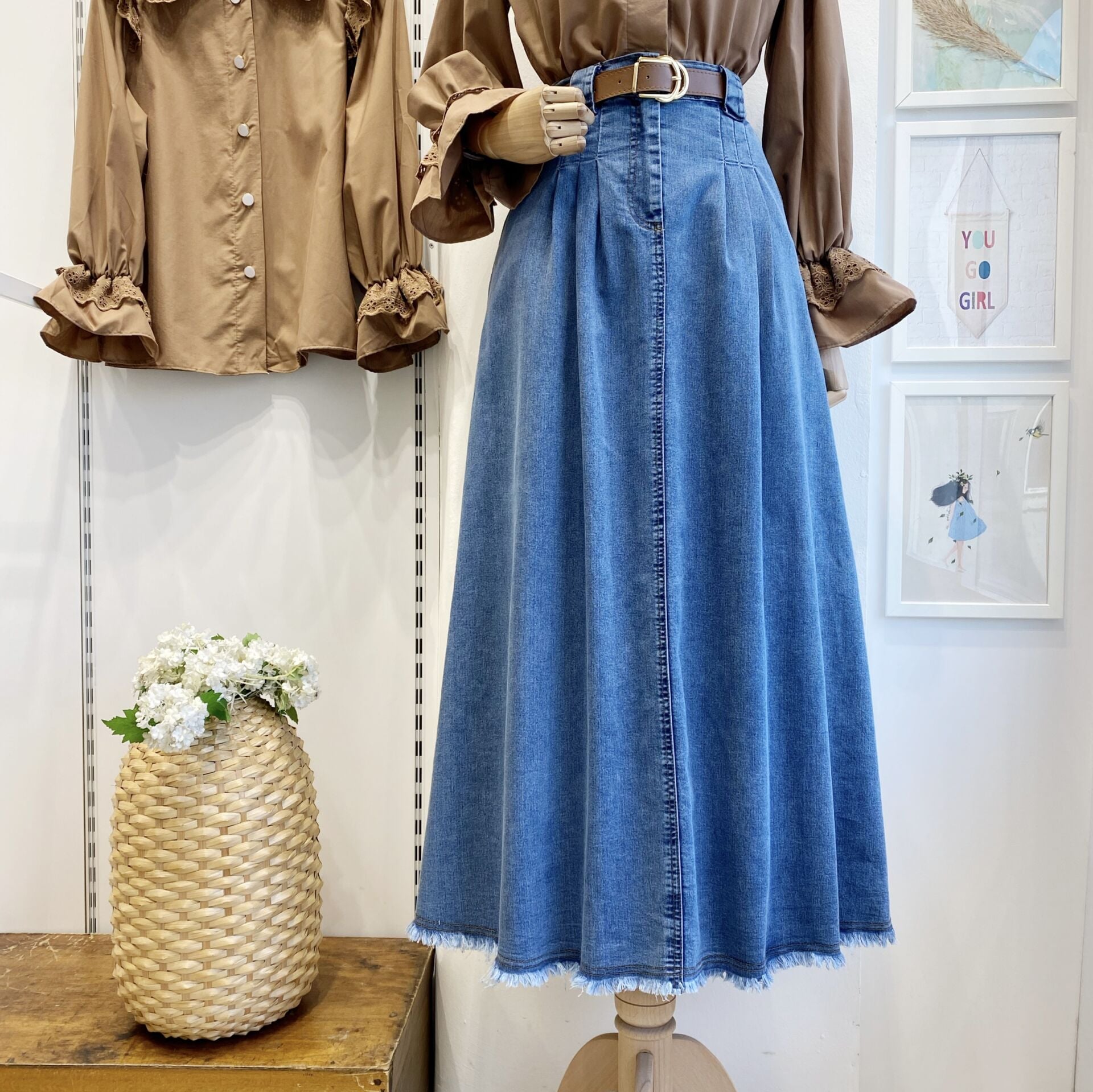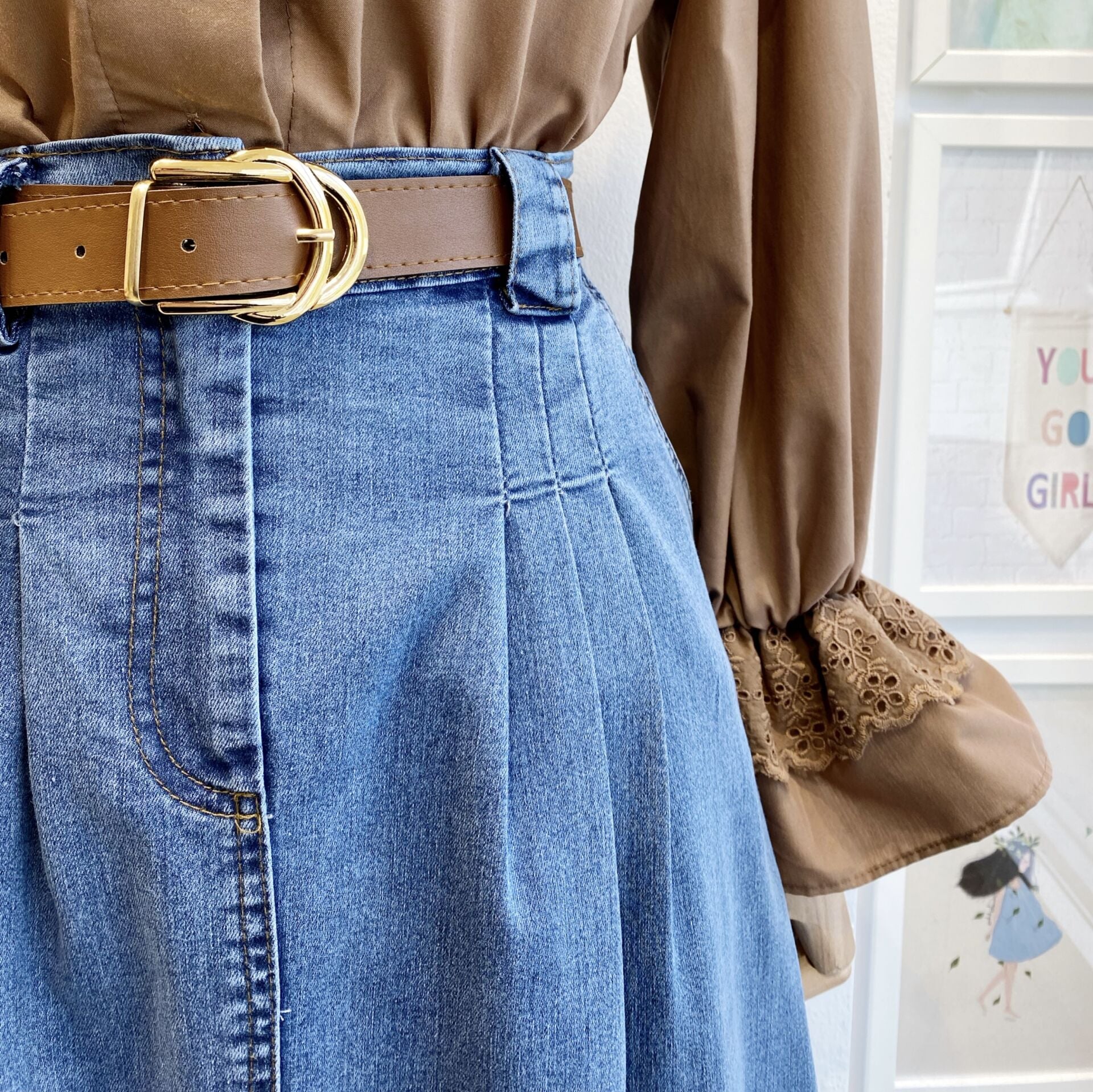 Açık Renk Pile Detaylı Kahverengi Kemerli Kot Etek