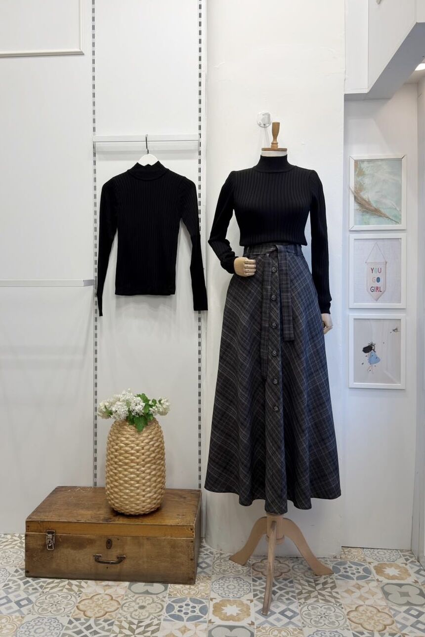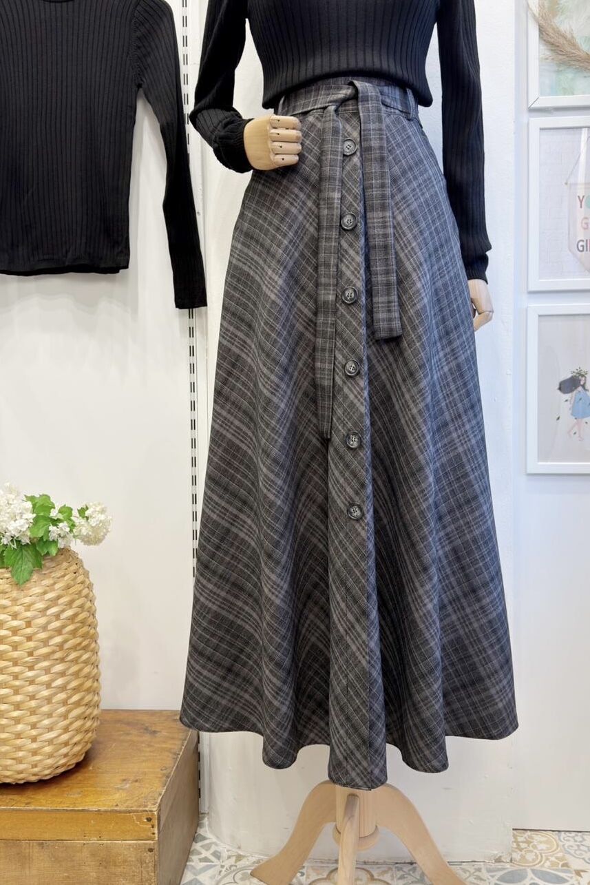 Antrasit Kuşaklı Ekose Desenli Elise Etek