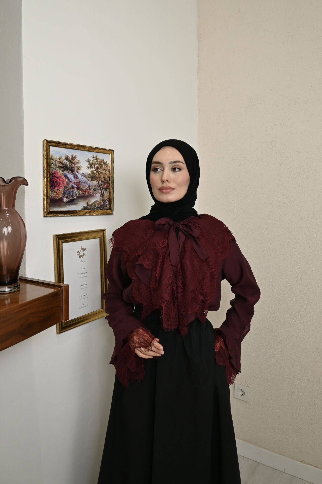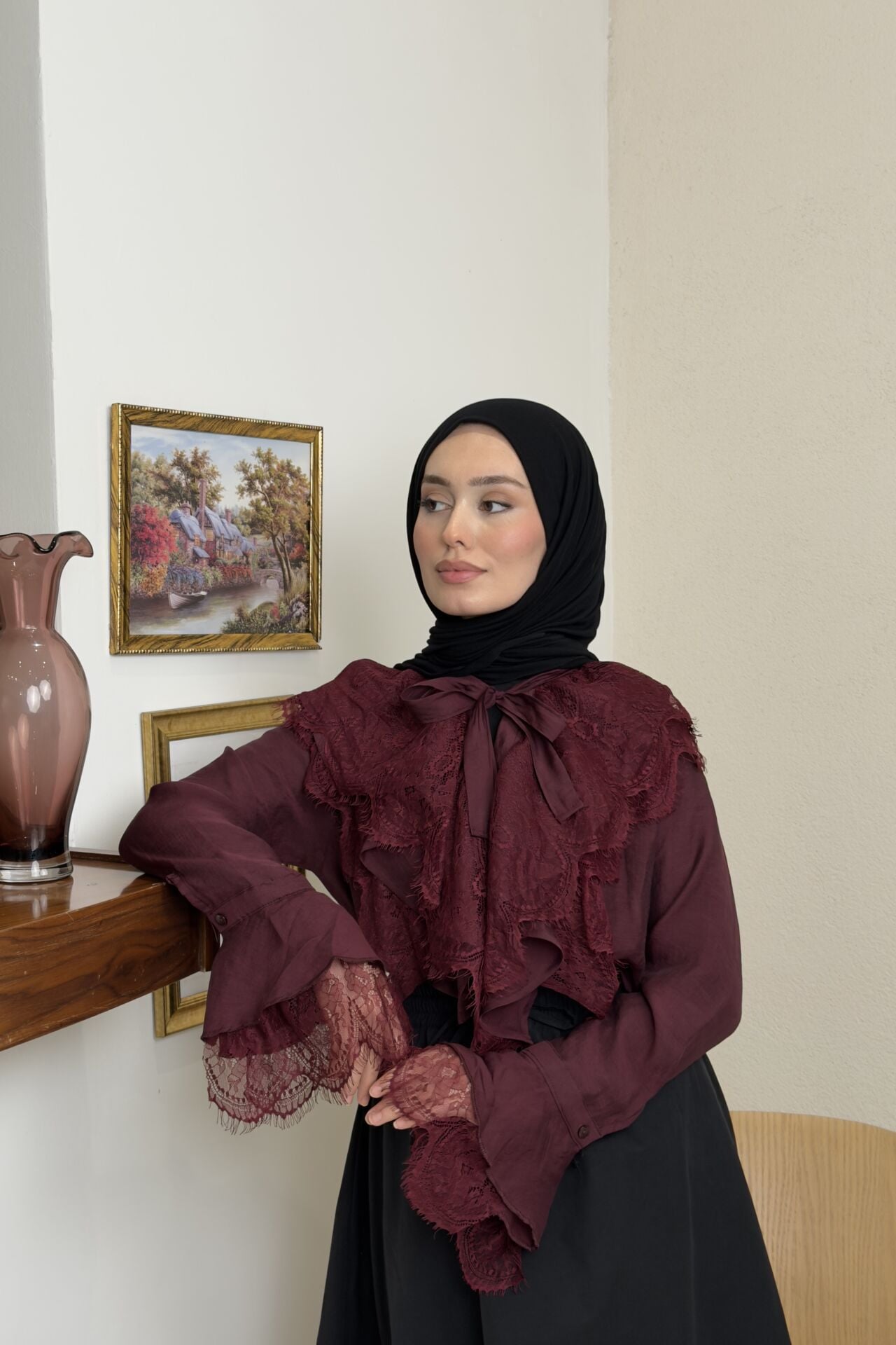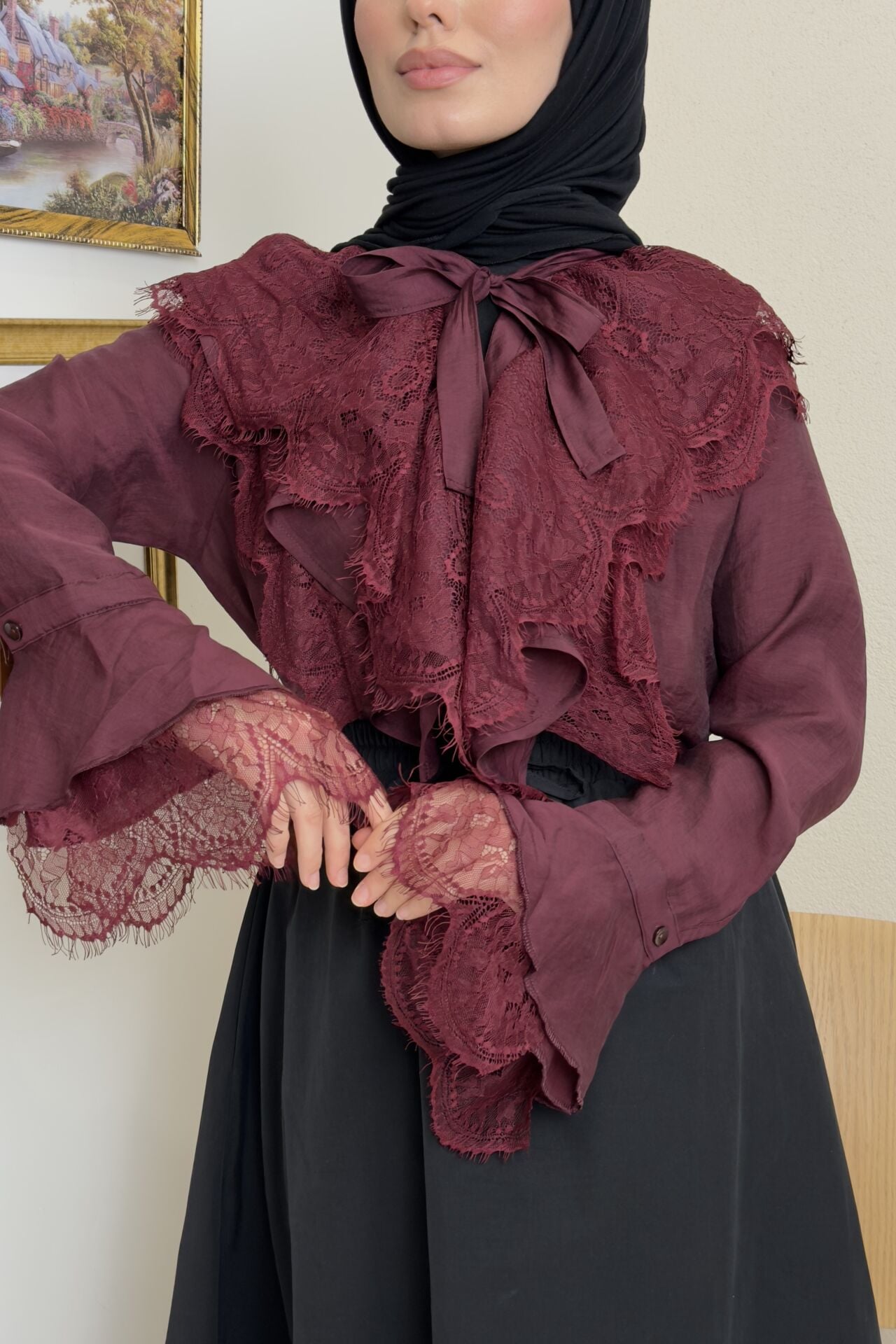 Bordo İnce Dantel Detaylı Florance Gömlek