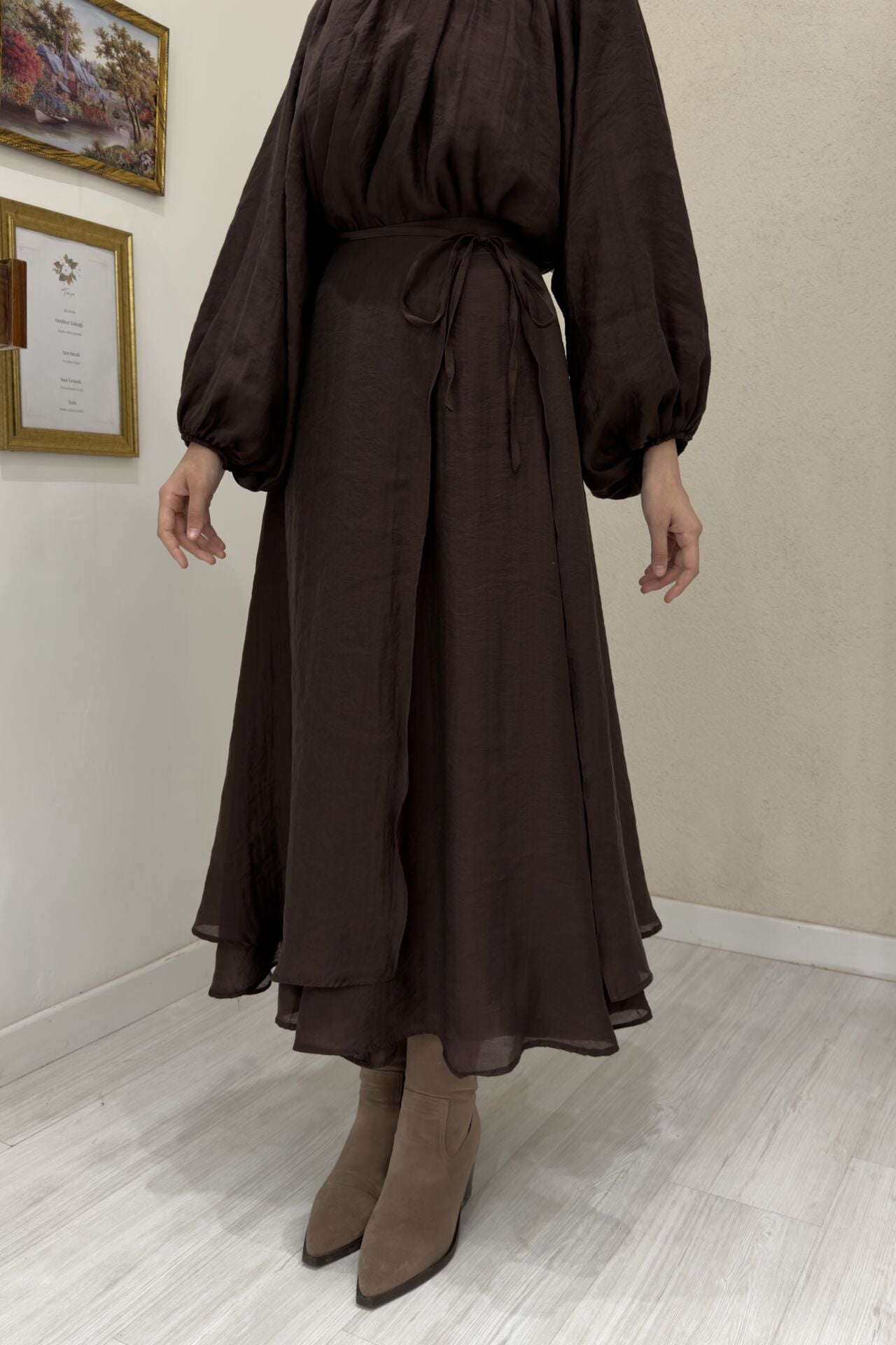 Dalgalı Şifon Kumaş Acı Kahve Balon Kol Takım