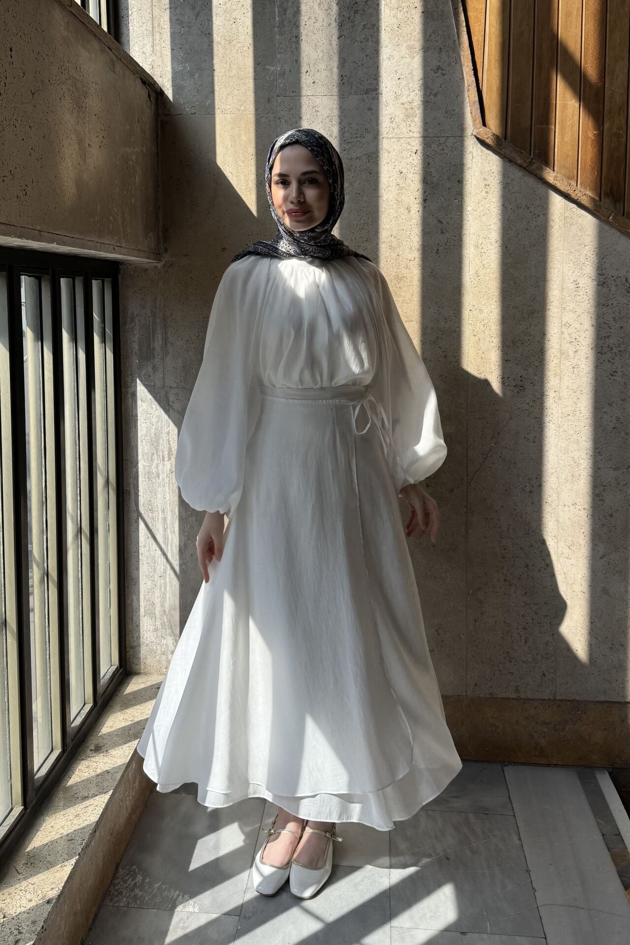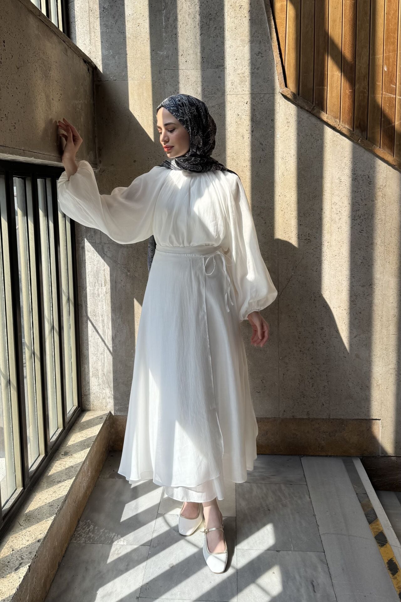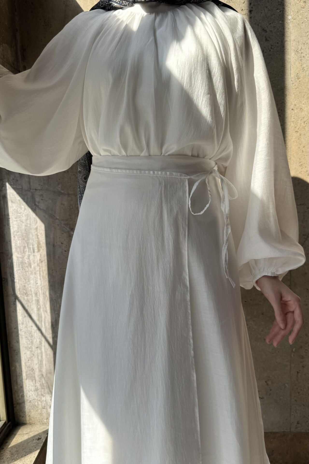 Dalgalı Şifon Kumaş Beyaz Balon Kol Takım