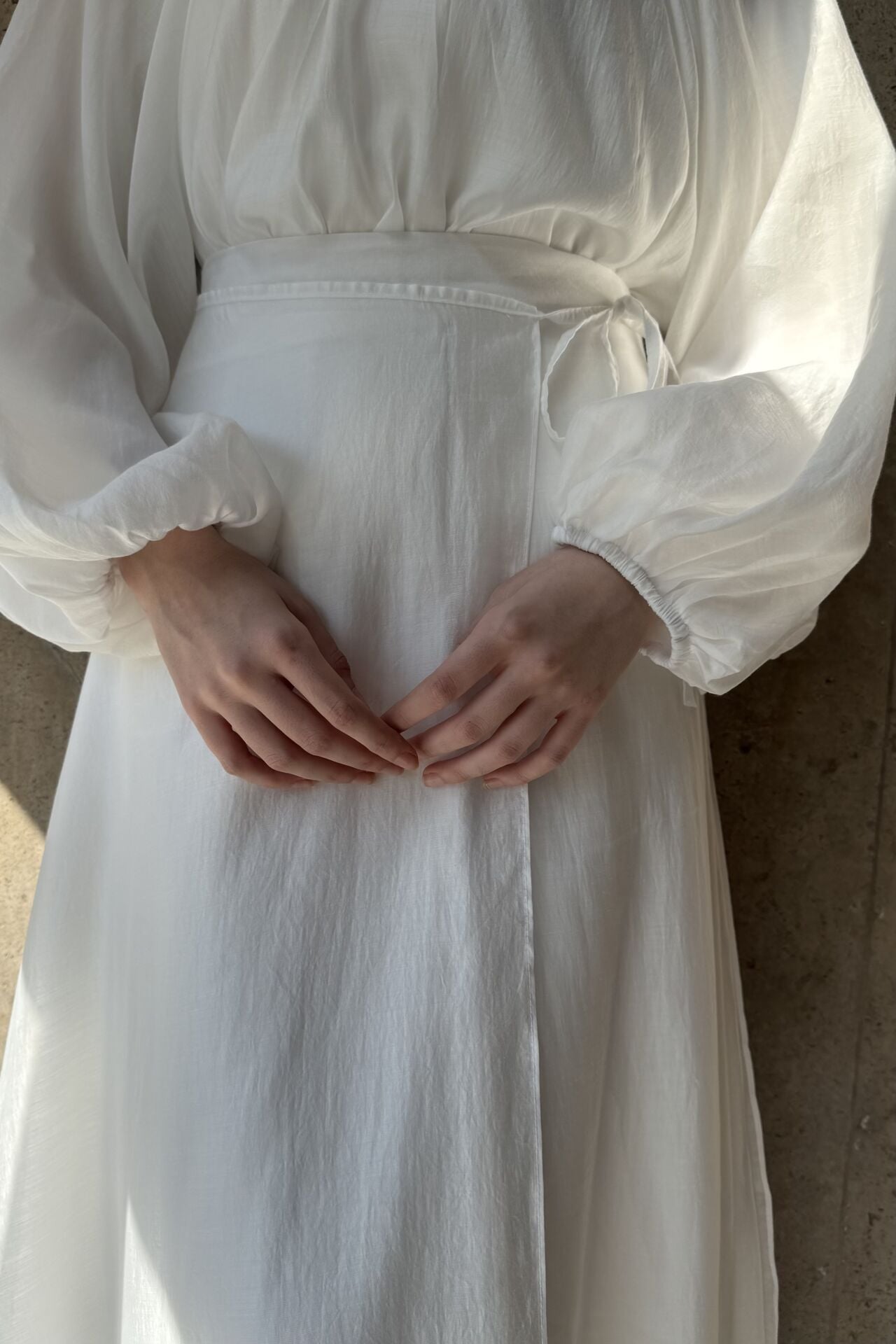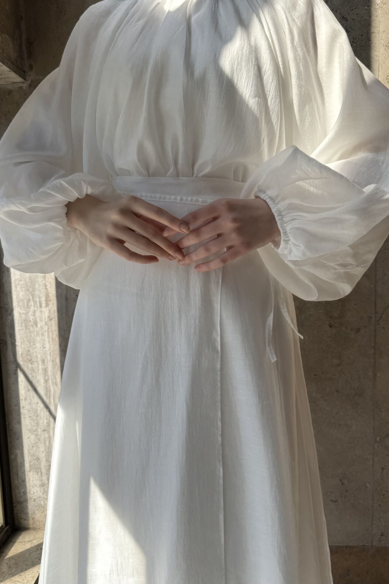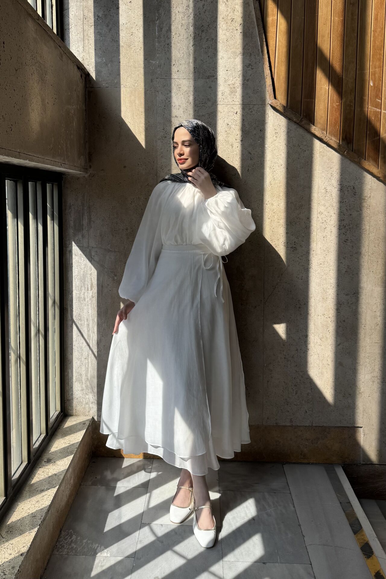 Dalgalı Şifon Kumaş Beyaz Balon Kol Takım