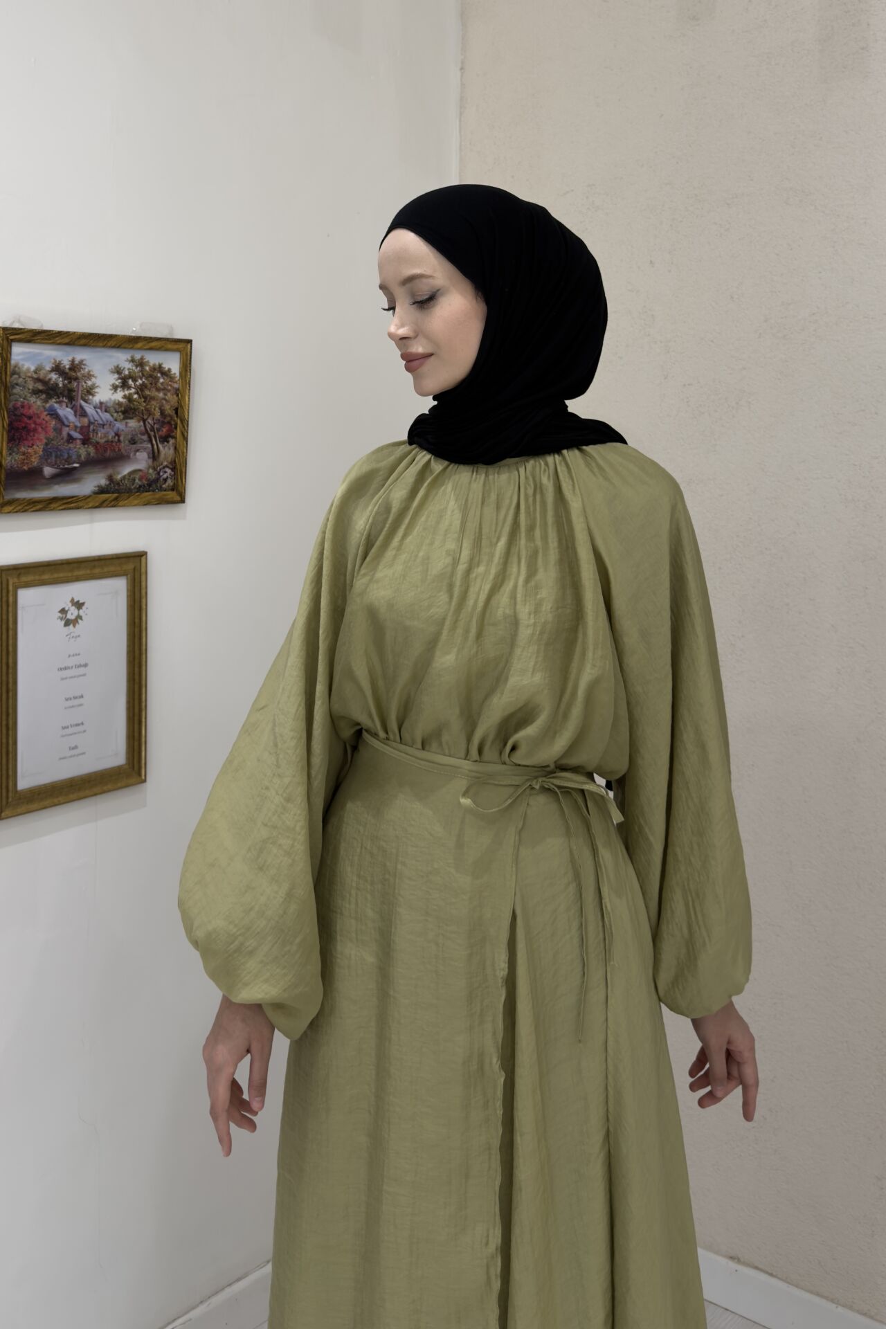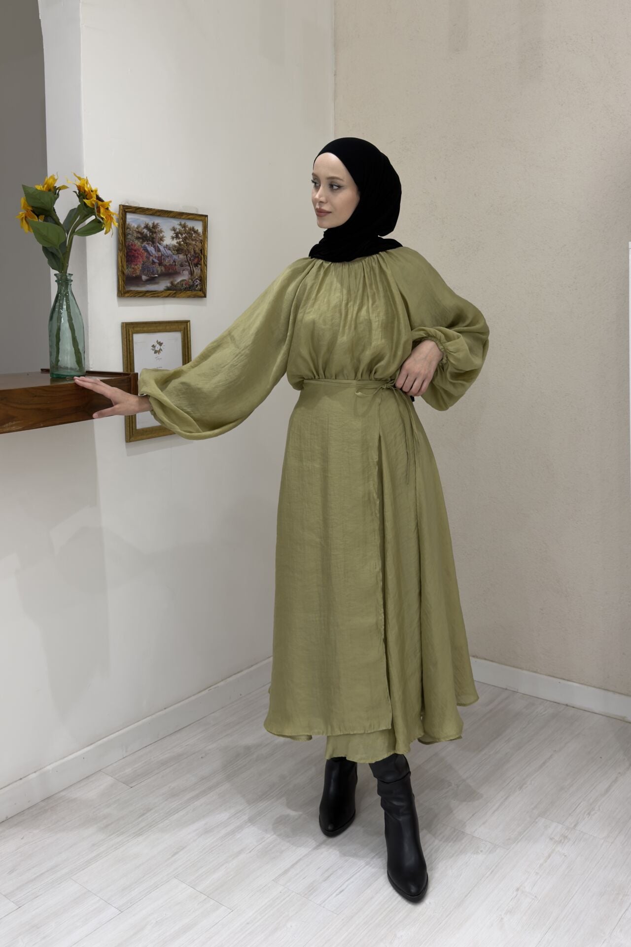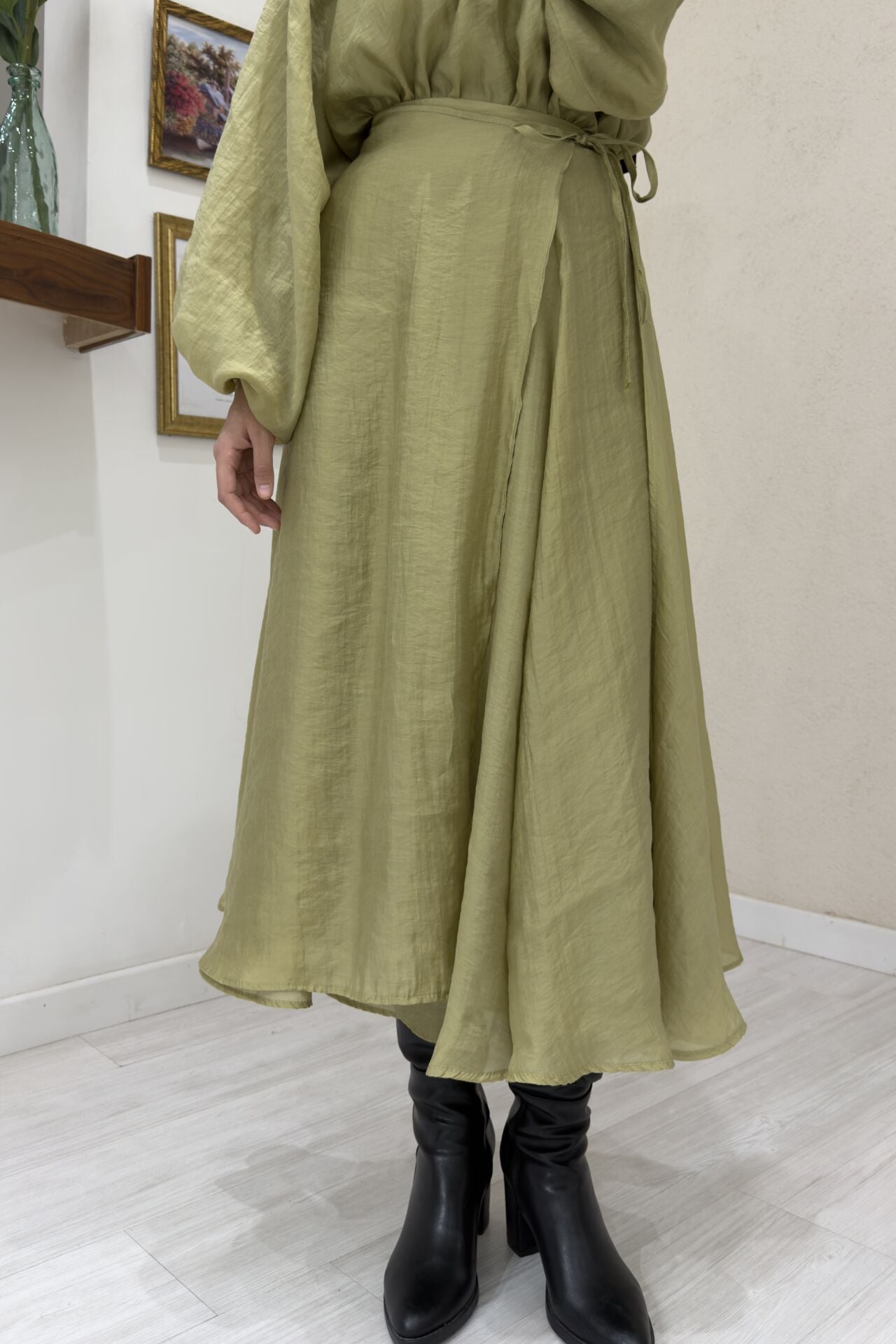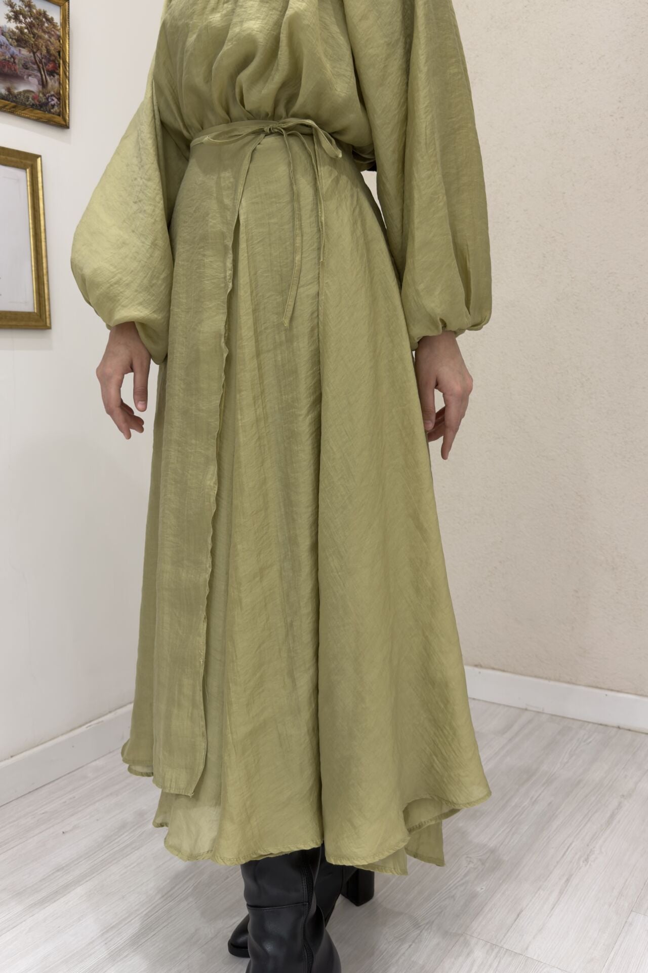 Dalgalı Şifon Kumaş Yağ Yeşili Balon Kol Takım