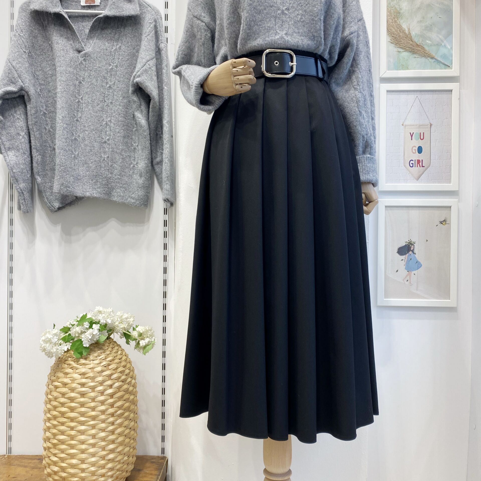 Deri Kemerli Siyah Lumiere Pileli Etek