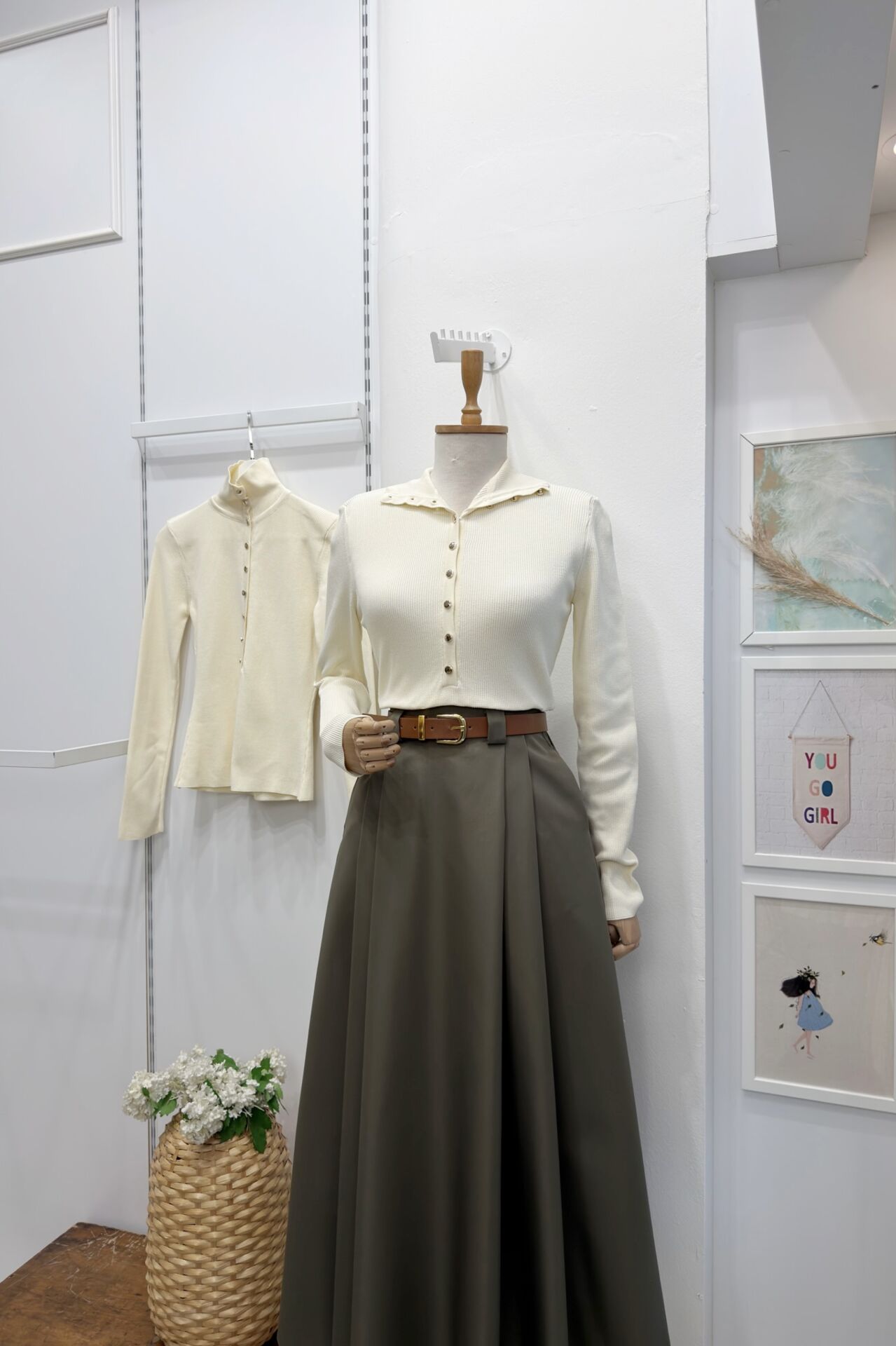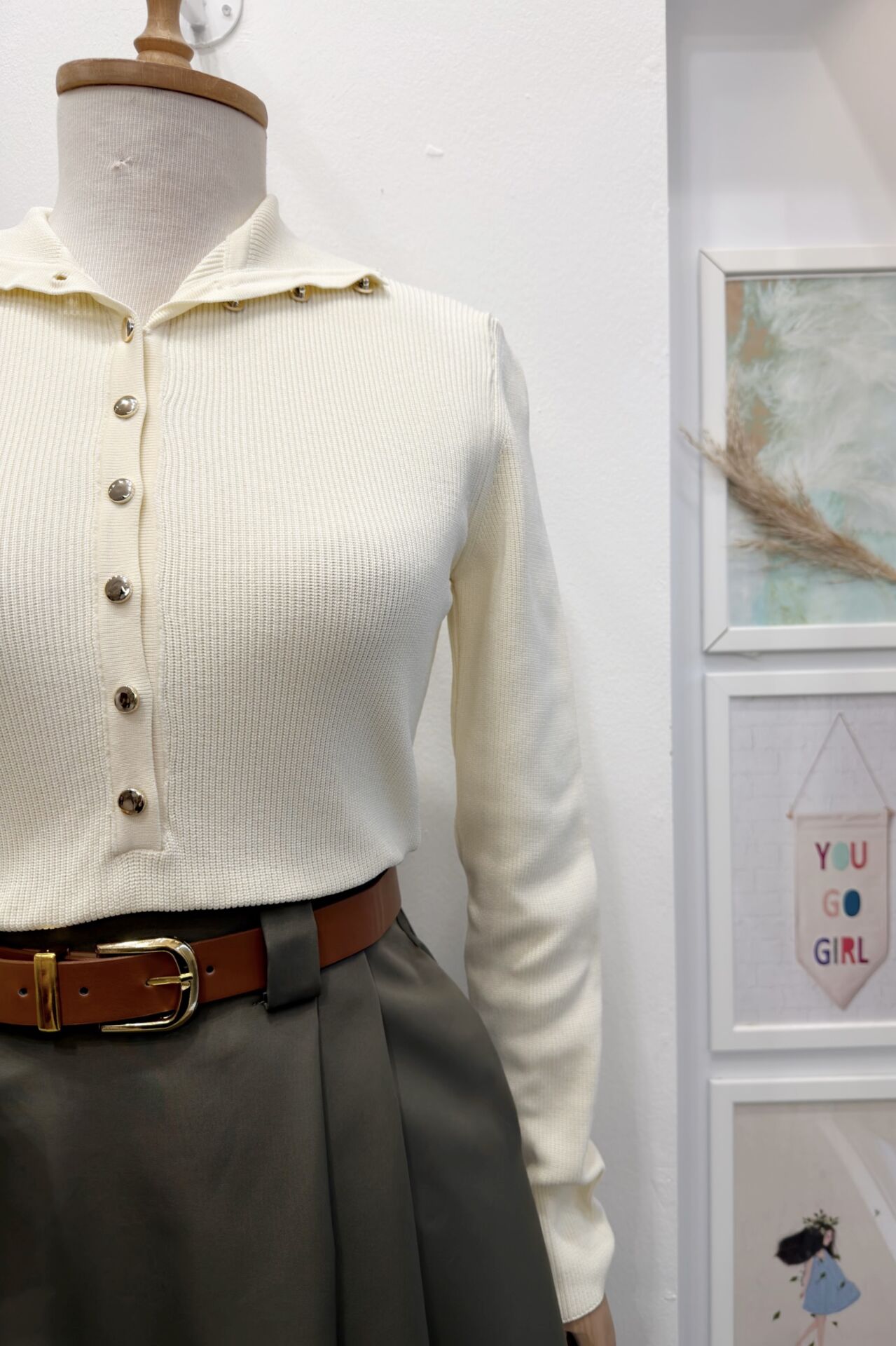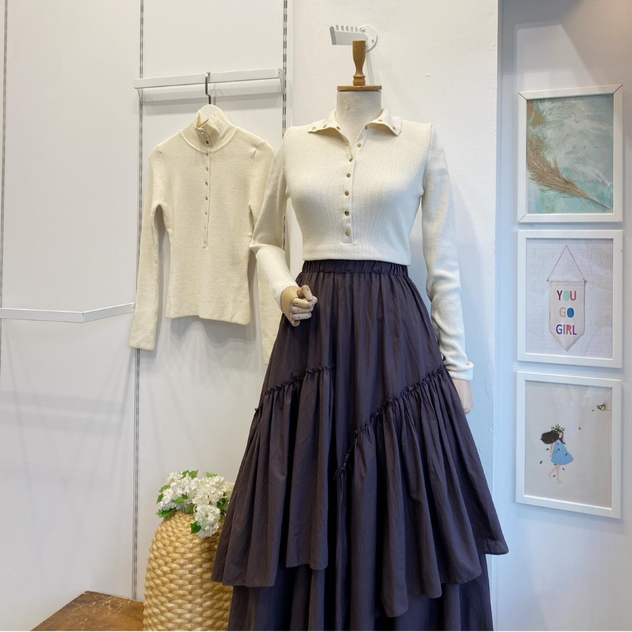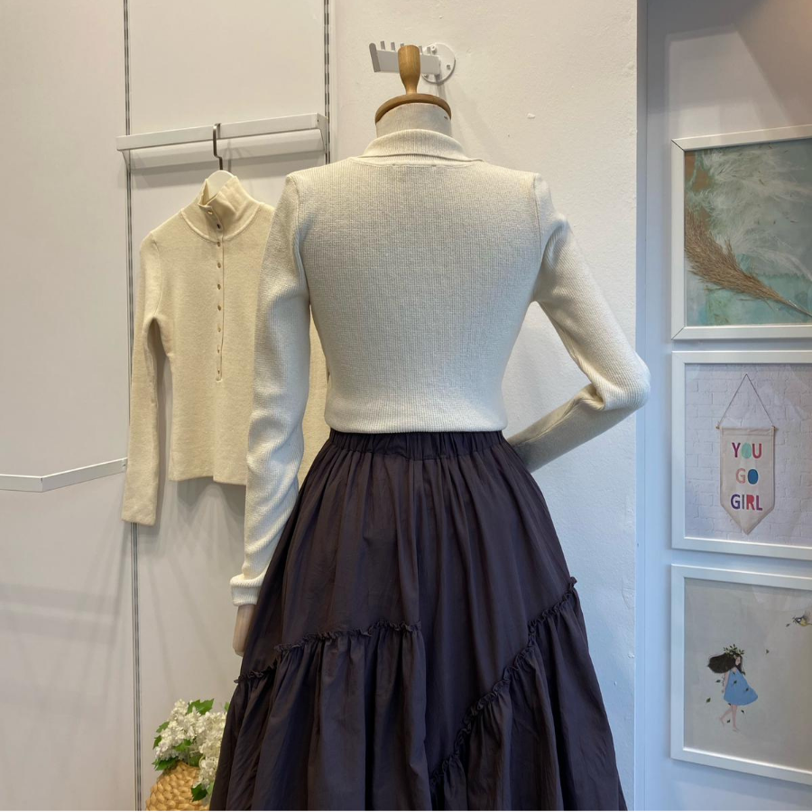 Ekru Dik Yaka Düğmeli Triko Bluz