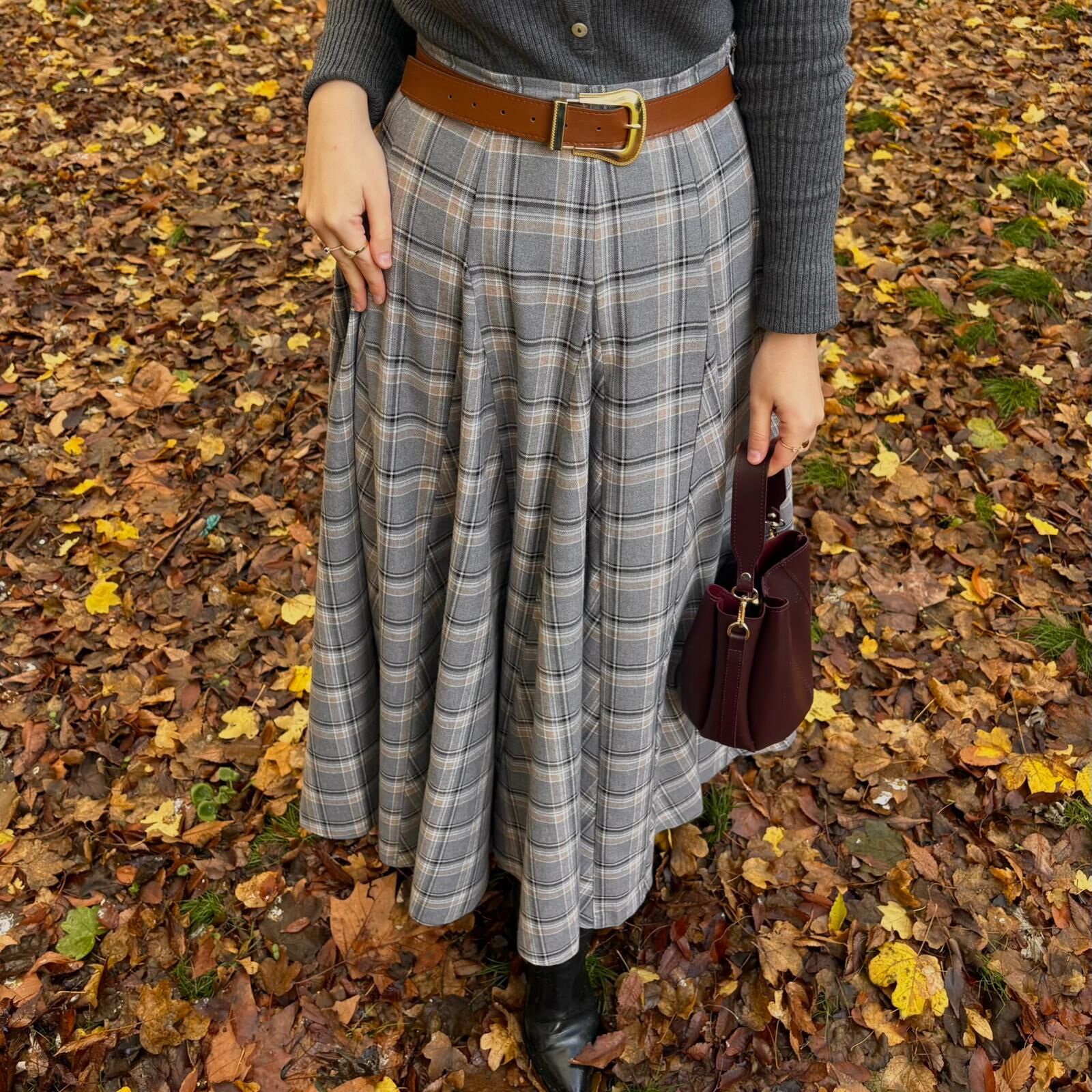 Faya Girls x Gri Deri Kemerli Ekoseli Grazia Etek