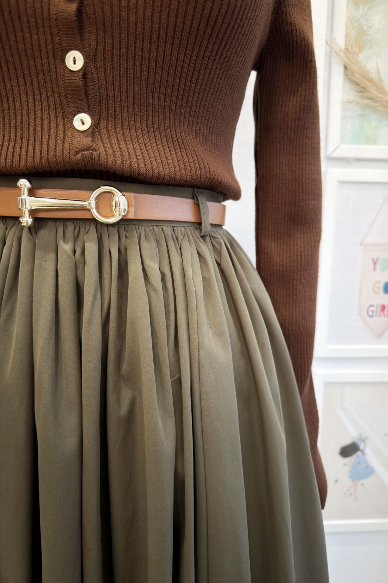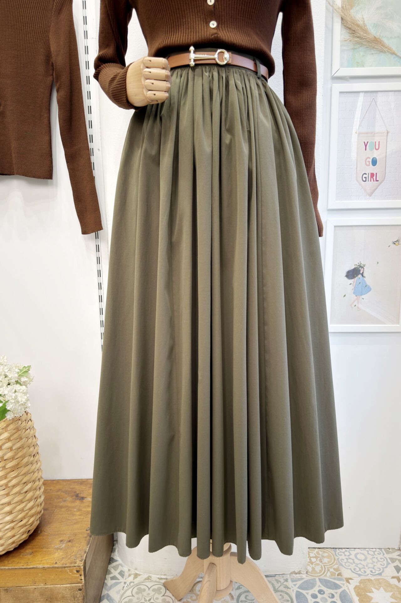 Haki Yeşili Kemerli Sık Pileli Etek