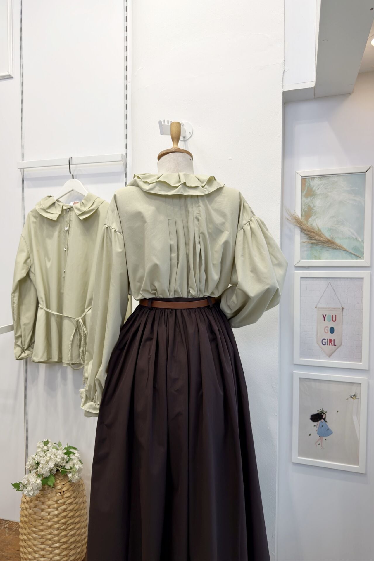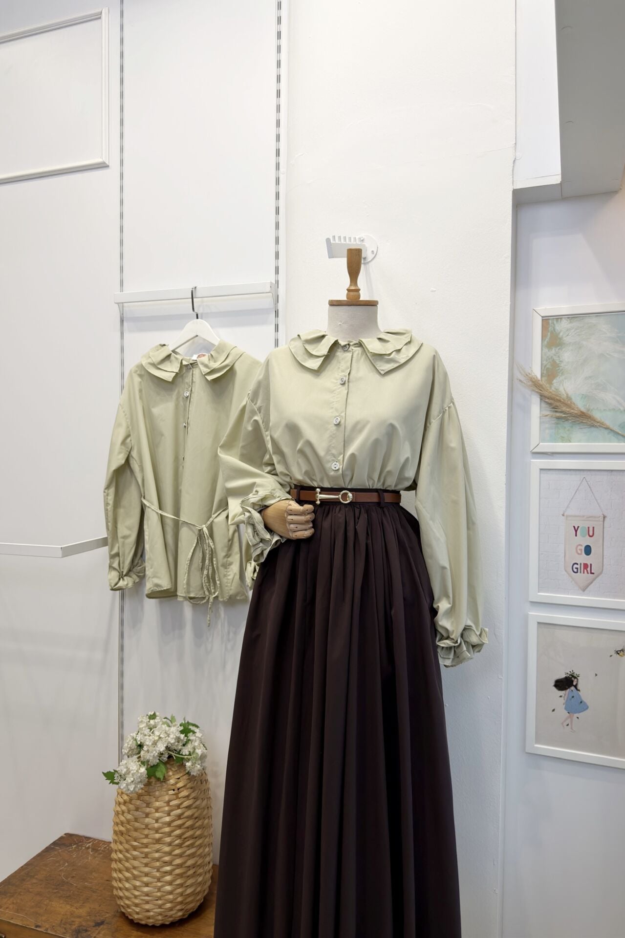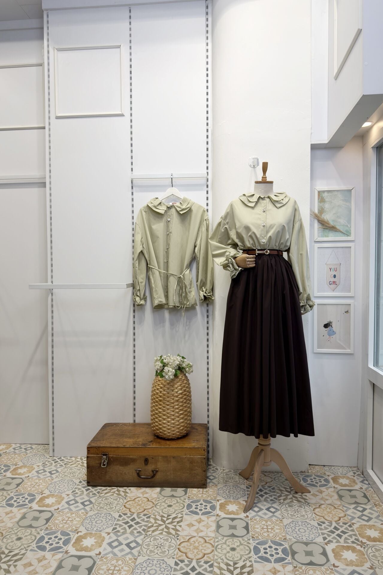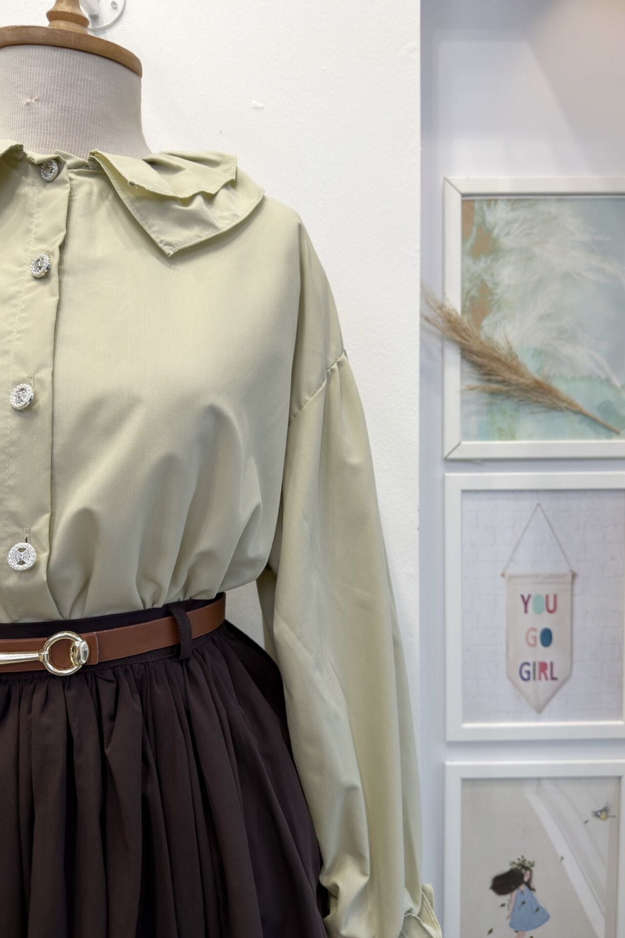İnci Düğmeli Yakası Fırfırlı Çağla Yeşili Tunik