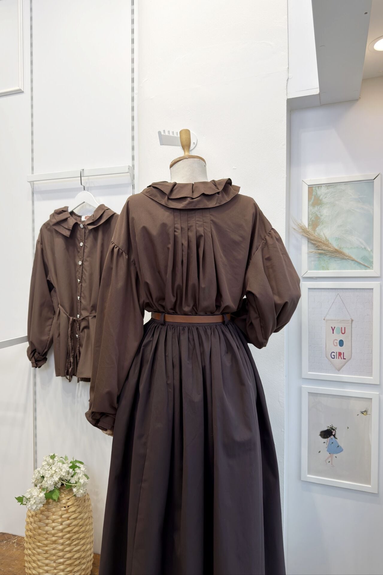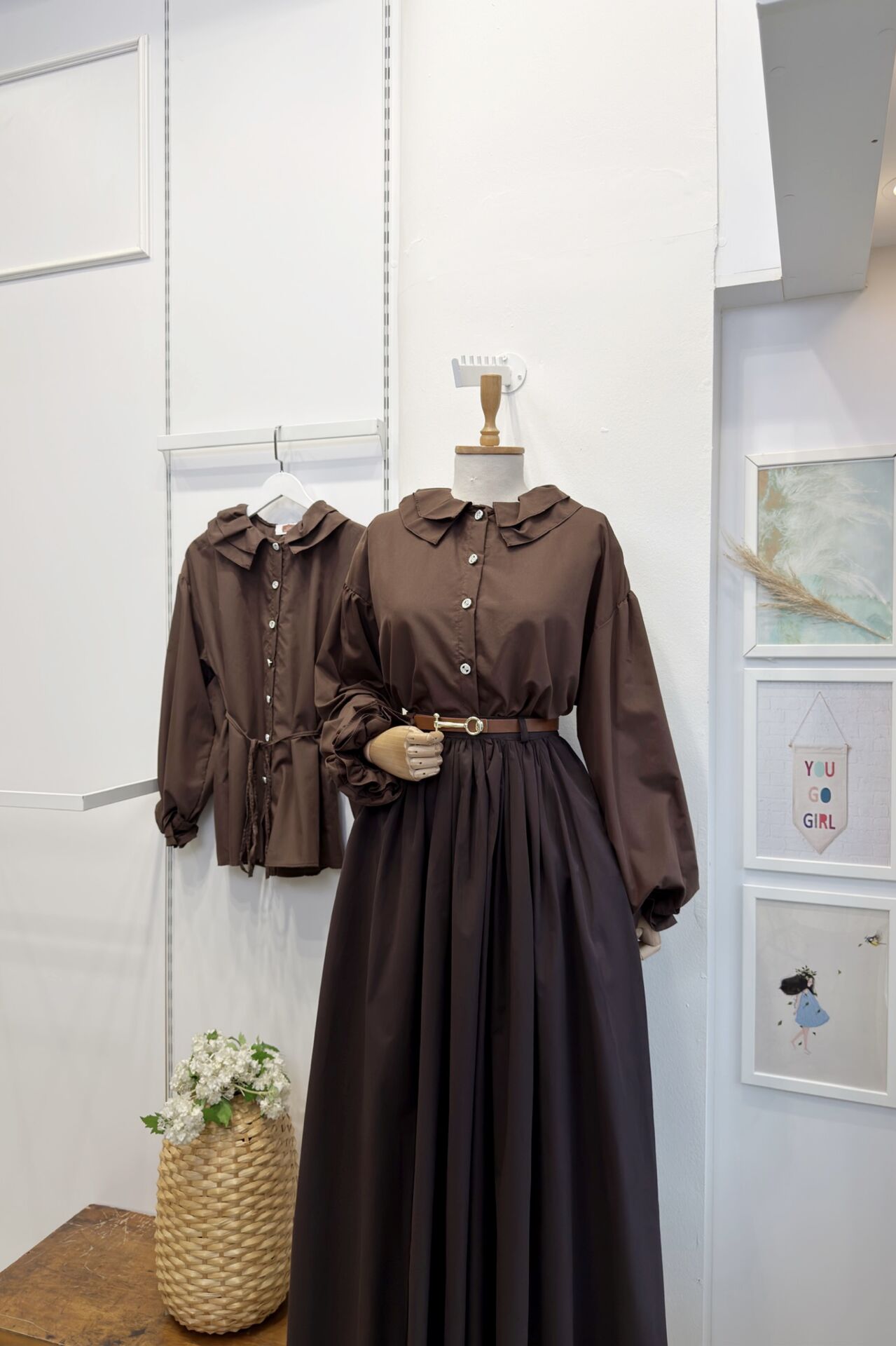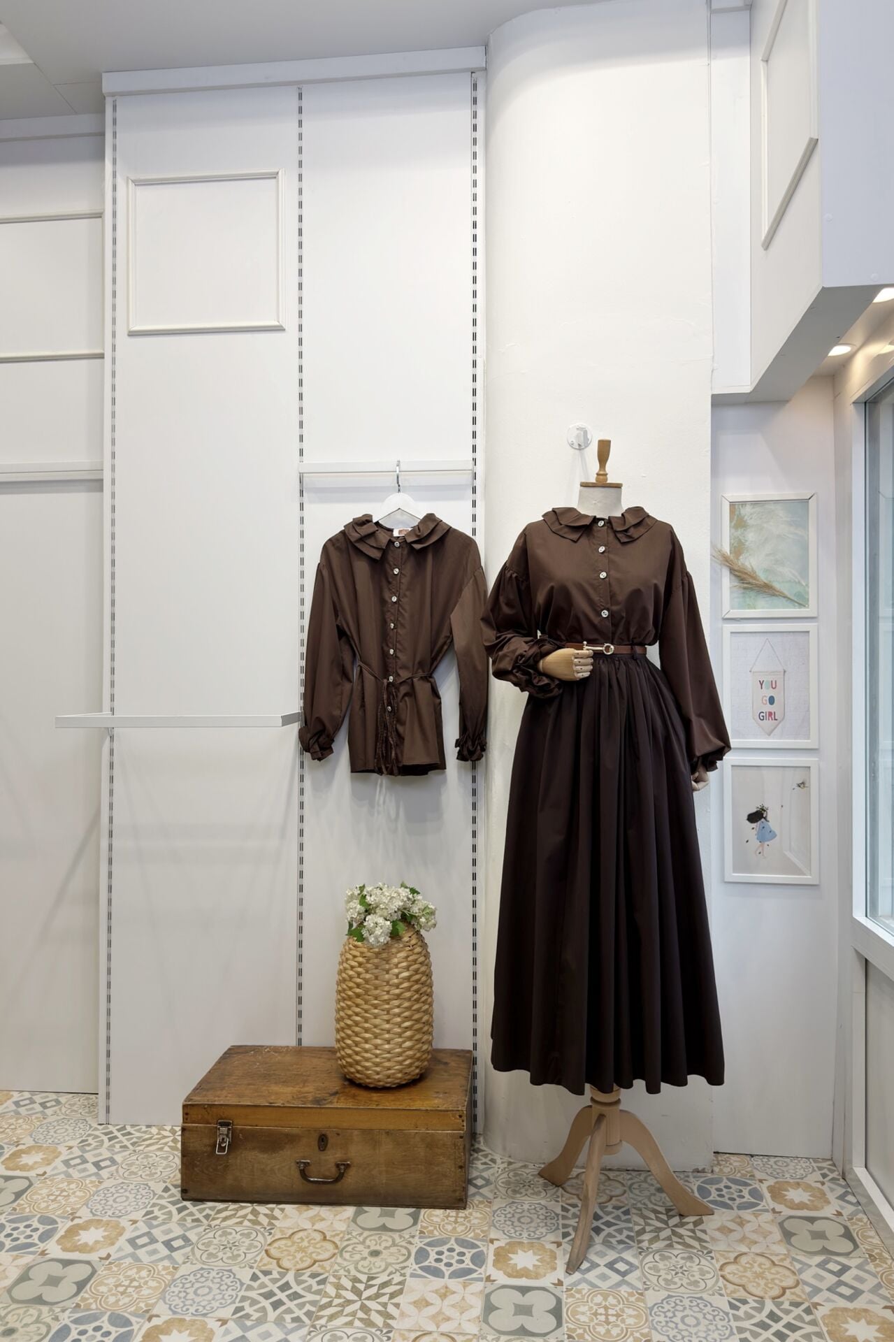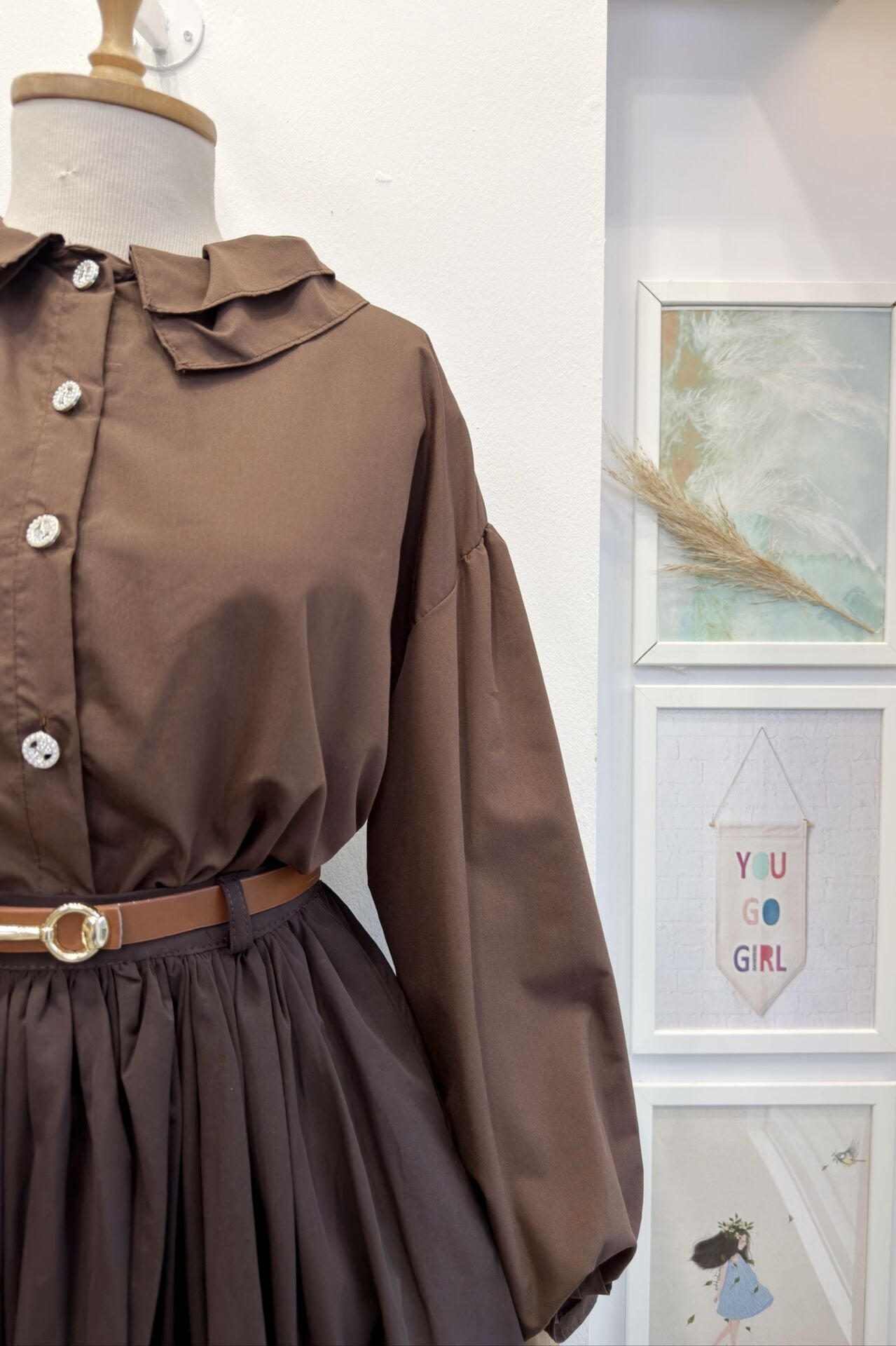 İnci Düğmeli Yakası Fırfırlı Kahverengi Tunik