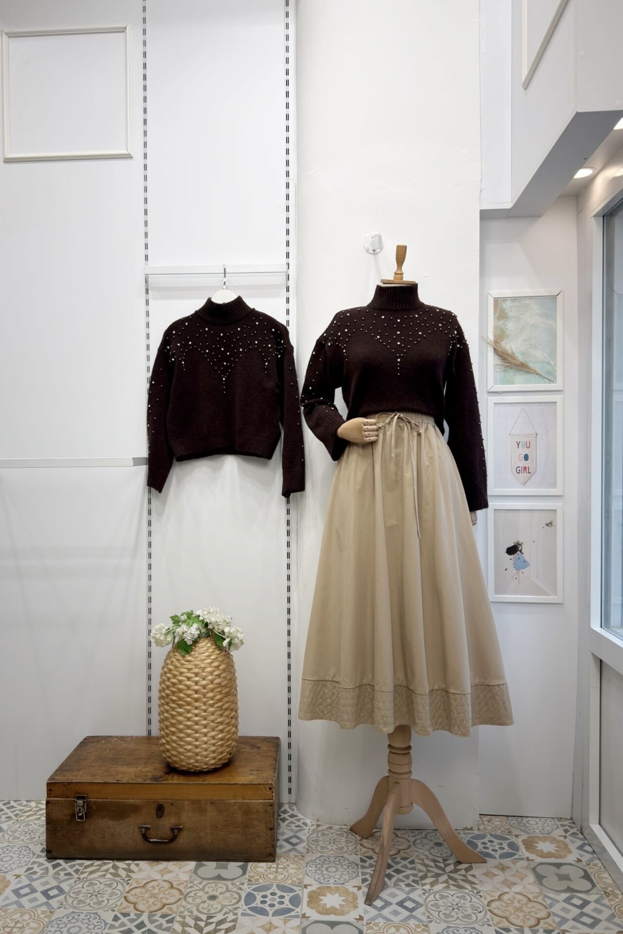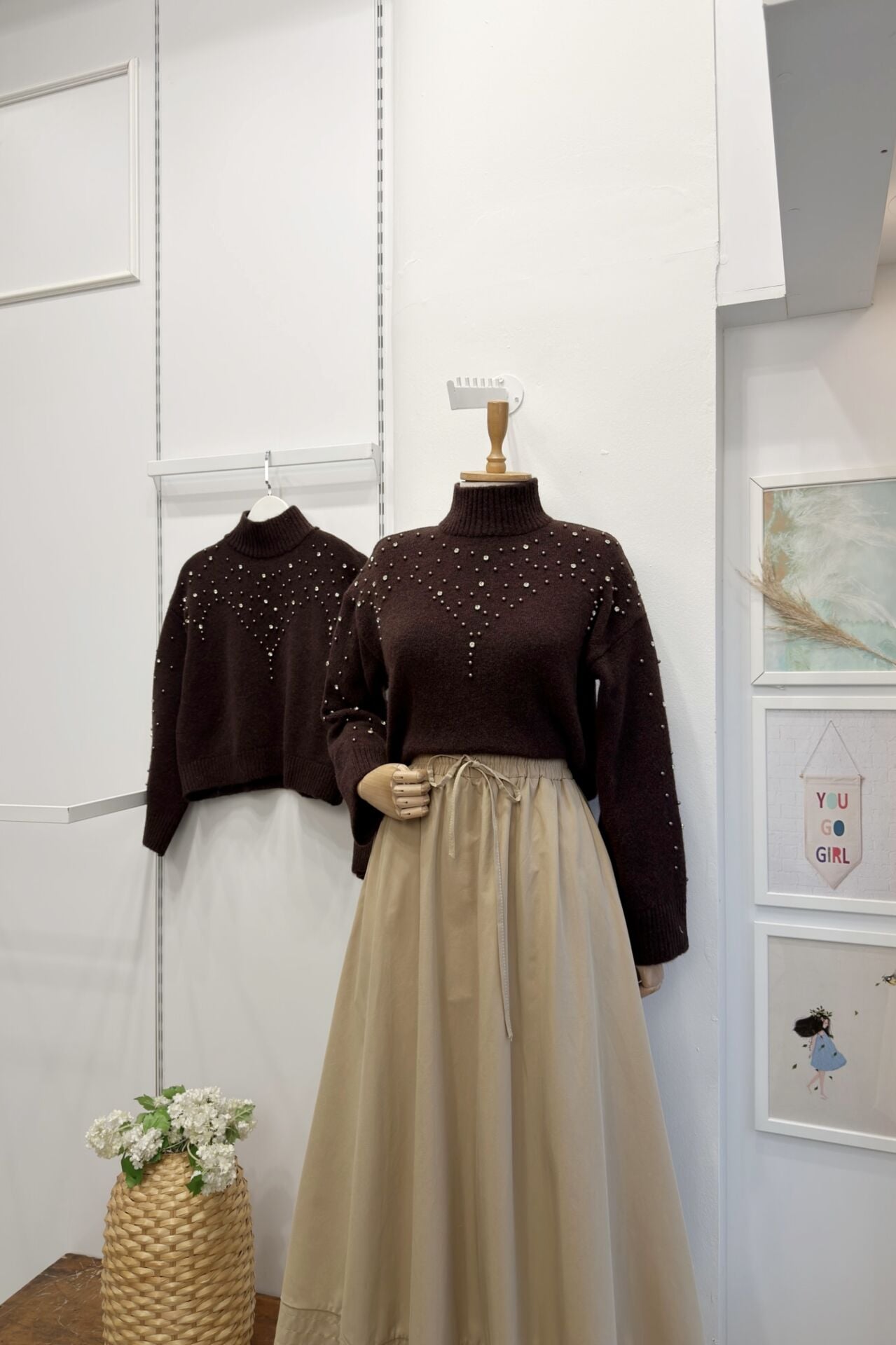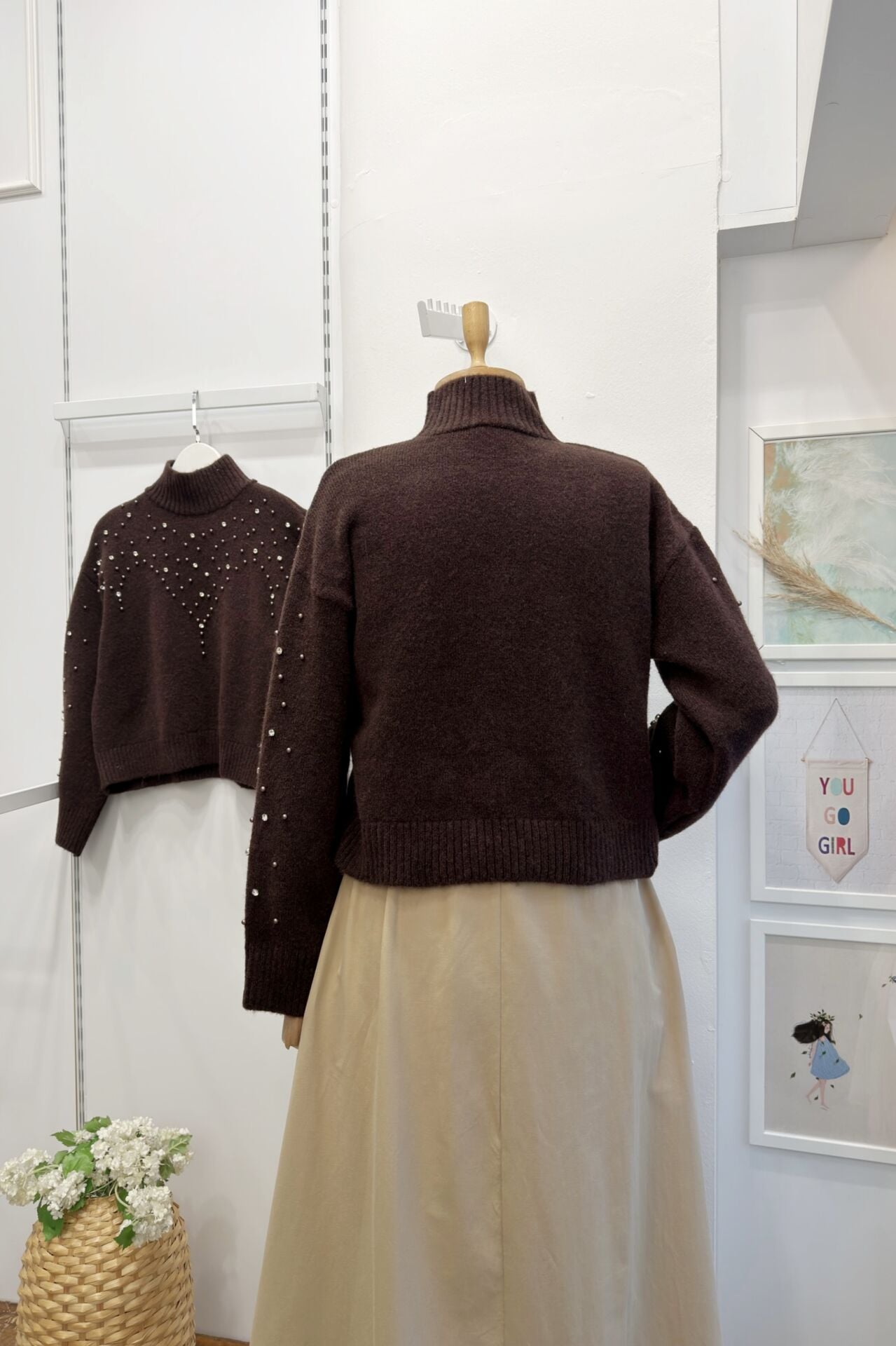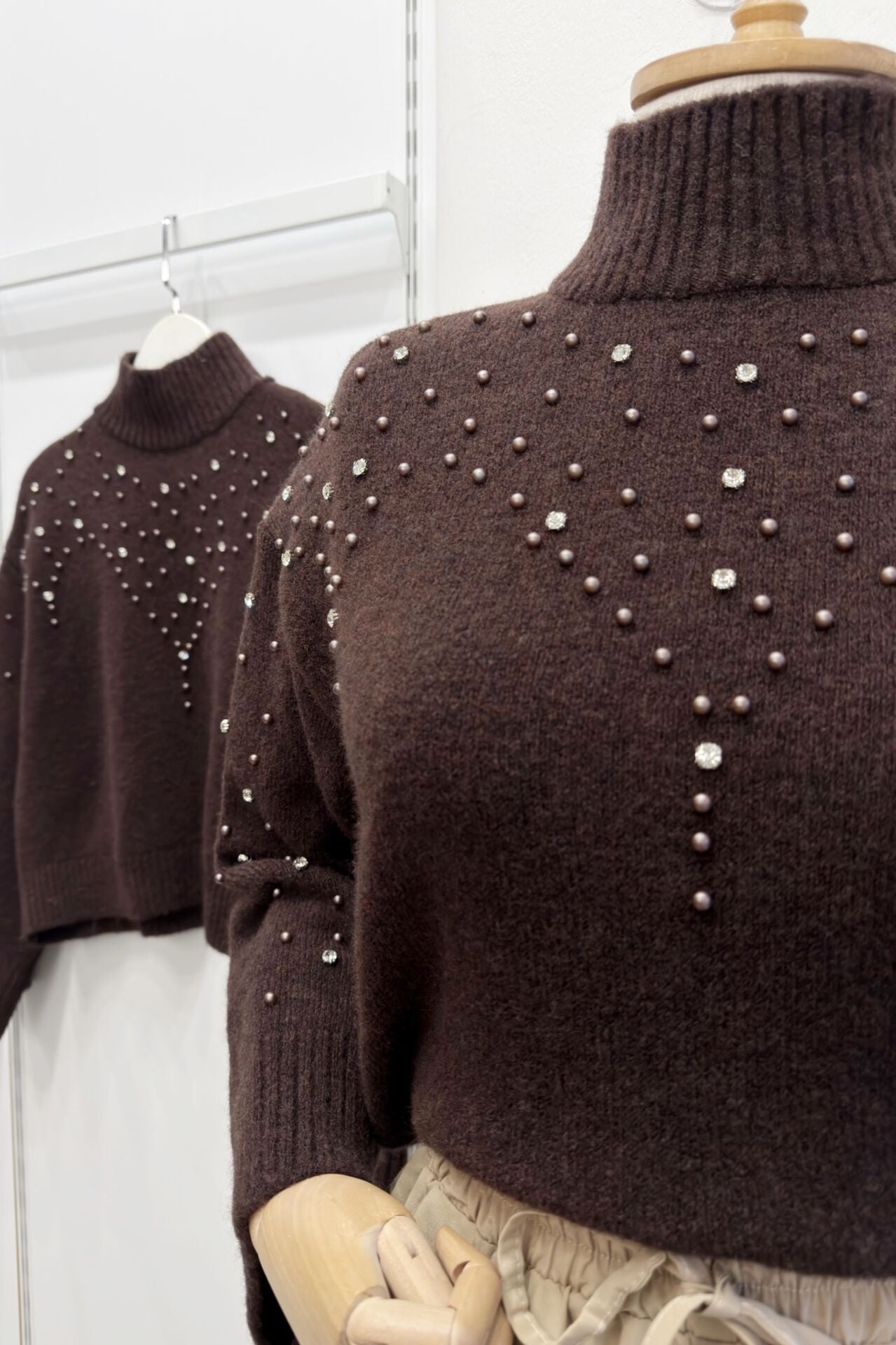 İnci İşlemeli Kahverengi Kazak