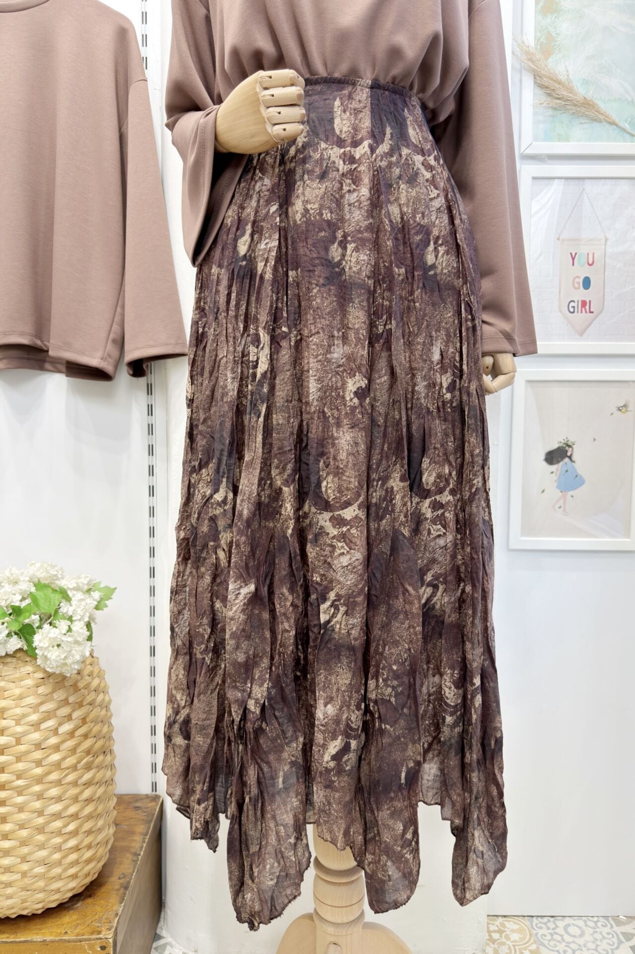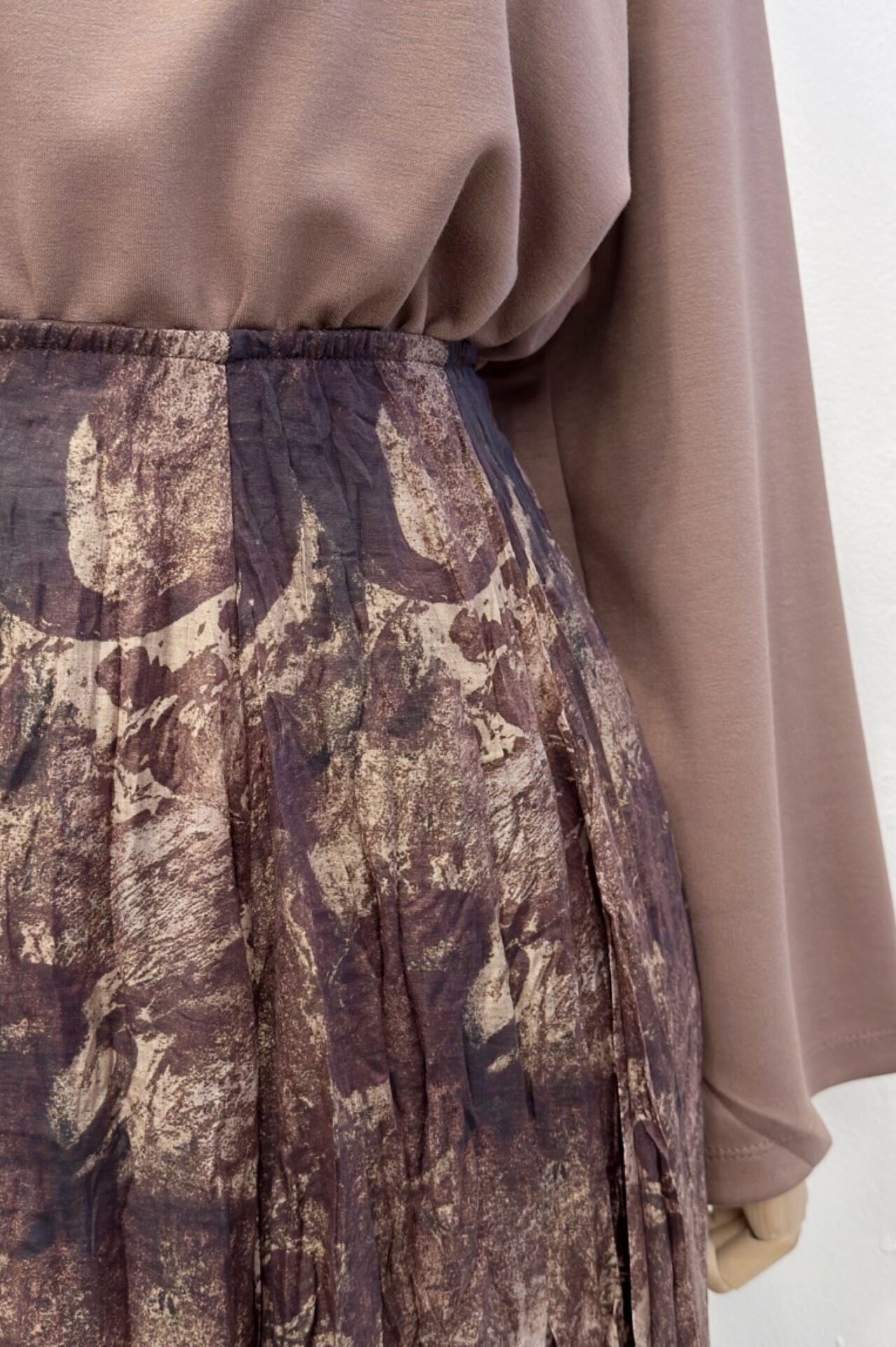 Kahverengi Ebruli Desenli Asimetrik Şifon Etek