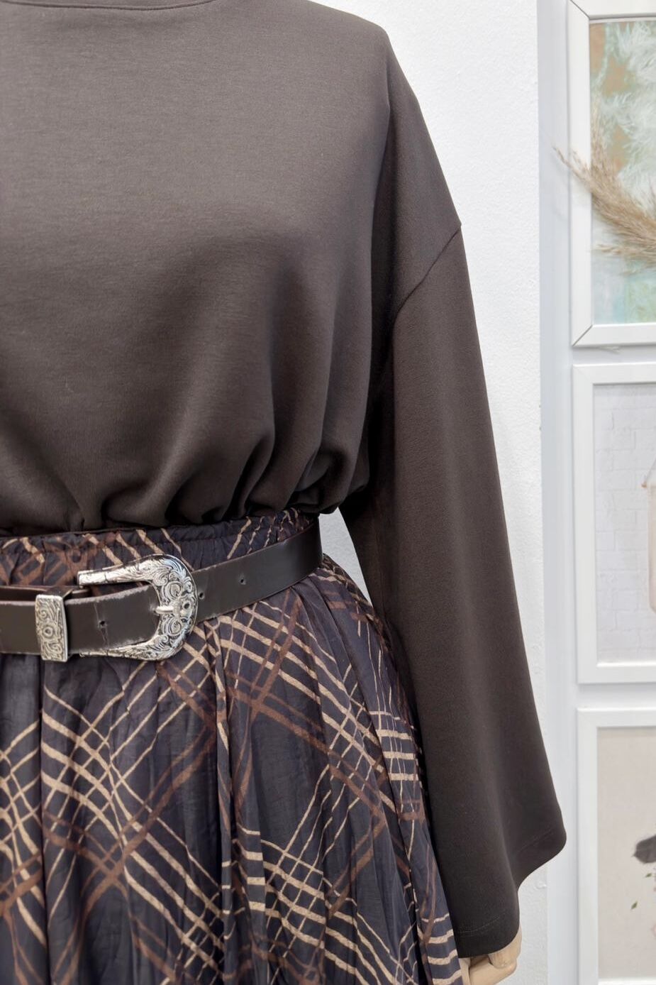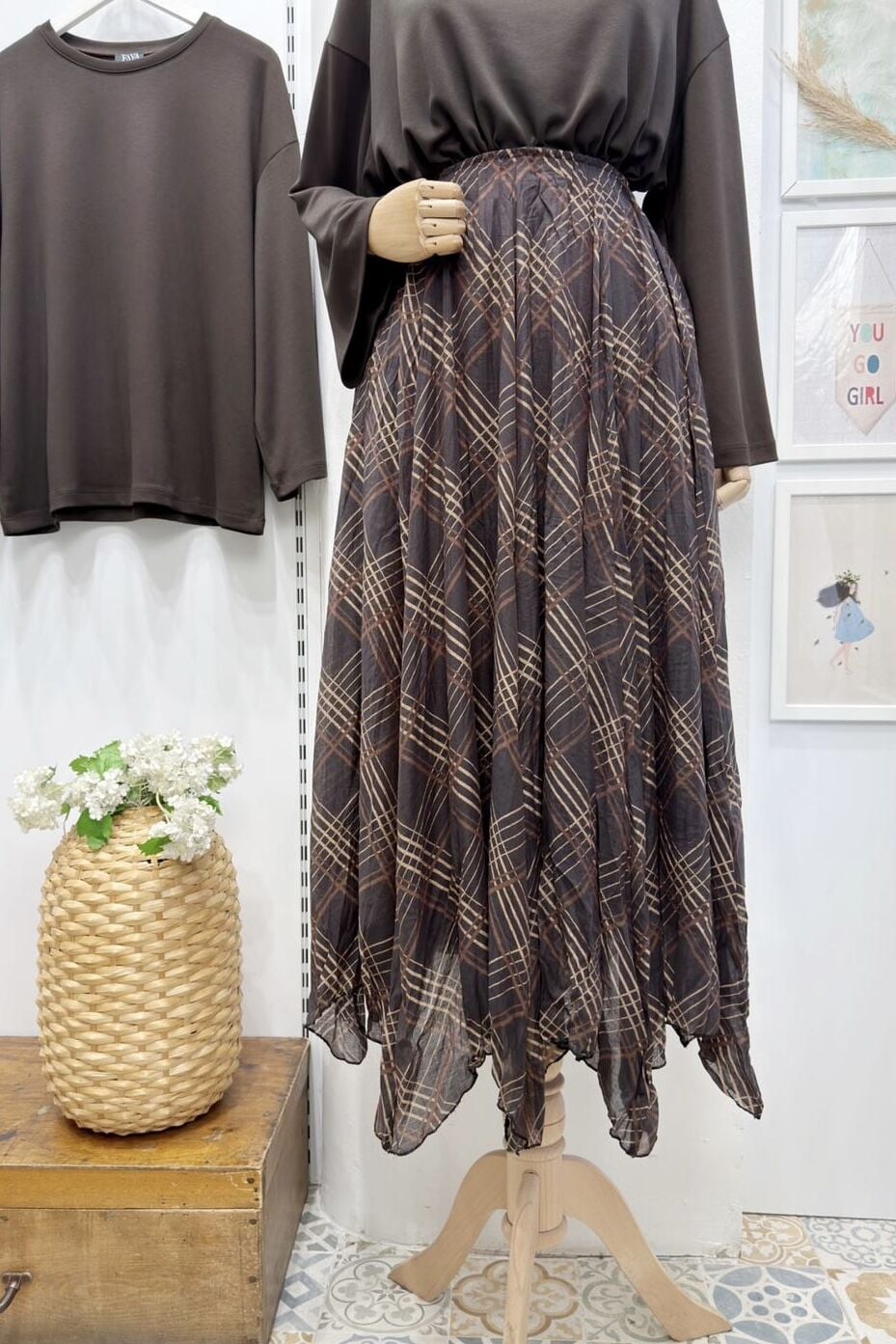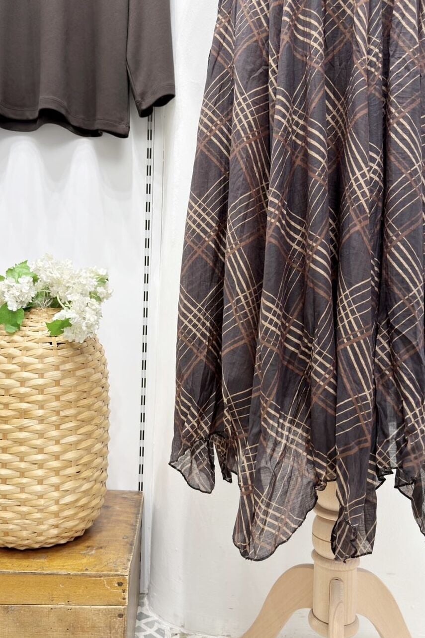 Kahverengi Ekose Desenli Asimetrik Şifon Etek