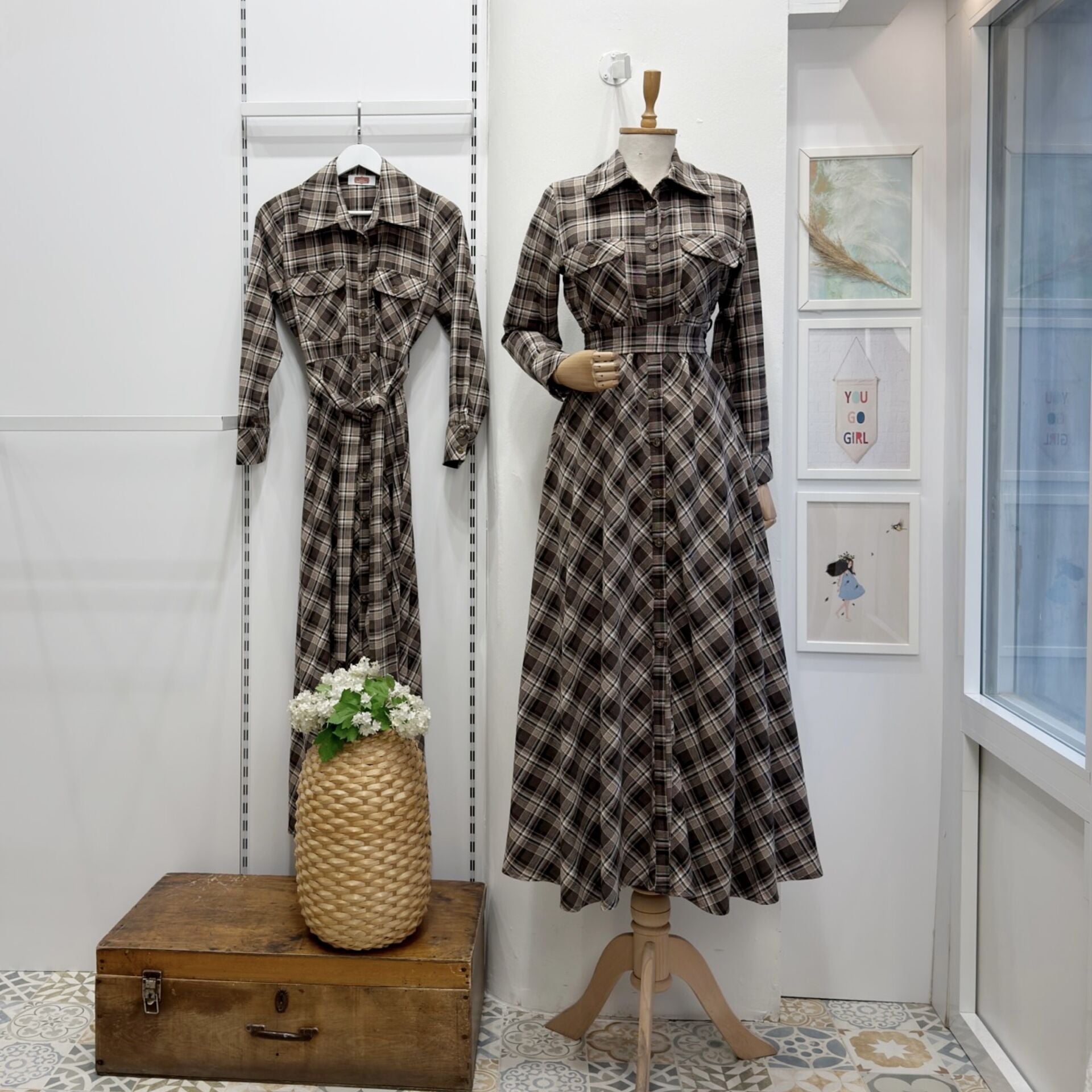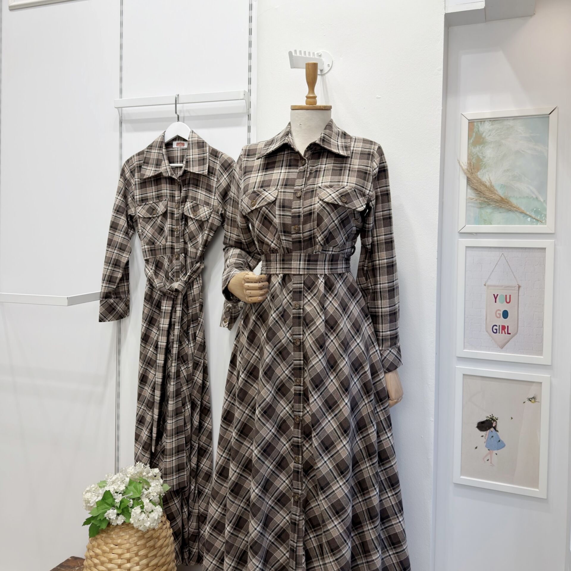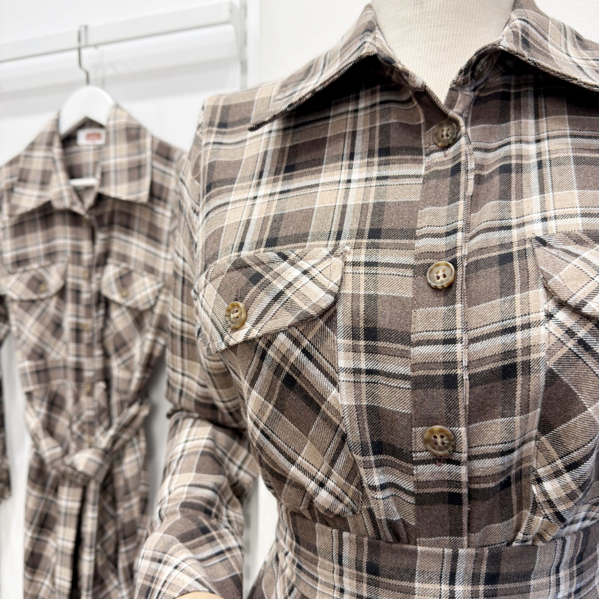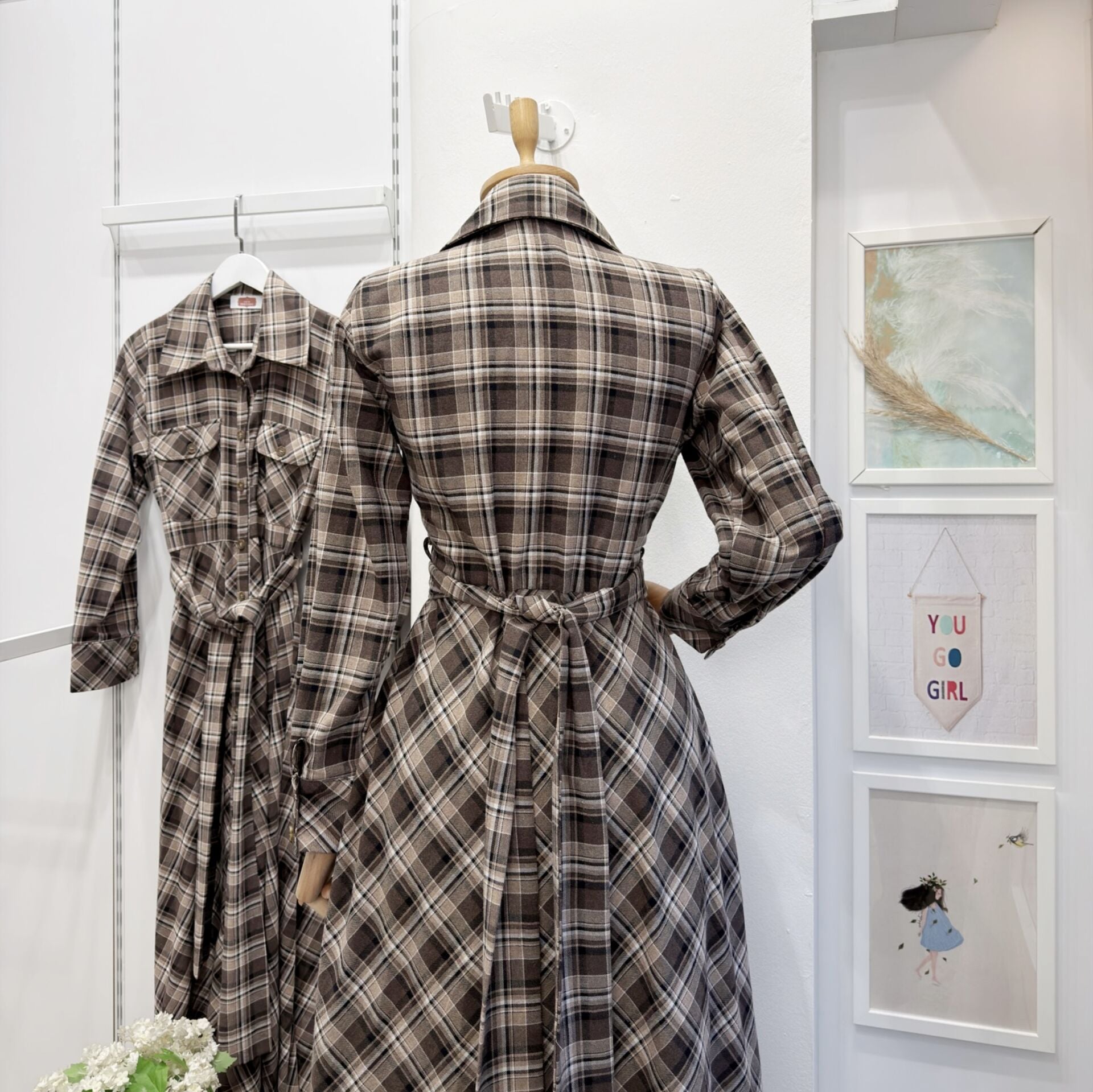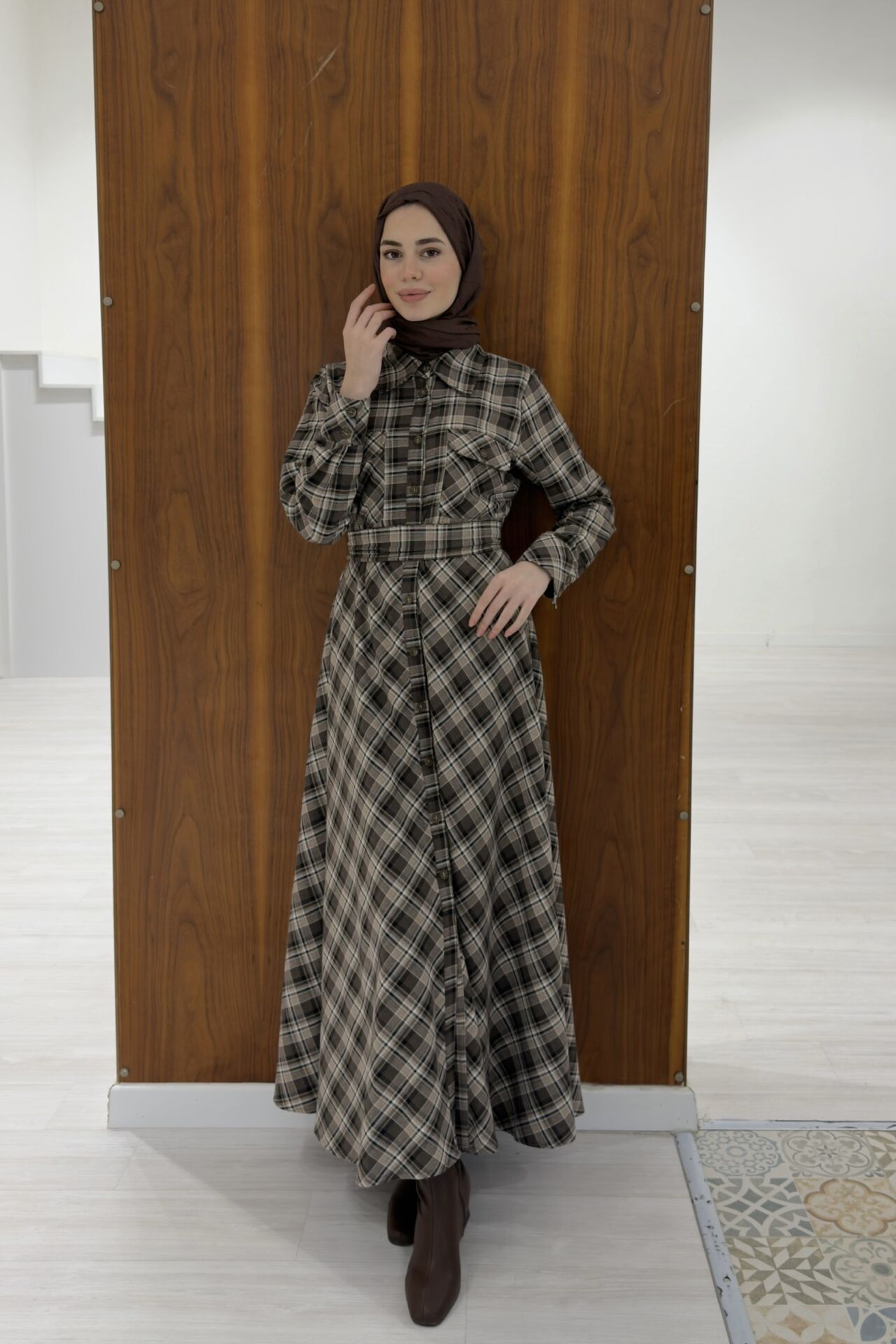 Kahverengi Ekose Desenli Kuşak Detaylı Elbise
