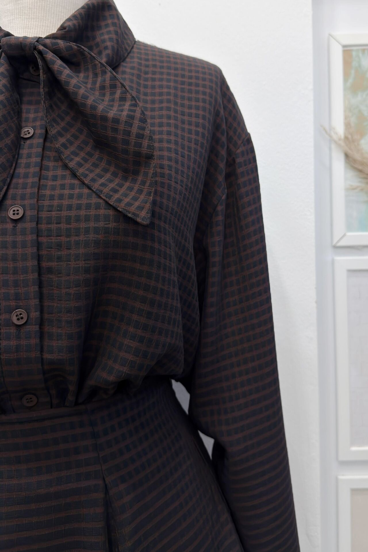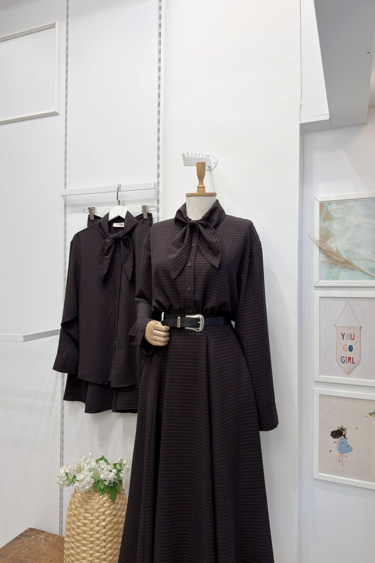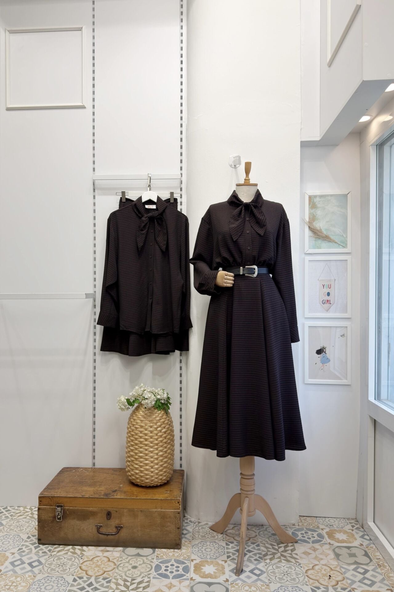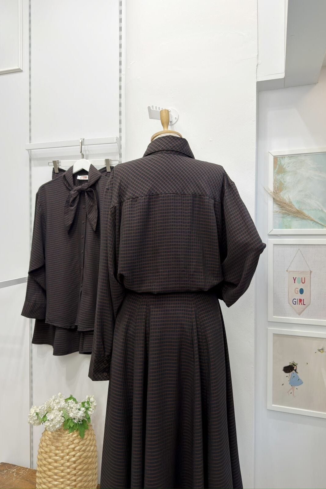 Kahverengi Fular Yaka Detaylı Pötikareli Rowen Takım