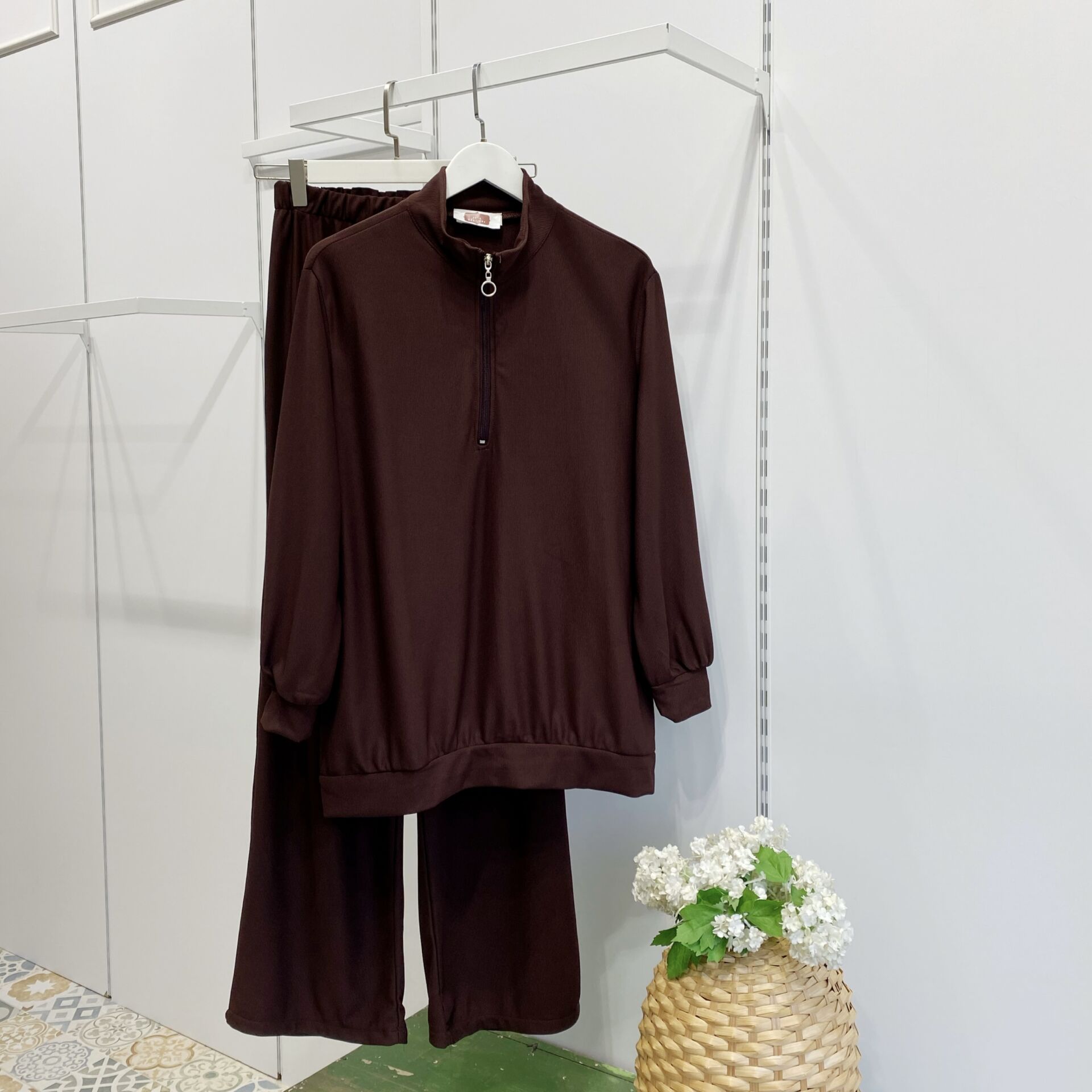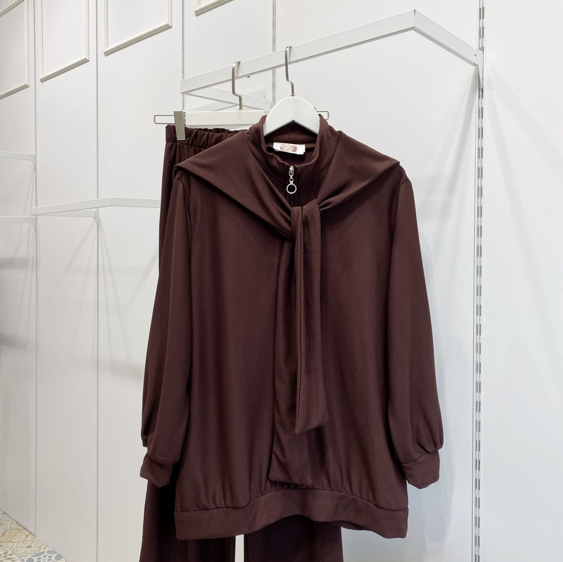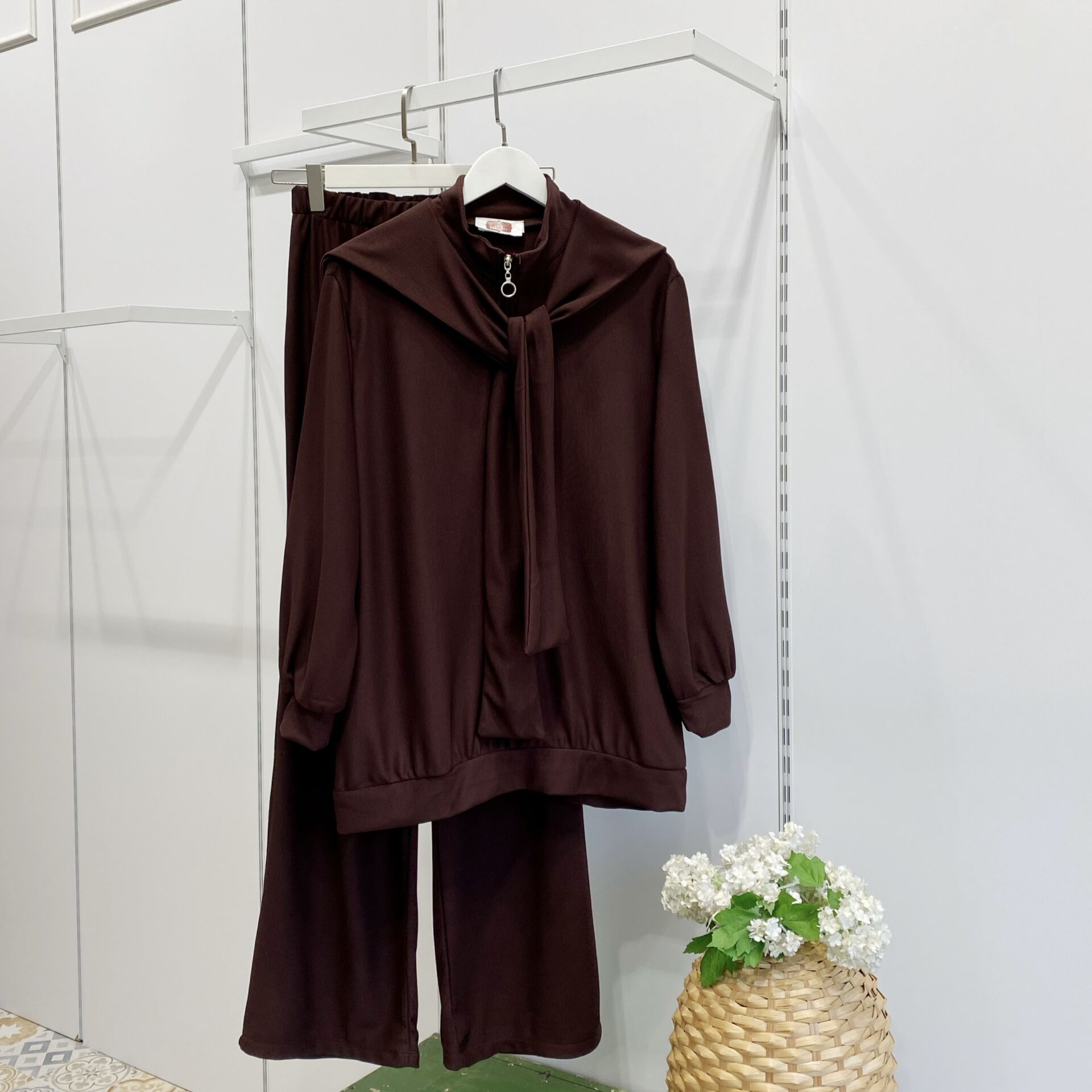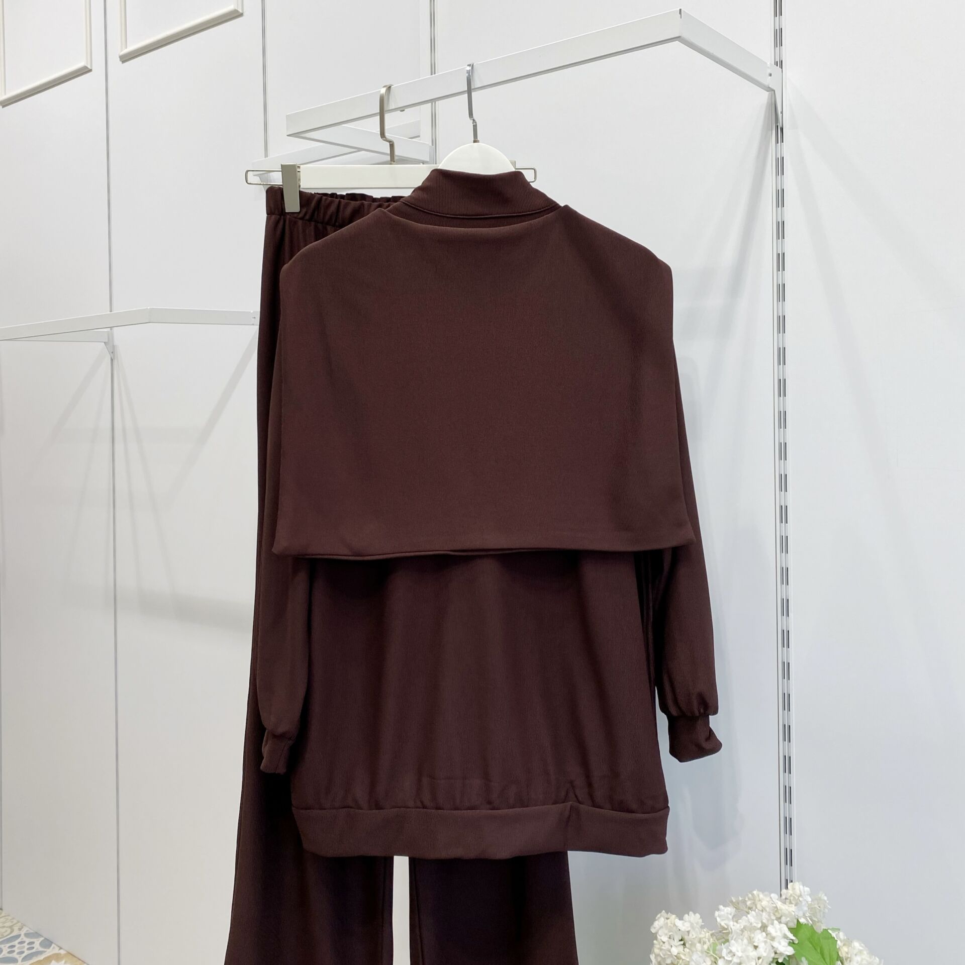 Kahverengi Pelerin Detaylı Pantolon Takım