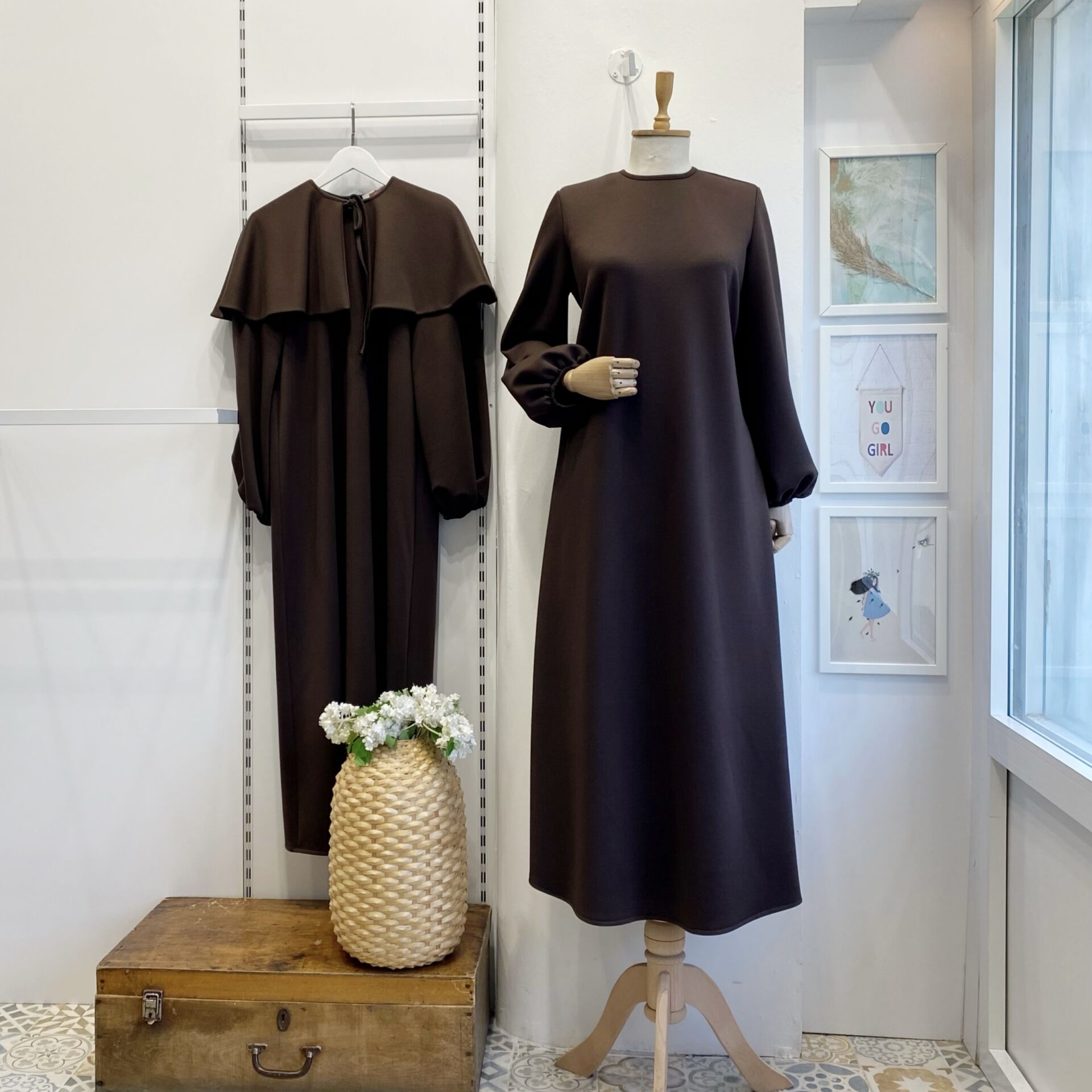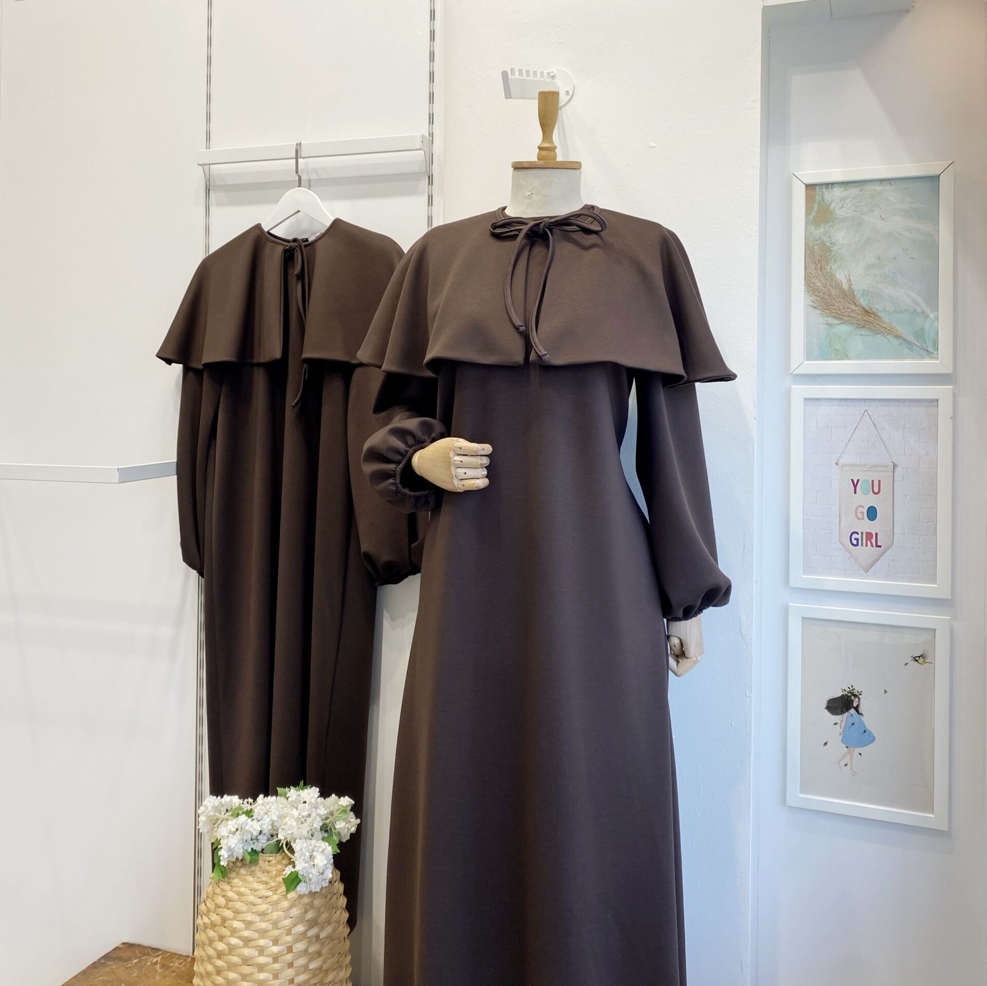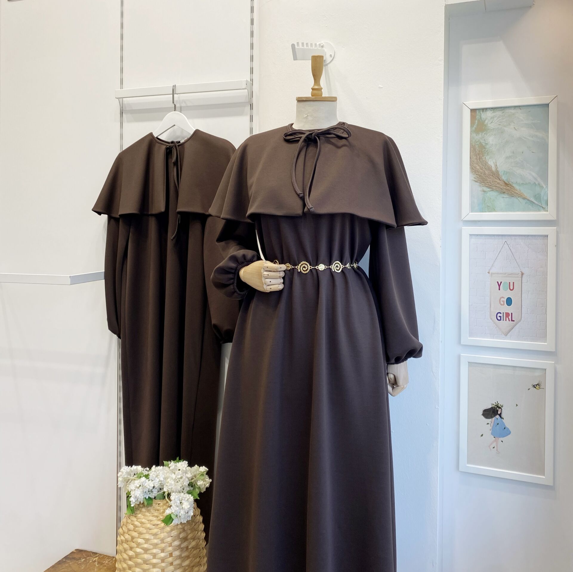 Kahverengi Pelerin Eklemeli Osyho Kumaş Elbise